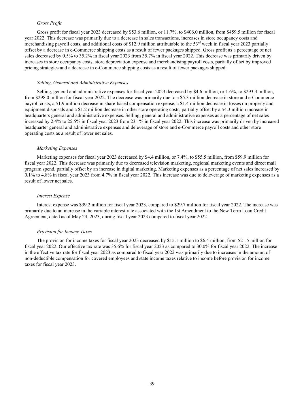 毛利润2023财年毛利润从2022财年的4.595亿美元减少5360万美元,或11.7%,至4.060亿美元。这一减少主要是由于销售交易减少、商店占用成本和商品工资成本增加,以及2023财年第53周产生的1290万美元额外成本,部分被电子商务运输成本的下降所抵消,原因是运送的包裹减少。毛利润占净销售额的百分比从2022财年的35.7%下降0.5%至2023财年的35.2%。这一下降主要是由于商店占用成本、商店折旧费用和商品销售工资成本的增加,但部分被改进的定价策略和电子商务运输成本的下降所抵消,因为运送的包裹减少。销售、一般和行政费用2023财年的销售、一般和行政费用从2022财年的2.98亿美元减少460万美元,或1.6%,至2.933亿美元。减少的主要原因是,商店和电子商务工资成本减少530万美元,股权报酬费用减少190万美元,财产和设备处置损失减少140万美元,其他商店运营成本减少120万美元,但被总部一般和行政费用增加430万美元部分抵消。销售、一般和管理费用占净销售额的百分比从2022财年的23.1%增长2.4%至2023财年的25.5%。这一增长主要是由于净销售额下降导致总部一般和管理费用增加,以及商店和电子商务工资成本和其他商店运营成本的去杠杆化。营销费用2023财年的营销费用从2022财年的5990万美元下降440万美元,降幅为7.4%,至5550万美元。这一减少主要是由于电视营销、区域营销活动和直邮节目支出减少,部分被数字营销的增加所抵消。营销费用占净销售额的百分比从2022财年的4.7%增长0.1%至2023财年的4.8%。这一增长是由于净销售额下降导致营销费用去杠杆化。利息支出2023财年的利息支出为3920万美元,而2022财年的利息支出为2970万美元。增加的主要原因是与2022财年相比,2023财年期间与截至2023年5月24日的新定期贷款信贷协议第1修正案相关的浮动利率增加。所得税拨备2023财年的所得税拨备从2022财年的2150万美元减少1510万美元至640万美元。2023财年我们的有效税率为35.6%,而2022财年为30.0%。与2022财年相比,2023财年的有效税率有所增加,这主要是由于与2023财年所得税拨备前收入相比,涵盖员工的不可扣除补偿金额和州所得税金额有所增加。39