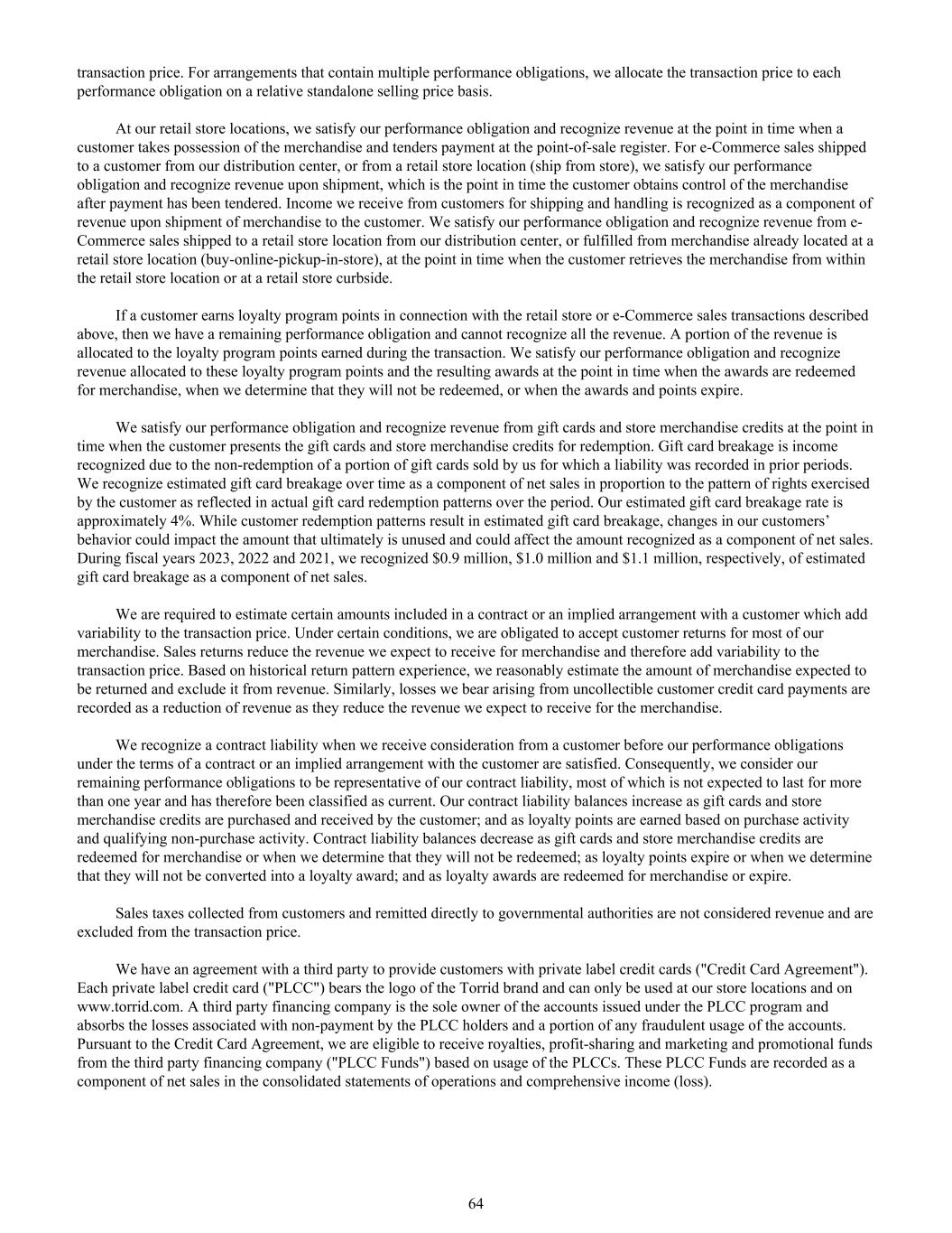 交易价格。对于包含多个履约义务的安排,我们将交易价格按相对独立售价基准分配给每个履约义务。在我们的零售店地点,我们履行我们的履约义务,并在客户占有商品并在销售点登记处投标付款的时间点确认收入。对于从我们的配送中心发货给客户的电子商务销售,或从零售店位置发货(从商店发货),我们履行我们的履约义务并在发货时确认收入,这是客户在付款投标后获得商品控制权的时间点。我们从客户收到的用于运输和搬运的收入在向客户运送商品时确认为收入的组成部分。我们履行我们的履约义务,并在客户从零售店位置内或零售店路边取回商品的时间点,确认从我们的配送中心运至零售店位置的电子商务销售收入,或从已经位于零售店位置的商品(在线购买-店内提货)中履行的收入。如果客户赚取与上述零售店或电子商务销售交易相关的忠诚度计划积分,那么我们有剩余的履约义务,无法确认所有收入。收入的一部分分配给交易期间赚取的忠诚度计划积分。我们履行我们的履约义务,并在奖励兑换商品、我们确定不会兑换或奖励和积分到期的时间点确认分配给这些忠诚度计划积分和由此产生的奖励的收入。我们履行我们的履约义务,并在客户出示礼品卡和商店商品积分进行兑换的时间点确认来自礼品卡和商店商品积分的收入。礼品卡破损是由于我们出售的部分礼品卡未赎回而确认的收入,该部分在前期记录了负债。我们将随时间推移的估计礼品卡破损确认为净销售额的组成部分,这与客户在该期间实际礼品卡兑换模式中所反映的权利行使模式成比例。我们估计礼品卡破损率约为4%。虽然客户赎回模式会导致估计的礼品卡断裂,但我们客户行为的变化可能会影响最终未使用的金额,并可能影响确认为净销售额组成部分的金额。在2023、2022和2021财年,我们分别确认了0.9百万美元、1.0百万美元和1.1百万美元的估计礼品卡破损,作为净销售额的组成部分。我们被要求估计合同或与客户的隐含安排中包含的某些金额,这些金额会增加交易价格的可变性。在特定条件下,我们有义务接受客户对我们大部分商品的退货。销售退货减少了我们预期的商品收入,因此增加了交易价格的可变性。根据历史退货模式经验,我们合理估计预计退货的商品金额,并将其从收入中剔除。同样,我们因无法收回的客户信用卡付款而承担的损失被记录为收入的减少,因为它们减少了我们预期从商品中获得的收入。当我们在根据合同条款或与客户的默示安排履行义务之前收到客户的对价时,我们确认合同负债。因此,我们认为我们剩余的履约义务代表了我们的合同责任, 其中大部分预计不会持续超过一年,因此被归类为当前。我们的合同负债余额随着客户购买和收到礼品卡和商店商品积分而增加;并且由于根据购买活动和符合条件的非购买活动赚取忠诚度积分。随着礼品卡和商店商品积分被兑换成商品或当我们确定它们不会被兑换时;随着忠诚积分到期或当我们确定它们不会被转换成忠诚奖励时;以及随着忠诚奖励被兑换成商品或到期,合同负债余额会减少。向客户收取并直接汇给政府当局的销售税不被视为收入,不计入交易价格。我们与第三方达成协议,向客户提供自有品牌信用卡(“信用卡协议”)。每张自有品牌信用卡(“PLCC”)都带有Torrid品牌的标识,只能在我们的门店位置和www.torrid.com上使用。第三方融资公司是根据PLCC计划发行的账户的唯一所有者,并承担与PLCC持有人未付款相关的损失以及账户的任何欺诈性使用的一部分。根据信用卡协议,我们有资格根据PLCC的使用情况从第三方融资公司(“PLCC基金”)获得特许权使用费、利润分享以及营销和促销资金。这些PLCC基金在综合经营和综合收益(亏损)报表中作为净销售额的组成部分入账。64