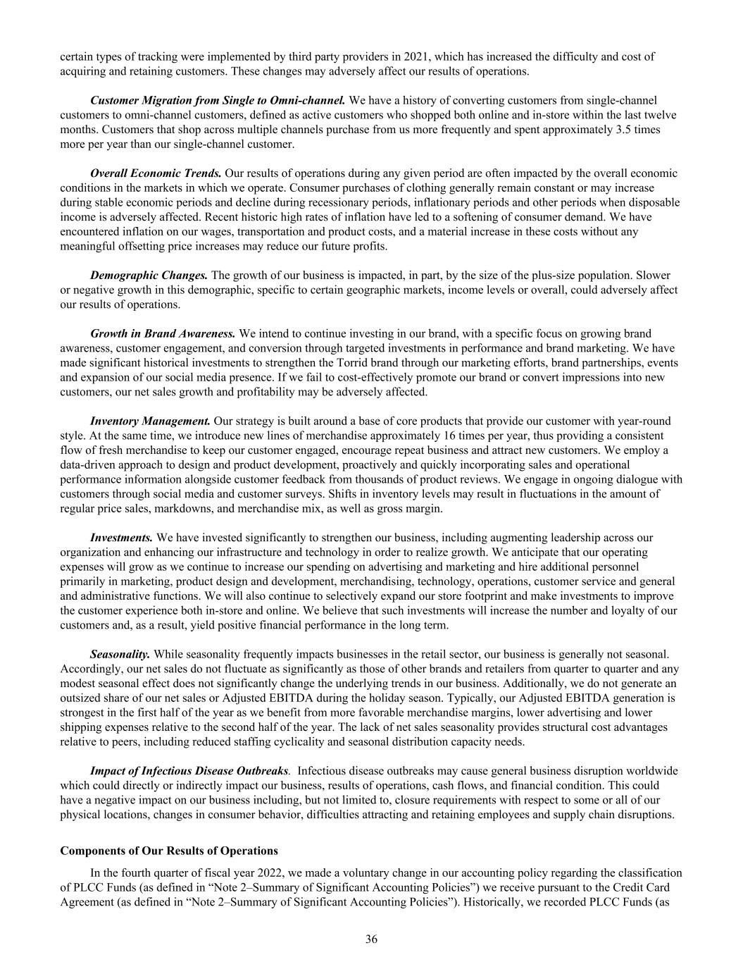 某些类型的跟踪在2021年由第三方提供商实施,增加了获取和留住客户的难度和成本。这些变化可能会对我们的经营业绩产生不利影响。客户从单一向全渠道迁移。我们有将客户从单一渠道客户转化为全渠道客户的历史,定义为在过去十二个月内同时在线上和店内购物的活跃客户。跨多个渠道购物的客户在我们这里购买的频率更高,每年花费大约是我们单一渠道客户的3.5倍。整体经济趋势。我们在任何特定时期的经营业绩往往受到我们经营所在市场的整体经济状况的影响。消费者对服装的购买量一般保持不变,或在经济稳定时期可能增加,在经济衰退期、通胀期和可支配收入受到不利影响的其他时期则下降。近期通胀率处于历史高位,导致消费者需求疲软。我们的工资、运输和产品成本都遇到了通货膨胀,在没有任何有意义的抵消价格上涨的情况下,这些成本的实质性增加可能会减少我们未来的利润。人口变化。我们业务的增长部分受到大码人口规模的影响。特定于某些地理市场、收入水平或总体而言,这一人口增长放缓或负增长可能会对我们的经营业绩产生不利影响。品牌知名度增长。我们打算继续对我们的品牌进行投资,特别关注通过对业绩和品牌营销进行有针对性的投资来提高品牌知名度、客户参与度和转化。我们进行了重大的历史投资,通过我们的营销努力、品牌合作伙伴关系、活动和扩大我们的社交媒体存在来加强Torrid品牌。如果我们未能以具有成本效益的方式推广我们的品牌或将印象转化为新客户,我们的净销售额增长和盈利能力可能会受到不利影响。库存管理。我们的战略是围绕为我们的客户提供全年风格的核心产品基础建立的。同时,我们每年大约16次引入新的商品线,从而提供持续的新鲜商品流,以保持我们的客户参与度,鼓励回头客并吸引新客户。我们采用数据驱动的方法进行设计和产品开发,主动、快速地结合销售和运营绩效信息以及来自数千条产品评论的客户反馈。我们通过社交媒体和客户调查与客户进行持续对话。库存水平的变化可能会导致正价销售金额、降价、商品组合以及毛利率的波动。投资。我们进行了大量投资以加强我们的业务,包括增强整个组织的领导能力以及增强我们的基础设施和技术,以实现增长。我们预计,随着我们继续增加广告和营销支出,并主要在营销、产品设计和开发、商品推销、技术、运营、客户服务以及一般和行政职能方面雇用更多人员,我们的运营费用将会增长。我们还将继续有选择地扩大我们的门店足迹,并进行投资以改善店内和线上的客户体验。我们相信,此类投资将增加我们客户的数量和忠诚度,从而在长期内产生积极的财务业绩。季节性。虽然季节性经常影响零售行业的业务,但我们的业务通常不是季节性的。因此,我们的净销售额不会像其他品牌和零售商的净销售额那样在每个季度之间大幅波动,任何适度的季节性影响都不会显着改变我们业务的基本趋势。此外,我们在假日季节的净销售额或调整后EBITDA中没有产生过大的份额。通常情况下,我们的调整后EBITDA生成在上半年最强劲,因为我们受益于相对于下半年更有利的商品利润率、更低的广告和更低的运输费用。相对于同行,缺乏净销售季节性提供了结构性成本优势,包括减少了人员配置周期性和季节性分销能力需求。传染病爆发的影响。传染病的爆发可能会在全球范围内造成普遍的业务中断,这可能会直接或间接影响我们的业务、经营业绩、现金流和财务状况。这可能会对我们的业务产生负面影响,包括但不限于, 关于我们部分或全部实体场所的关闭要求、消费者行为的变化、吸引和留住员工的困难以及供应链中断。2022财年第四季度经营业绩的组成部分,我们根据信用卡协议(定义见“附注2 –重要会计政策摘要”)收到的关于PLCC基金分类(定义见“附注2 –重要会计政策摘要”)的会计政策进行了自愿变更。历史上,我们记录了PLCC基金(作为36