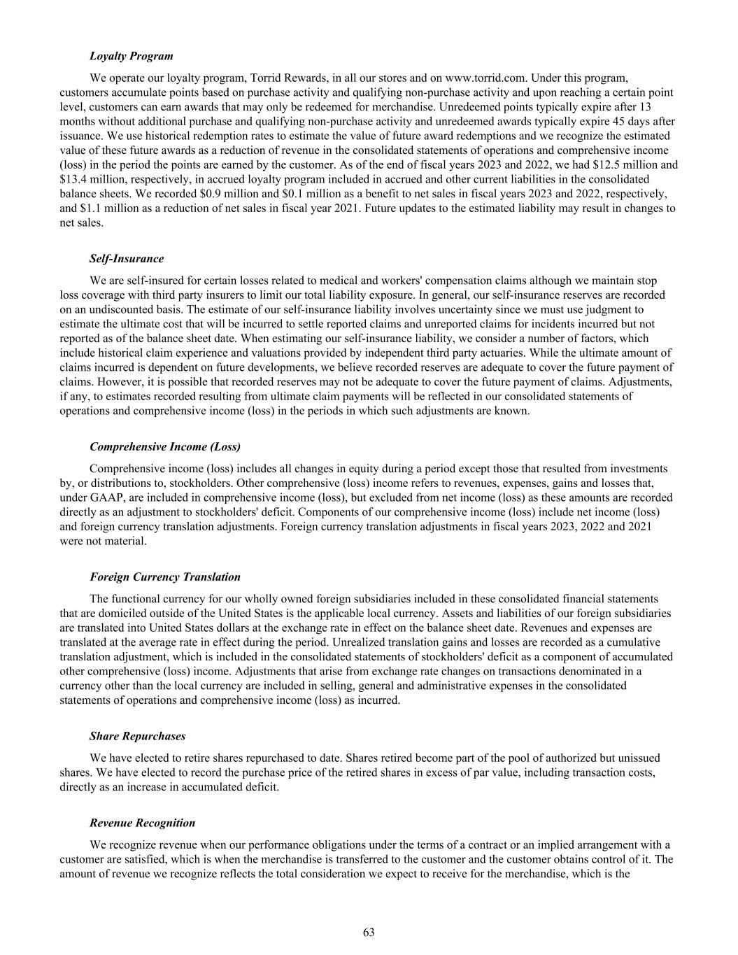 忠诚度计划我们在所有门店和www.torrid.com上运营我们的忠诚度计划Torrid Rewards。在该计划下,客户根据购买活动和符合条件的非购买活动累积积分,并在达到一定的积分水平时,客户可以获得可能只能兑换商品的奖励。未赎回的积分通常在13个月后到期,无需额外购买和符合条件的不购买活动,未赎回的奖励通常在发放45天后到期。我们使用历史赎回率来估计未来奖励赎回的价值,我们将这些未来奖励的估计价值确认为客户赚取积分期间在综合经营报表和综合收益(亏损)中的收入减少。截至2023和2022财年末,我们在合并资产负债表的应计负债和其他流动负债中分别有1250万美元和1340万美元的应计忠诚度计划。我们在2023财年和2022财年分别记录了90万美元和10万美元的净销售额收益,在2021财年记录了110万美元的净销售额减少。未来对估计负债的更新可能会导致净销售额的变化。自我保险我们为与医疗和工人赔偿索赔相关的某些损失提供自我保险,尽管我们与第三方保险公司保持止损保险以限制我们的总责任风险。一般来说,我们的自保准备金是按未贴现基准入账的。对我们的自保责任的估计涉及不确定性,因为我们必须使用判断来估计将发生的最终成本,以解决截至资产负债表日发生但未报告的事件的已报告索赔和未报告索赔。在估计我们的自保责任时,我们考虑了许多因素,其中包括历史索赔经验和独立第三方精算师提供的估值。虽然最终发生的索赔金额取决于未来的发展,但我们认为记录在案的准备金足以支付未来的索赔付款。然而,有可能记录在案的准备金可能不足以支付未来的索赔付款。对最终索赔付款所记录的估计数的调整(如果有的话)将反映在我们已知这些调整期间的综合业务和综合收益(损失)报表中。综合收益(亏损)综合收益(亏损)包括一段时期内的所有权益变动,但股东投资或分配给股东的变动除外。其他综合(亏损)收入是指根据公认会计原则计入综合收益(亏损)但不包括在净收益(亏损)中的收入、费用、损益,因为这些金额直接作为对股东赤字的调整入账。我们综合收益(亏损)的组成部分包括净收益(亏损)和外币折算调整。2023、2022和2021财年的外币换算调整并不重大。外币换算这些合并财务报表中包含的在美国境外注册的我们的全资外国子公司的功能货币为适用的当地货币。我们的外国子公司的资产和负债按资产负债表日的有效汇率换算成美元。收入和费用按期间有效的平均费率换算。未实现折算损益作为累计折算调整入账,作为累计其他综合(亏损)收益的组成部分计入合并报表股东赤字。因以当地货币以外的货币计值的交易的汇率变动而产生的调整在发生时计入综合经营报表和综合收益(亏损)的销售、一般和管理费用。股份回购我们已选择撤回迄今已回购的股份。退股成为授权但未发行股份池的一部分。我们选择将退股股票的购买价格超过面值,包括交易费用,直接记为累计赤字的增加。收入确认我们在我们根据合同条款或与客户的默示安排承担的履约义务得到满足时确认收入,这是当商品转让给客户并且客户获得对其控制权时。我们确认的收入金额反映了我们预期收到的商品总对价,即63