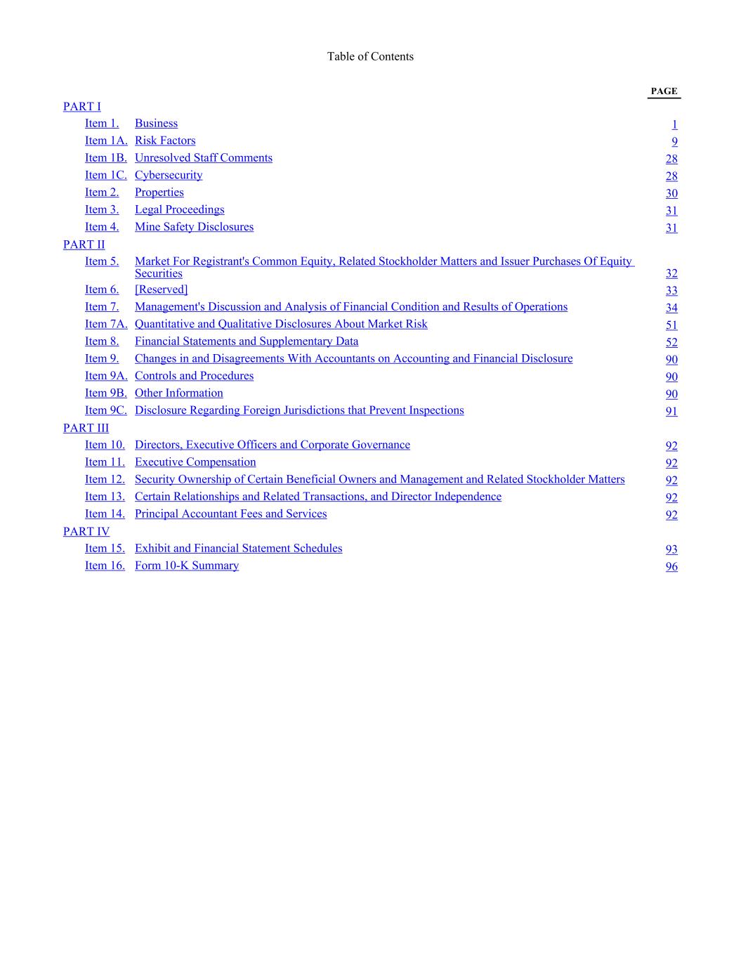 目录第一页第1项。业务1项目1a。风险因素9项目1b。未解决的工作人员意见28项目1c。网络安全28项目2。属性30项目3。法律程序31第4项。矿山安全披露31第二部分第5项。市场为注册人的普通股权、相关股东事项和发行人购买股本证券32第6项。【保留】33项7。管理层对财务状况和经营成果的讨论与分析34项目7a。关于市场风险的定量和定性披露51项目8。财务报表和补充数据52项目9。关于会计和财务披露的变更和与会计师的分歧90项目9a。控制和程序90项目9b。其他信息90项目9c。关于阻止检查的外国司法管辖区的披露91第三部分第10项。董事、执行官和公司治理92项目11。高管薪酬92项目12。某些受益所有人和管理层及相关股东的安全所有权事项92第13项。某些关系和关联交易,以及董事独立性92第14项。首席会计师费用和服务92第四部分第15项。附件和财务报表附表93项目16。表格10-K摘要96