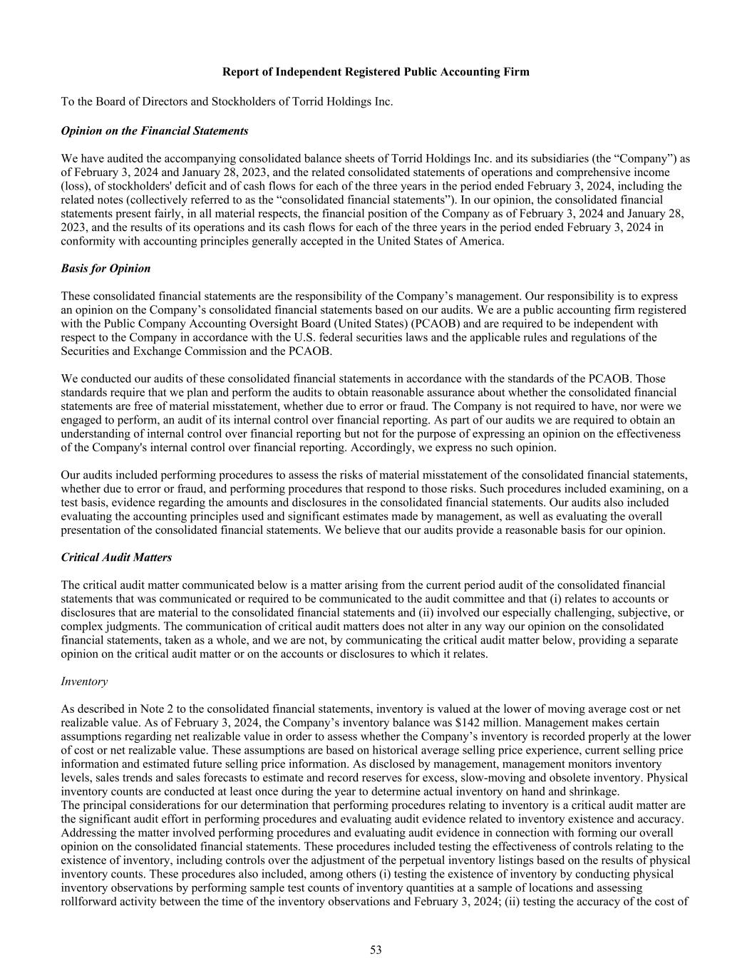 独立注册会计师事务所致Torrid Holdings Inc.董事会和股东的报告关于财务报表的意见我们审计了所附的Torrid Holdings及其子公司(“公司”)截至2024年2月3日和2023年1月28日的合并资产负债表,以及相关的截至2024年2月3日止三个年度的合并经营报表和综合收益(亏损)、股东赤字和现金流量表,包括相关附注(统称“合并财务报表”)。我们认为,合并财务报表按照美国普遍接受的会计原则,在所有重大方面公允地反映了公司截至2024年2月3日和2023年1月28日的财务状况,以及截至2024年2月3日止三年期间每年的经营业绩和现金流量。意见的依据这些合并财务报表由公司管理层负责。我们的责任是在我们审计的基础上对公司的合并财务报表发表意见。我们是一家在美国上市公司会计监督委员会(PCAOB)注册的公共会计师事务所,根据美国联邦证券法以及证券交易委员会和PCAOB的适用规则和条例,我们被要求对公司具有独立性。我们按照PCAOB的标准对这些合并财务报表进行了审计。这些准则要求我们计划和执行审计,以获得关于合并财务报表是否不存在重大错报的合理保证,无论是由于错误还是欺诈。公司没有被要求,我们也没有受聘对其财务报告的内部控制进行审计。作为我们审计的一部分,我们被要求了解财务报告内部控制,但目的不是对公司财务报告内部控制的有效性发表意见。因此,我们不表示这种意见。我们的审计包括执行程序以评估合并财务报表的重大错报风险,无论是由于错误还是欺诈,以及执行应对这些风险的程序。这些程序包括在测试的基础上审查有关合并财务报表中的数额和披露的证据。我们的审计还包括评估管理层使用的会计原则和作出的重大估计,以及评估合并财务报表的总体列报方式。我们认为,我们的审计为我们的意见提供了合理的基础。关键审计事项下文通报的关键审计事项是由合并财务报表当期审计产生的事项,已传达或要求传达给审计委员会,并且(i)涉及对合并财务报表具有重要意义的账目或披露,以及(ii)涉及我们特别具有挑战性、主观或复杂的判断。关键审计事项的沟通不会以任何方式改变我们对合并财务报表的意见,作为一个整体,我们也不会通过传达下文的关键审计事项,就关键审计事项或与其相关的账目或披露提供单独的意见。存货如合并财务报表附注2所述,存货按移动平均成本或可变现净值两者中较低者估值。截至2024年2月3日,该公司的存货余额为1.42亿美元。管理层对可变现净值作出某些假设,以评估公司存货是否按成本或可变现净值两者中较低者正确入账。这些假设是基于历史平均售价经验、当前售价信息和预计未来售价信息。正如管理层所披露,管理层监控库存水平、销售趋势和销售预测,以估计和记录超额准备金, 滞销和陈旧库存。实物库存盘点在一年中至少进行一次,以确定实际库存在手和收缩。我们确定执行与库存相关的程序是一项关键审计事项的主要考虑因素是在执行程序和评估与库存的存在和准确性相关的审计证据方面所做的重大审计工作。处理该事项涉及就形成我们对合并财务报表的总体意见履行程序和评估审计证据。这些程序包括测试与库存的存在有关的控制措施的有效性,包括根据实物库存盘点结果调整永久库存清单的控制措施。除其他外,这些程序还包括:(i)通过在一个地点样本中对库存数量进行抽样测试计数并评估库存观察时间至2024年2月3日之间的滚存活动,通过进行实物库存观察来测试库存的存在;(ii)测试成本的准确性53
