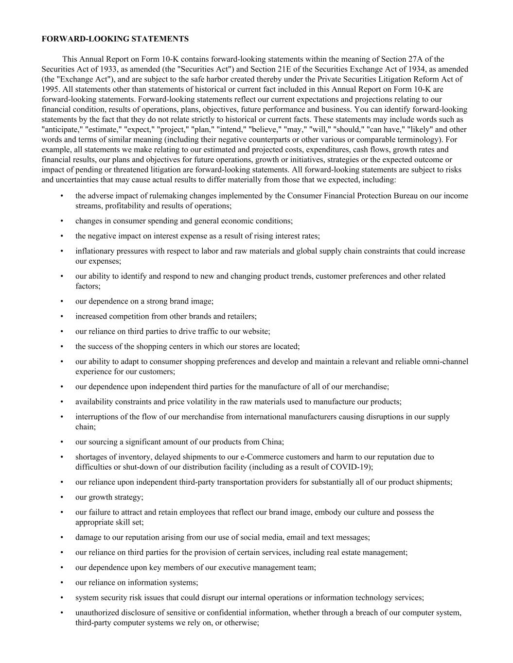 前瞻性陈述本10-K表格年度报告包含经修订的1933年《证券法》第27A条(“证券法”)和经修订的1934年《证券交易法》第21E条(“交易法”)含义内的前瞻性陈述,并受制于根据1995年《私人证券诉讼改革法案》由此创建的安全港。除本年度报告中关于10-K表格的历史或当前事实的陈述外,所有陈述均为前瞻性陈述。前瞻性陈述反映了我们目前对财务状况、经营业绩、计划、目标、未来业绩和业务的预期和预测。您可以通过与历史或当前事实不严格相关这一事实来识别前瞻性陈述。这些陈述可能包括诸如“预期”、“估计”、“预期”、“项目”、“计划”、“打算”、“相信”、“可能”、“将”、“应该”、“可以”、“可能”等词语和其他具有类似含义的词语和术语(包括其否定的对应词或其他各种或类似的术语)。例如,我们就我们的估计和预计成本、支出、现金流、增长率和财务业绩、我们对未来运营的计划和目标、增长或举措、战略或未决或威胁诉讼的预期结果或影响所做的所有陈述都是前瞻性陈述。所有前瞻性陈述都受到风险和不确定性的影响,这些风险和不确定性可能导致实际结果与我们预期的结果存在重大差异,包括:•消费者金融保护局实施的规则制定变更对我们的收入流产生的不利影响,盈利能力和经营业绩;•消费者支出和总体经济状况的变化;•利率上升对利息支出的负面影响;•劳动力和原材料方面的通胀压力以及可能增加我们开支的全球供应链限制;•我们识别和应对新的和不断变化的产品趋势的能力,客户偏好和其他相关因素;•我们依赖强大的品牌形象;•来自其他品牌和零售商的竞争加剧;•我们依赖第三方为我们的网站带来流量;•我们的商店所在购物中心的成功;•我们有能力适应消费者的购物偏好,并为我们的客户开发和维护相关和可靠的全渠道体验;•我们依赖独立第三方来制造我们所有的商品;•供应限制以及用于制造我们产品的原材料的价格波动;•国际制造商中断我们的商品流通,导致我们的供应链中断;•我们从中国采购大量产品;•库存短缺,由于我们的分销设施遇到困难或关闭(包括由于新冠疫情),延迟向我们的电子商务客户发货并损害我们的声誉;•我们几乎所有的产品发货都依赖独立的第三方运输供应商;•我们的增长战略;•我们未能吸引和留住反映我们的品牌形象、体现我们的文化并拥有适当技能的员工;•我们因使用社交媒体、电子邮件和短信而对我们的声誉造成损害;•我们在提供某些服务方面依赖第三方,包括房地产管理;•我们对执行管理团队关键成员的依赖;•我们对信息系统的依赖;•可能扰乱我们内部运营或信息技术服务的系统安全风险问题;•未经授权泄露敏感或机密信息,无论是通过破坏我们的计算机系统、我们所依赖的第三方计算机系统还是其他方式;