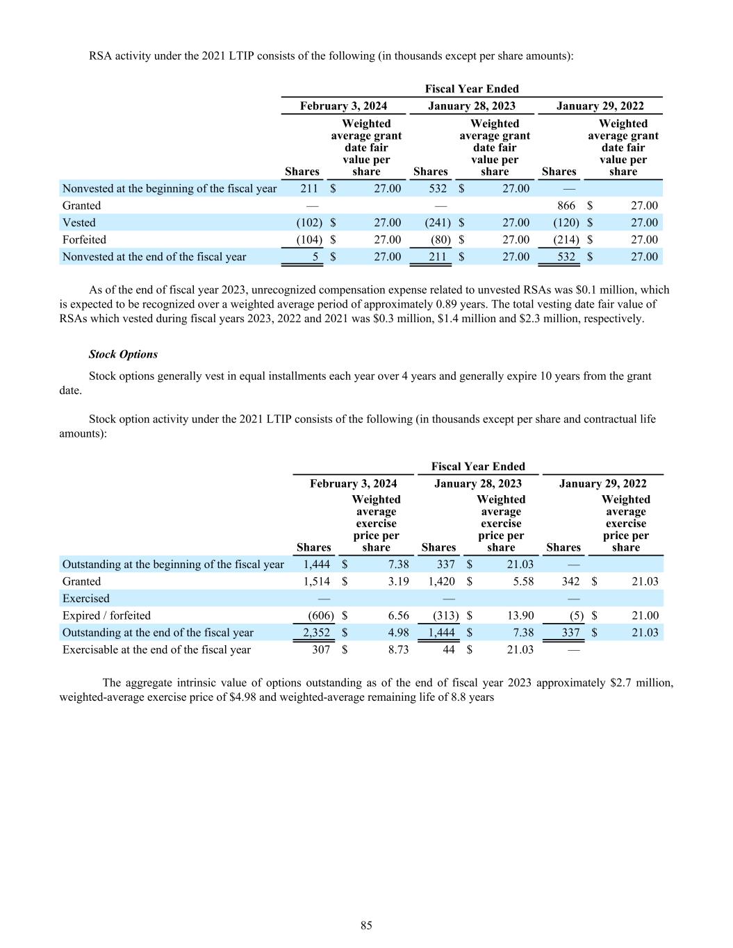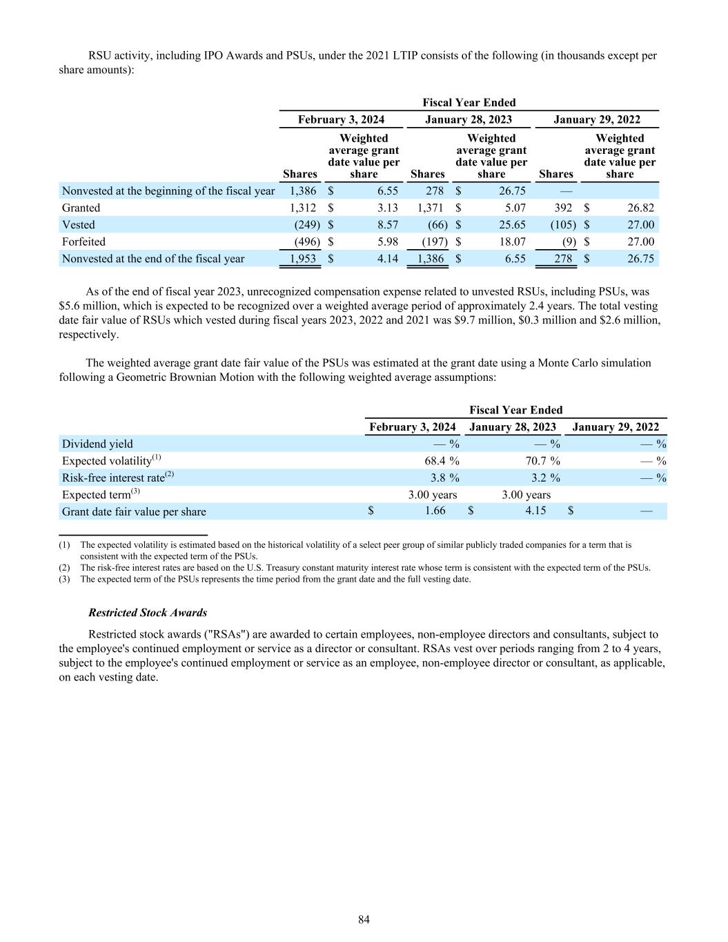 2021年LTIP下的RSU活动,包括IPO奖励和PSU,包括以下内容(以千为单位,每股金额除外):截至2024年2月3日的财政年度、2023年1月28日、2023年1月29日,2022股份加权平均授予日每股价值股份加权平均授予日每股价值股份加权平均授予日每股价值财年初未归属1,386美元6.55 278美元26.75美元—授予1,312美元3.13 1,371美元5.07 392美元26.82美元已归属(249)8.57(66)25.65美元(105)27.00美元没收(496)5.98美元(197)18.07美元(9)27.00美元截至2023财年末未归属1,953美元4.141,386美元6.55 278美元26.75美元,与包括PSU在内的未归属RSU相关的未确认补偿费用为560万美元,预计将在约2.4年的加权平均期间内确认。在2023、2022和2021财年归属的RSU的归属日期公允价值总额分别为970万美元、30万美元和260万美元。PSU的加权平均授予日公允价值是在授予日使用按照几何布朗运动的蒙特卡洛模拟估计的,并采用以下加权平均假设:截至2024年2月3日的财政年度、2023年1月28日、2023年1月29日,2022年股息收益率—% —% —%预期波动率(1)68.4% 70.7% —%无风险利率(2)3.8% 3.2% —%预期期限(3)3.0年3.00年授予日每股公允价值$ 1.66 $ 4.15 $ —(1)预期波动率是根据与PSU预期期限一致的特定同类上市公司同行集团的历史波动率估计的。(2)无风险利率以期限与PSU预期期限一致的美国国债恒定期限利率为基准。(3)事业单位的预期期限指自授予日及全部归属日起的期间。限制性股票奖励限制性股票奖励(“RSA”)授予某些雇员、非雇员董事和顾问,但须视雇员是否继续受雇或担任董事或顾问的情况而定。RSA的归属期限为2至4年,但须视雇员在每个归属日期是否继续受雇或作为雇员、非雇员董事或顾问(如适用)而定。84