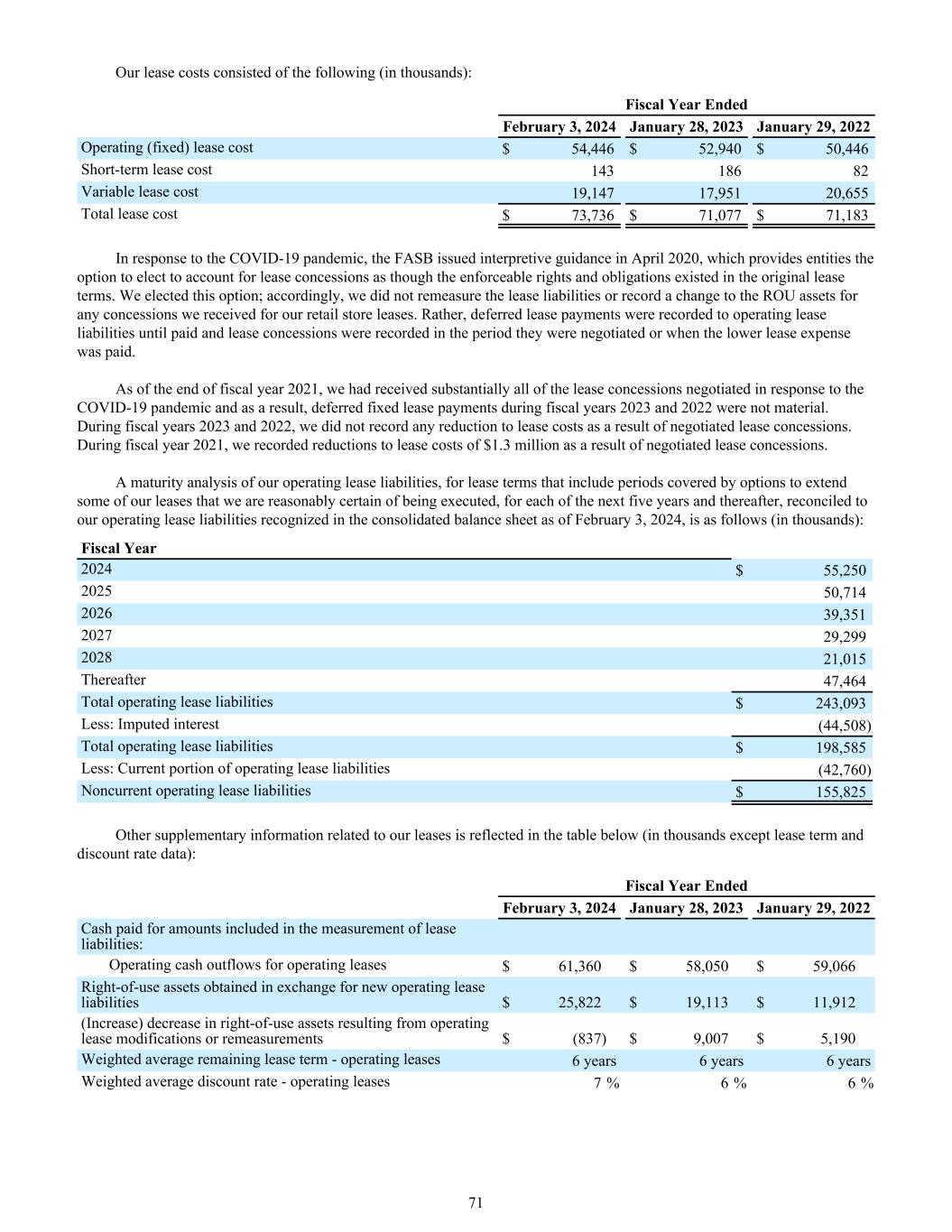我们的租赁成本包括以下(以千为单位):截至2024年2月3日的财政年度2023年1月28日2022年1月29日经营(固定)租赁成本54,446美元52,940美元50,446美元短期租赁成本14318682可变租赁成本19,14717,95120,655总租赁成本73,736美元71,077美元71,183美元为应对新冠肺炎大流行,FASB于2020年4月发布了解释性指南,该指南为实体提供了选择对租赁特许权进行会计处理的选择权,就好像原始租赁条款中存在可执行的权利和义务一样。我们选择了这个选项;因此,我们没有重新计量租赁负债,也没有记录我们就零售店租赁获得的任何优惠的ROU资产的变化。相反,递延租赁付款记录在经营租赁负债中,直到在谈判期间或支付较低的租赁费用时已支付和租赁特许权被记录。截至2021财年末,我们已收到为应对新冠肺炎大流行而谈判达成的几乎所有租赁特许权,因此,2023和2022财年的递延固定租赁付款并不重要。在2023和2022财年,我们没有因协商租赁优惠而记录租赁成本的任何减少。在2021财年,由于协商的租赁优惠,我们记录到租赁成本减少了130万美元。对我们的经营租赁负债的到期分析,对于包括我们合理确定将在未来五年及其后每一年执行的延长我们的一些租赁的选择权所涵盖的期间的租赁条款,与我们截至2024年2月3日在综合资产负债表中确认的经营租赁负债进行调节,如下(单位:千):2024财年55,250202550,714202639,351202729,299202821,015此后47,464经营租赁负债总额243,093美元减:估算利息(44,508)经营租赁负债总额198,585美元减:经营租赁负债的流动部分(42,760)非流动经营租赁负债155,825美元与我们的租赁相关的其他补充信息见下表(以千为单位,租赁期限和贴现率数据除外):截至2024年2月3日的财政年度2023年1月28日1月29日,2022为计入租赁负债计量的金额支付的现金:经营租赁的经营现金流出61,360美元58,050美元590,066美元为换取新的经营租赁负债而获得的使用权资产25,822美元19,113美元11,912美元(增加)经营租赁修改或重新计量导致的使用权资产减少(837)9,007美元5,190美元加权平均剩余租赁期-经营租赁6年6年6年加权平均贴现率-经营租赁7% 6% 6% 71