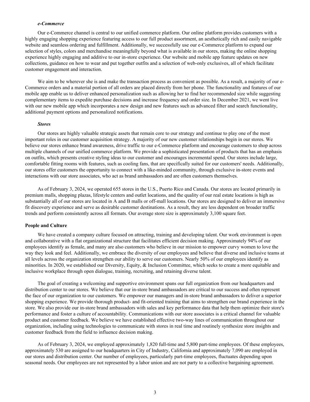 电子商务我们的电子商务渠道是我们统一商务平台的核心。我们的在线平台为客户提供极具吸引力的购物体验,其特点是可以访问我们完整的产品分类、一个美学丰富且易于导航的网站以及无缝订购和履行。此外,我们成功地利用我们的电子商务平台,有意义地扩大了我们对款式、颜色和商品的选择,超出了我们商店提供的范围,使在线购物体验极具吸引力,并为我们的店内体验增添了新的内容。我们的网站和移动应用程序提供有关新系列的更新、关于如何穿着和组合服装的指导以及精选的仅限网络的独家商品,所有这些都有助于客户参与和互动。我们的目标是无论她在哪里,让交易过程尽可能便捷。因此,我们的大部分电商订单和所有订单的一部分材料都是直接从她的手机下的。我们的移动应用程序的功能和特性使我们能够提供增强的个性化,例如允许她找到她推荐的尺码,同时建议补充物品以加快购买决策并增加频率和订单规模。2021年12月,我们上线了新的移动应用程序,该应用程序采用了新设计和新功能,例如高级过滤器和搜索功能、额外的支付选项和个性化通知。门店我们的门店是非常有价值的战略资产,仍然是我们战略的核心,并继续在我们的客户获取战略中发挥最重要的作用之一。我们的大部分新客户关系都是从我们的门店开始的。我们相信,我们的门店可以提高品牌知名度,为我们的电子商务平台带来流量,并鼓励客户通过我们统一商务平台的多个渠道进行购物。我们对强调服装的产品进行了复杂的展示,向我们的客户展示了创造性的造型创意,并鼓励增加支出。我们的门店包括大型、舒适的试衣间,配有专门适合我们客户需求的功能,例如散热风扇。此外,我们的门店为客户提供了与志同道合的社区建立联系的机会,通过独家店内活动和与我们的门店员工的互动,他们充当品牌大使,通常自己也是客户。截至2024年2月3日,我们在美国、波多黎各和加拿大经营655家门店。我们的门店主要位于高级商场、购物广场、生活方式中心和奥特莱斯位置,我们的房地产位置的质量很高,因为我们几乎所有的门店都位于A和B购物中心或非购物中心位置。我们的门店旨在提供身临其境的合体发现体验,并作为理想的客户目的地。因此,它们较少依赖更广泛的流量趋势,并在所有业态中表现一致。我们的平均门店面积约为3,100平方英尺。人与文化我们打造了以吸引、培养和发展人才为主的公司文化。我们的工作环境是开放和协作的,具有扁平化的组织结构,有助于高效决策。我们大约94%的员工认为自己是女性,许多人也是客户,他们相信我们的使命是赋予曲线女性以热爱她们的外观和感觉的方式。此外,我们拥抱员工的多样性,并相信整个组织各级的多元化和包容性团队加强了我们为客户服务的能力。我们近50%的员工认定为少数族裔。2020年,我们成立了多元化、公平和包容委员会,旨在通过公开对话、培训、招聘和留住多元化人才,创造一个更加公平和包容的工作场所。创造一个欢迎和支持环境的目标跨越了我们从总部和配送中心到门店的整个组织。我们相信,我们的店内品牌大使对我们的成功至关重要,并且经常向我们的客户代表我们组织的面貌。我们授权我们的经理和店内品牌大使提供卓越的购物体验。我们提供全面的以产品和健身为导向的培训,旨在加强我们在门店的品牌体验。我们还向店内品牌大使提供销售和关键绩效数据,帮助他们优化门店绩效并培养问责文化。与我们的店员沟通是获得有价值的产品和客户反馈的关键渠道。我们相信,我们已经在整个组织中建立了有效的双向沟通渠道,包括使用技术与门店进行实时沟通,并定期综合门店洞察和来自现场的客户反馈,以影响决策。截至2024年2月3日, 我们雇佣了大约1,820名全职和5,800名兼职员工。在这些员工中,大约530人被分配到我们位于加利福尼亚州工业城的总部,大约7,090人受雇于我们的商店和配送中心。我们的员工数量,尤其是兼职员工,会根据季节性需求而波动。我们的员工没有工会代表,也不是集体谈判协议的一方。3