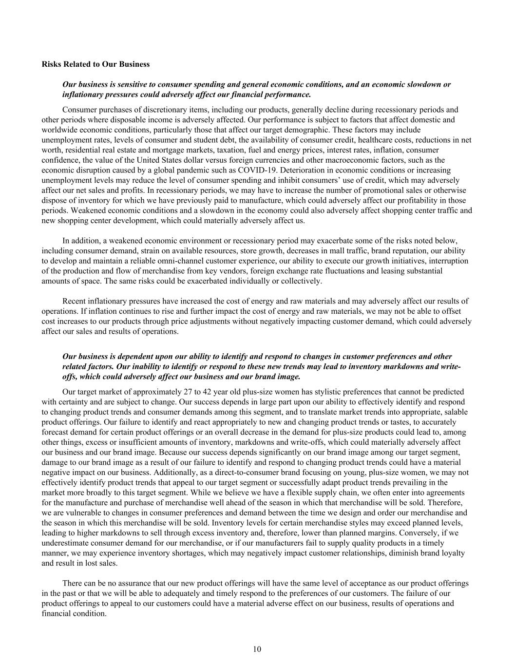 与我们业务相关的风险我们的业务对消费者支出和总体经济状况很敏感,经济放缓或通胀压力可能会对我们的财务业绩产生不利影响。消费者购买的非必需品,包括我们的产品,在经济衰退期和其他可支配收入受到不利影响的时期通常会下降。我们的表现受制于影响国内和世界经济状况的因素,尤其是那些影响我们目标人群的因素。这些因素可能包括失业率、消费者和学生债务水平、消费者信贷的可得性、医疗保健成本、净资产减少、住宅房地产和抵押贷款市场、税收、燃料和能源价格、利率、通货膨胀、消费者信心、美元兑外币的价值以及其他宏观经济因素,例如由全球大流行(如新冠疫情)造成的经济中断。经济状况恶化或失业率上升可能会降低消费者支出水平并抑制消费者使用信贷,这可能会对我们的净销售额和利润产生不利影响。在经济衰退时期,我们可能不得不增加促销销售的数量或以其他方式处置我们之前支付制造费用的库存,这可能会对我们在这些时期的盈利能力产生不利影响。经济状况疲软和经济放缓也可能对购物中心客流量和新购物中心发展产生不利影响,从而可能对我们产生重大不利影响。此外,疲软的经济环境或衰退期可能会加剧下文提到的一些风险,包括消费者需求、可用资源紧张、门店增长、商场客流量下降、品牌声誉、我们开发和维持可靠的全渠道客户体验的能力、我们执行增长举措的能力、主要供应商的商品生产和流动中断、外汇汇率波动和大量租赁空间。同样的风险可能会单独或集体加剧。最近的通胀压力增加了能源和原材料的成本,并可能对我们的经营业绩产生不利影响。如果通货膨胀继续上升并进一步影响能源和原材料成本,我们可能无法通过价格调整来抵消我们产品的成本增加,而不会对客户需求产生负面影响,这可能会对我们的销售和经营业绩产生不利影响。我们的业务取决于我们识别和应对客户偏好和其他相关因素变化的能力。我们无法识别或应对这些新趋势可能会导致库存降价和注销,这可能会对我们的业务和品牌形象产生不利影响。我们的目标市场约为27至42岁的大码女性,其风格偏好无法确定地预测,并且可能会发生变化。我们的成功在很大程度上取决于我们能否有效识别和应对这一细分市场中不断变化的产品趋势和消费者需求,并将市场趋势转化为适当、可销售的产品供应。我们未能识别并对新的和不断变化的产品趋势或口味做出适当反应,未能准确预测对某些产品供应的需求或对大码产品的需求总体下降,除其他外,可能导致库存数量过剩或不足、降价和注销,这可能对我们的业务和我们的品牌形象产生重大不利影响。由于我们的成功在很大程度上取决于我们在目标细分市场中的品牌形象,由于我们未能识别和应对不断变化的产品趋势而对我们的品牌形象造成的损害可能会对我们的业务产生重大的负面影响。此外,作为一个专注于年轻、大码女性的直接面向消费者的品牌,我们可能无法有效识别吸引我们目标细分市场的产品趋势,或成功地将市场上流行的产品趋势更广泛地调整为该目标细分市场。虽然我们相信我们拥有灵活的供应链,但我们经常会在商品销售的季节之前就制造和购买商品达成协议。因此,我们很容易受到消费者偏好和需求变化的影响,从我们设计和订购商品的时间到销售这种商品的季节。某些商品款式的库存水平可能会超过计划水平,从而导致更高的降价以通过过剩的库存进行销售,从而低于计划的利润率。相反,如果我们低估了消费者对我们商品的需求,或者如果我们的制造商未能及时供应优质产品,我们可能会遇到库存短缺, 这可能会对客户关系产生负面影响,降低品牌忠诚度并导致销售损失。我们无法保证我们的新产品供应将获得与我们过去的产品供应相同的接受程度,或者我们将能够充分和及时地响应客户的偏好。我们的产品未能吸引客户,可能对我们的业务、经营业绩和财务状况产生重大不利影响。10