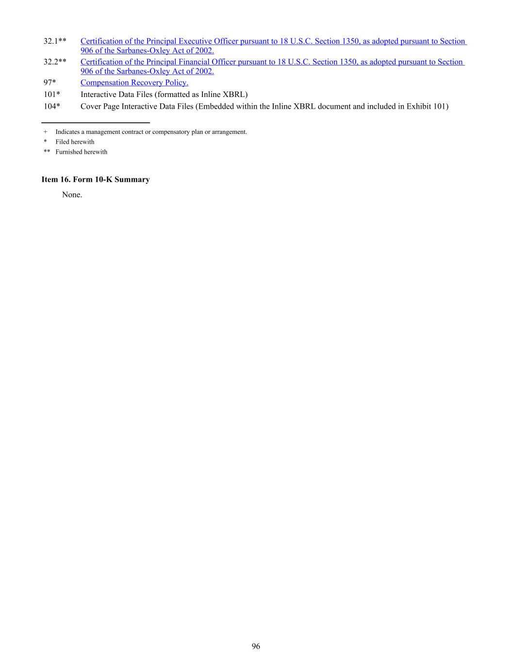 32.1 * *根据2002年《萨班斯-奥克斯利法案》第906条通过的18 U.S.C.第1350条对首席执行官进行认证。32.2 * *根据2002年《萨班斯-奥克斯利法案》第906条通过的18 U.S.C.第1350条对首席财务官进行认证。97 *赔偿追回政策。101 *交互式数据文件(格式为内联XBRL)104 *封面交互式数据文件(嵌入内联XBRL文档并包含在附件 101中)+表示管理合同或补偿性计划或安排。*随函提交* *随函提交项目16。表格10-K摘要无。96