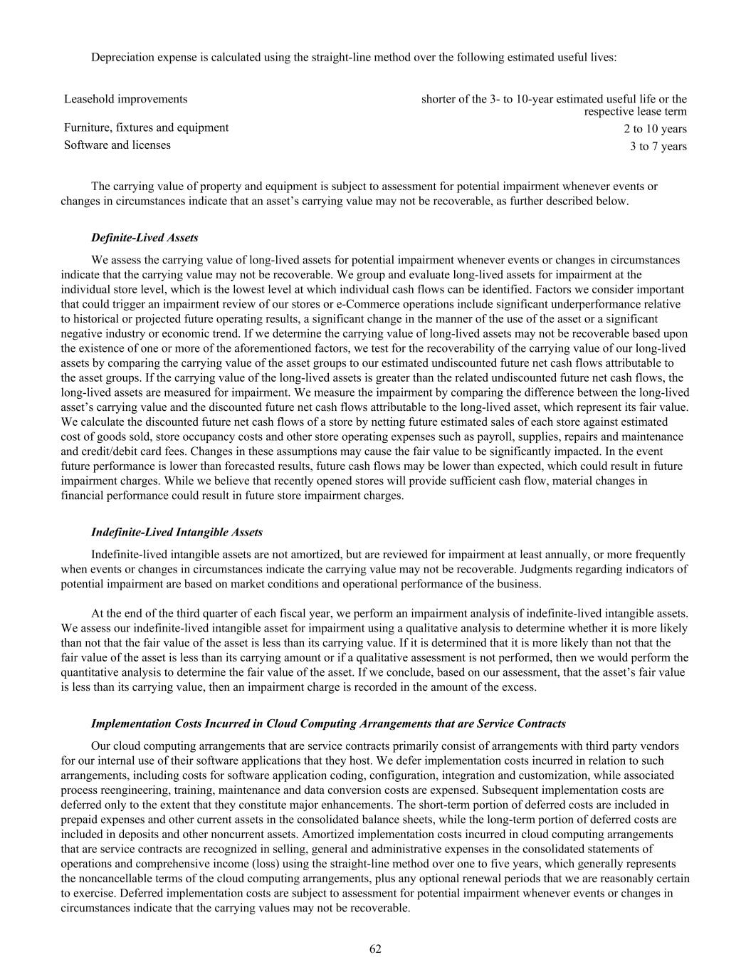 折旧费用在以下估计可使用年限内采用直线法计算:3至10年估计可使用年限或相应租赁期中较短的租赁物改良2至10年家具、固定装置和设备软件和许可证3至7年每当有事件或情况变化表明资产的账面价值可能无法收回时,财产和设备的账面价值须进行潜在减值评估,如下文进一步描述。固定寿命资产每当有事件或情况变化表明账面价值可能无法收回时,我们就评估长期资产的账面价值是否存在潜在减值。我们在个店层面对长期资产进行分组和减值评估,这是可以识别单个现金流的最低水平。我们认为可能触发对我们的门店或电子商务业务进行减值审查的重要因素包括相对于历史或预计的未来经营业绩表现明显不佳、资产使用方式的重大变化或重大的负面行业或经济趋势。如果我们基于前述一个或多个因素的存在确定长期资产的账面价值可能无法收回,我们通过将资产组的账面价值与我们估计的归属于资产组的未贴现未来净现金流量进行比较来测试我们长期资产的账面价值的可收回性。如果长期资产的账面价值大于相关的未折现未来净现金流量,则对长期资产进行减值计量。我们通过比较长期资产的账面价值与代表其公允价值的贴现未来归属于长期资产的净现金流量之间的差额来计量减值。我们通过将每家门店的未来估计销售额与估计的销售商品成本、门店占用成本和其他门店运营费用(如工资、用品、维修和保养以及信用卡/借记卡费用)进行净额计算,得出一家门店的贴现未来净现金流。这些假设的变化可能会导致公允价值受到重大影响。如果未来业绩低于预测结果,未来现金流可能低于预期,这可能导致未来的减值费用。虽然我们认为最近开设的门店将提供充足的现金流,但财务业绩的重大变化可能会导致未来的门店减值费用。无限期无形资产无限期无形资产不进行摊销,但至少每年进行减值审查,或在事件或情况变化表明账面价值可能无法收回时更频繁地进行减值审查。关于潜在减值指标的判断是基于市场情况和业务的运营表现。在每个会计年度的第三季度末,我们对无限期无形资产进行减值分析。我们使用定性分析对我们的无限期无形资产进行减值评估,以确定该资产的公允价值低于其账面价值的可能性是否更大。如果确定资产的公允价值低于其账面价值的可能性较大或者没有进行定性评估,那么我们将进行定量分析来确定资产的公允价值。如果我们根据我们的评估得出结论,资产的公允价值低于其账面价值,则在超出部分的金额中记录减值费用。属于服务合同的云计算安排产生的实施成本我们属于服务合同的云计算安排主要包括与第三方供应商就我们内部使用其托管的软件应用程序的安排。我们递延与此类安排相关的实施成本,包括软件应用程序编码、配置、集成和定制的成本,而相关的流程再造、培训、维护和数据转换成本则计入费用。后续实施成本仅在构成重大增强的情况下才予以递延。递延成本的短期部分计入合并资产负债表的预付费用和其他流动资产,而递延成本的长期部分计入存款和其他非流动资产。属于服务合同的云计算安排发生的摊销实施成本,在一至五年内以直线法在综合经营报表和综合收益(亏损)中确认为销售、一般和管理费用, 这通常代表云计算安排的不可撤销条款,加上我们合理确定将行使的任何可选续约期。每当有事件或情况变化表明账面价值可能无法收回时,递延实施成本须进行潜在减值评估。62