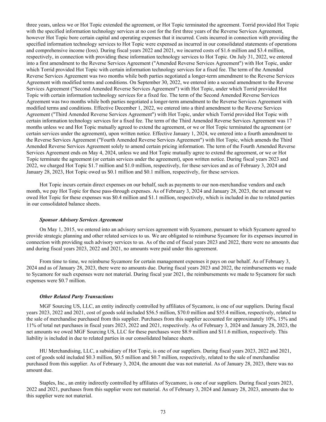 三年,除非我们或Hot Topic对协议进行展期,或Hot Topic终止协议。Torrid在反向服务协议的前三年内向Hot Topic免费提供指定的信息技术服务,但Hot Topic承担了其产生的一定的资金和运营费用。与向Hot Topic提供特定信息技术服务有关的成本在我们的综合经营报表和综合收益(亏损)中支出。在2022和2021财年,我们为向Hot Topic提供这些信息技术服务分别产生了160万美元和340万美元的成本。于2022年7月31日,我们与Hot Topic订立反向服务协议(“经修订的反向服务协议”)的第一次修订,据此,Torrid以固定费用向Hot Topic提供若干信息技术服务。经修订的反向服务协议的期限为两个月,而双方就经修订条款和条件的反向服务协议的较长期修订进行了谈判。于2022年9月30日,我们与Hot Topic订立反向服务协议(“第二次修订反向服务协议”)的第二次修订,据此,Torrid以固定费用向Hot Topic提供若干信息技术服务。第二份经修订的反向服务协议的期限为两个月,而双方就经修订的条款和条件对反向服务协议进行了更长期的修订进行了谈判。自2022年12月1日起,我们与Hot Topic订立反向服务协议的第三次修订(“第三次修订反向服务协议”),据此,Torrid以固定费用向Hot Topic提供若干信息技术服务。第三份经修订的反向服务协议的期限为17个月,除非我们和Hot Topic相互同意延长协议,或者我们或Hot Topic经书面通知后终止协议(或协议下的某些服务)。自2024年1月1日起,我们与Hot Topic订立反向服务协议的第四次修订(“第四次经修订的反向服务协议”),该协议修订第三次经修订的反向服务协议仅是为了修订某些定价信息。第四次修订的反向服务协议的期限截至2024年5月4日,除非我们和Hot Topic相互同意延长协议,或者我们或Hot Topic在收到书面通知后终止协议(或协议下的某些服务)。在2023财年和2022财年,我们为这些服务分别向Hot Topic收取了170万美元和100万美元的费用,截至2024年2月3日和2023年1月28日,Hot Topic为这些服务分别欠下了10万美元和10万美元。Hot Topic代表我们产生某些直接费用,例如支付给我们的非商品供应商的款项,并且每个月,我们都会向Hot Topic支付这些转嫁费用。截至2024年2月3日和2023年1月28日,我们欠Hot Topic这些费用的净额分别为0.4百万美元和1.1百万美元,这已包含在我们的合并资产负债表中的应付关联方款项中。赞助商顾问服务协议于2015年5月1日,我们与Sycamore订立顾问服务协议,据此,Sycamore同意向我们提供战略规划及其他相关服务。我们有义务偿还Sycamore因向我们提供此类咨询服务而产生的费用。截至2023和2022财年末,没有到期款项,并且在2023、2022和2021财年,没有根据本协议支付任何款项。不定期报销Sycamore代我们支付的某些管理费用。截至2024年2月3日和2023年1月28日,没有到期金额。在2023和2022财年,我们向Sycamore报销的此类费用并不重要。在2021财年,我们向Sycamore报销的此类费用为70万美元。其他关联交易MGF Sourcing US,LLC是Sycamore关联公司间接控制的实体,是我们的供应商之一。在2023、2022和2021财年,销售的商品成本分别包括与销售从该供应商购买的商品有关的5650万美元、70000万美元和5540万美元。在2023、2022和2021财年,从该供应商的采购分别约占净采购总额的10%、15%和11%。截至2024年2月3日和2023年1月28日,我们欠MGF Sourcing US,LLC这些采购的净额分别为890万美元和1160万美元。该负债在我们的合并资产负债表中计入应付关联方款项。Hot Topic的子公司HU Merchandising,LLC是我们的供应商之一。在2023、2022和2021财年, 销售商品成本分别包括与销售从该供应商购买的商品有关的30万美元、50万美元和70万美元。截至2024年2月3日,到期金额并不重大。截至2023年1月28日,无到期金额。Sycamore的关联公司间接控制的实体史泰博公司是我们的供应商之一。在2023、2022和2021财年,从该供应商的采购并不重要。截至2024年2月3日和2023年1月28日,应付该供应商的金额并不重大。73