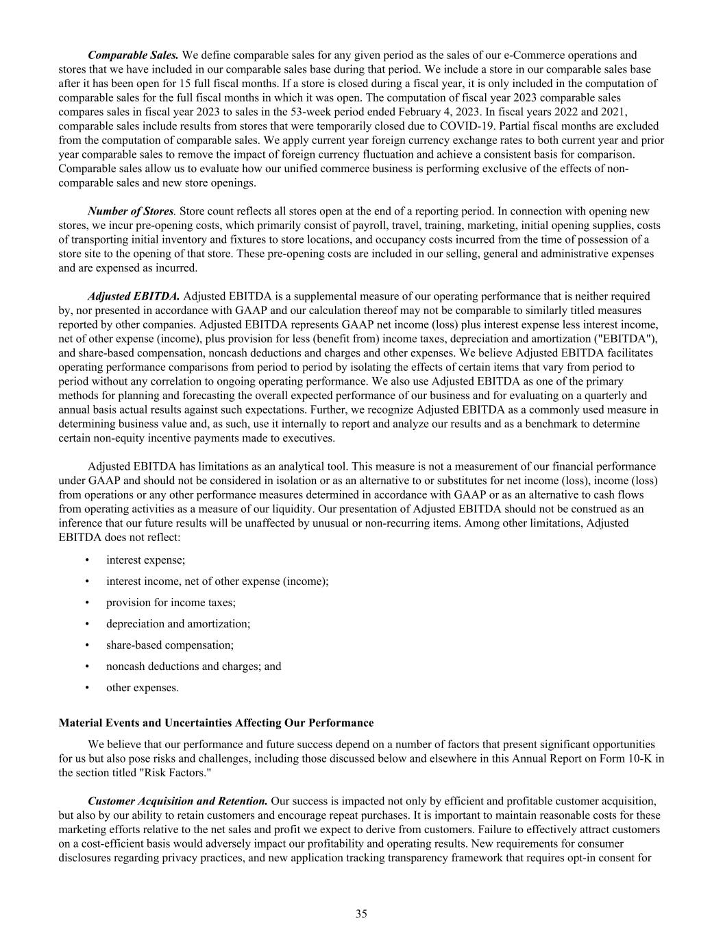 可比销售额。我们将任何特定时期的可比销售额定义为我们在该期间计入可比销售基数的电子商务业务和商店的销售额。我们将一家门店列入我们的可比销售基础,因为它已开业15个完整的财政月。如果一家商店在一个会计年度内关闭,则仅将其包括在其开业的整个会计月份的可比销售额计算中。对2023财年可比销售额的计算将2023财年的销售额与截至2023年2月4日的53周期间的销售额进行了比较。在2022和2021财年,可比销售额包括因新冠疫情而暂时关闭的门店的业绩。可比销售额的计算中不包括部分会计月份。我们对当年和上一年的可比销售额均采用当年的外币汇率,以去除外币波动的影响,实现一致的比较基础。可比销售额使我们能够评估我们的统一商务业务的表现如何,不包括不可比销售额和新店开业的影响。门店数量。门店数量反映报告期末开业的所有门店。与开设新店有关,我们产生开业前成本,主要包括工资、差旅、培训、营销、首次开业用品、将初始库存和固定装置运送到门店位置的成本,以及从拥有门店场地到该门店开业期间产生的占用成本。这些开业前成本包含在我们的销售、一般和管理费用中,并在发生时计入费用。调整后EBITDA。调整后EBITDA是对我们经营业绩的补充衡量标准,既不是公认会计原则要求的,也不是按照公认会计原则提出的,我们对此的计算可能无法与其他公司报告的类似标题的衡量标准进行比较。调整后EBITDA指GAAP净收入(亏损)加上利息支出减去利息收入,扣除其他费用(收入),再加上减去(受益于)所得税、折旧和摊销(“EBITDA”),以及基于股份的薪酬、非现金扣除和费用以及其他费用的拨备。我们认为,调整后的EBITDA通过隔离不同时期不同的某些项目的影响,促进了不同时期的经营业绩比较,而与持续经营业绩没有任何相关性。我们还使用调整后EBITDA作为主要方法之一,以规划和预测我们业务的整体预期业绩,并根据这些预期对季度和年度的实际结果进行评估。此外,我们认为调整后的EBITDA是确定业务价值时常用的衡量标准,因此,我们在内部使用它来报告和分析我们的结果,并作为确定向高管支付的某些非股权激励付款的基准。调整后的EBITDA作为一种分析工具存在局限性。这一衡量标准不是衡量我们在GAAP下的财务业绩,不应孤立地考虑或作为净收入(亏损)、运营收入(亏损)或根据GAAP确定的任何其他业绩衡量标准的替代或替代,或作为衡量我们流动性的经营活动现金流量的替代方法。我们对调整后EBITDA的表述不应被解释为我们未来业绩将不受不寻常或非经常性项目影响的推断。除其他限制外,调整后EBITDA未反映:•利息支出;•利息收入,扣除其他费用(收入);•所得税拨备;•折旧和摊销;•以股份为基础的薪酬;•非现金扣除和收费;•其他费用。影响我们业绩的重大事件和不确定性我们认为,我们的业绩和未来的成功取决于若干因素,这些因素为我们带来了重大机遇,但也带来了风险和挑战,包括下文和本年度报告10-K表格中标题为“风险因素”一节的其他部分中讨论的因素。客户获取和保留。我们的成功不仅受到高效和有利可图的客户获取的影响,还受到我们留住客户和鼓励重复购买的能力的影响。相对于我们预期从客户那里获得的净销售额和利润,保持这些营销努力的合理成本非常重要。未能以具有成本效益的方式有效吸引客户将对我们的盈利能力和经营业绩产生不利影响。消费者披露隐私做法的新要求,以及要求35选择加入同意的新应用程序跟踪透明度框架