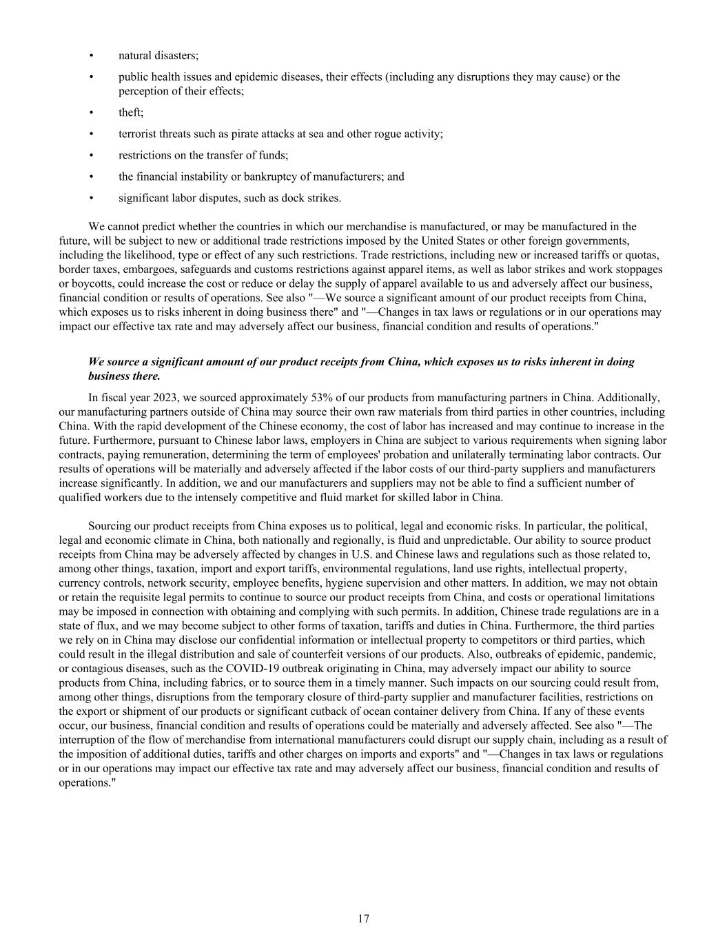 •自然灾害;•公共卫生问题和流行病,其影响(包括它们可能造成的任何干扰)或对其影响的看法;•盗窃;•恐怖主义威胁,例如海盗袭击海上和其他流氓活动;•限制资金转移;•制造商的财务不稳定或破产;•重大劳资纠纷,例如码头罢工。我们无法预测我们的商品生产所在的国家,或未来可能生产的国家,是否会受到美国或其他外国政府施加的新的或额外的贸易限制,包括任何此类限制的可能性、类型或影响。贸易限制,包括新的或增加的关税或配额、边境税、禁运、保障措施和对服装项目的海关限制,以及劳工罢工和停工或抵制,可能会增加成本或减少或延迟我们可获得的服装供应,并对我们的业务、财务状况或经营业绩产生不利影响。另请参阅“—我们大量的产品收据来自中国,这使我们面临在中国开展业务所固有的风险”和“—税法或法规或我们的运营的变化可能会影响我们的有效税率,并可能对我们的业务、财务状况和经营业绩产生不利影响。”我们从中国采购了大量的产品收据,这使我们面临在中国开展业务所固有的风险。2023财年,我们约53%的产品来自中国的制造合作伙伴。此外,我们在中国以外的制造合作伙伴可能会从包括中国在内的其他国家的第三方采购自己的原材料。随着中国经济的快速发展,劳动力成本增加,未来可能还会继续增加。此外,根据中国劳动法,中国的雇主在签订劳动合同、支付报酬、确定雇员试用期和单方面终止劳动合同时,都受到各种要求的约束。如果我们的第三方供应商和制造商的劳动力成本大幅增加,我们的经营业绩将受到重大不利影响。此外,由于中国熟练劳动力市场竞争激烈且流动,我们以及我们的制造商和供应商可能无法找到足够数量的合格工人。从中国采购我们的产品收据使我们面临政治、法律和经济风险。特别是,中国的政治、法律和经济气候,无论是国家还是地区,都是流动的、不可预测的。我们从中国采购产品收据的能力可能会受到美国和中国法律法规变化的不利影响,例如与(其中包括)税收、进出口关税、环境法规、土地使用权、知识产权、货币管制、网络安全、员工福利、卫生监督和其他事项相关的法律法规变化。此外,我们可能不会获得或保留必要的合法许可,以继续从中国采购我们的产品收据,并且可能会在获得和遵守此类许可方面施加成本或操作限制。此外,中国的贸易法规处于不断变化的状态,我们可能会在中国受到其他形式的税收、关税和关税。此外,我们在中国依赖的第三方可能会向竞争对手或第三方披露我们的机密信息或知识产权,这可能会导致我们产品的假冒版本的非法分销和销售。此外,疫情、大流行或传染病的爆发,例如源自中国的新冠疫情爆发,可能会对我们从中国采购产品(包括面料)或及时采购的能力产生不利影响。对我们采购的此类影响可能是由于,除其他外,第三方供应商和制造商设施的临时关闭、我们产品的出口或运输受到限制或来自中国的海运集装箱交付大幅减少造成的中断。如果发生任何这些事件,我们的业务、财务状况和经营业绩可能会受到重大不利影响。另见“—国际制造商的商品流中断可能会扰乱我们的供应链,包括对进出口征收额外关税、关税和其他费用的结果”和“—税法或法规或我们的运营的变化可能会影响我们的有效税率,并可能对我们的业务、财务状况和经营业绩产生不利影响。”17