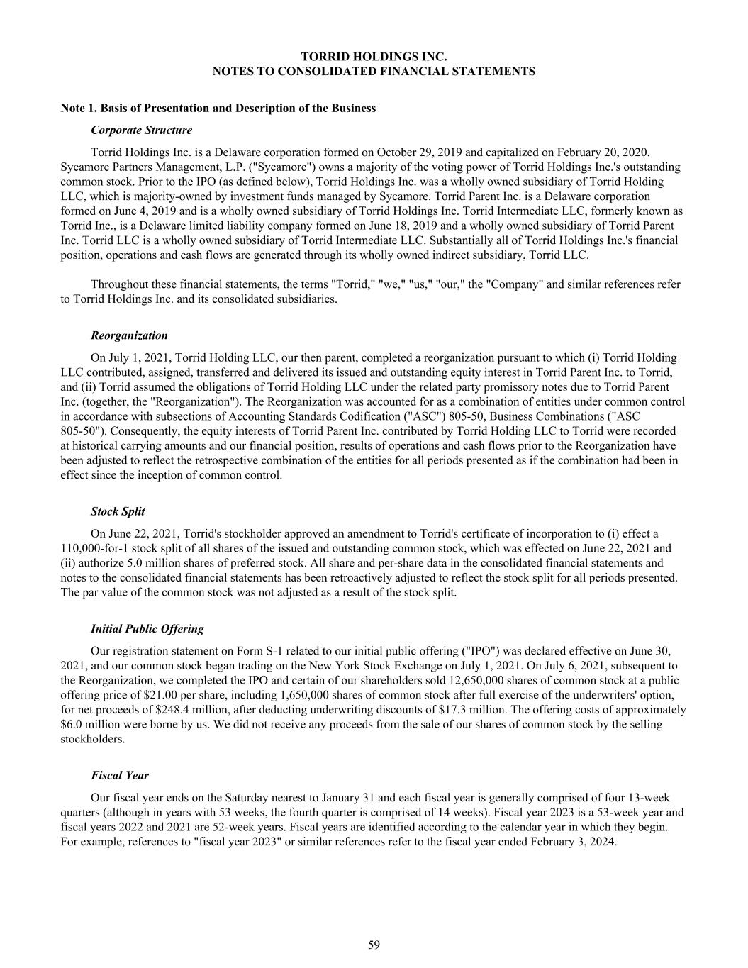 Torrid Holdings Inc.合并财务报表附注附注1。介绍和描述业务的基础公司结构StructureTorrid Holdings Inc.是一家特拉华州公司,成立于2019年10月29日,于2020年2月20日资本化。Sycamore Partners Management,L.P.(“Sycamore”)拥有Torrid Holdings Inc.已发行普通股的多数投票权。在首次公开募股(定义见下文)之前,Torrid Holdings Inc.是Torrid Holding LLC的全资子公司,后者由Sycamore管理的投资基金持有多数股权。Torrid Parent Inc.是一家特拉华州公司,成立于2019年6月4日,是Torrid Holdings Inc. Torrid Intermediate LLC(原名丨Torrid Inc.)的全资子公司,是一家特拉华州有限责任公司,成立于2019年6月18日,是Torrid Parent Inc.的全资子公司。Torrid LLC是Torrid Intermediate LLC的全资子公司。Torrid Holdings Inc.的几乎所有财务状况、运营和现金流都是通过其全资间接子公司Torrid LLC产生的。纵观这些财务报表,“Torrid”、“我们”、“我们”、“我们的”、“公司”和类似提法均指Torrid Holdings Inc.及其合并子公司。重组于2021年7月1日,我们当时的母公司Torrid Holding LLC完成重组,据此(i)Torrid Holding LLC向Torrid贡献、转让、转让和交付其在Torrid Parent Inc.的已发行和未偿还的股权,以及(ii)Torrid承担Torrid Holding LLC在应付Torrid Parent Inc.的关联方本票项下的义务(统称“重组”)。此次重组按照会计准则编纂(“ASC”)805-50、企业合并(“ASC 805-50”)的子节作为同一控制下实体的合并进行会计处理。因此,Torrid Holding LLC向Torrid贡献的Torrid Parent Inc.的股权按历史账面金额入账,我们在重组前的财务状况、经营业绩和现金流量已进行调整,以反映所有呈报期间的实体的追溯合并,就好像合并自共同控制开始以来一直有效一样。股票分割于2021年6月22日,Torrid的股东批准了对Torrid公司注册证书的修订,以(i)对已发行和已发行普通股的所有股份进行110,000比1的股票分割,该修订于2021年6月22日生效,并(ii)授权500万股优先股。合并财务报表和合并财务报表附注中的所有股份和每股数据均已追溯调整,以反映所有呈报期间的股票分割情况。普通股的面值没有因股票分割而调整。首次公开发行我们在表格S-1上与我们的首次公开发行(“IPO”)相关的登记声明已于2021年6月30日宣布生效,我们的普通股于2021年7月1日开始在纽约证券交易所交易。2021年7月6日,在重组之后,我们完成了IPO,我们的某些股东以每股21.00美元的公开发行价格出售了12,650,000股普通股,其中包括完全行使承销商选择权后的1,650,000股普通股,扣除1730万美元的承销折扣后的净收益为2.484亿美元。约600万美元的发行费用由我们承担。我们没有从出售股东出售我们的普通股股份中获得任何收益。财政年度我们的财政年度在最接近1月31日的星期六结束,每个财政年度通常由四个13周的季度组成(尽管在有53周的年份,第四季度由14周组成)。2023财年是53周的一年,2022和2021财年是52周的一年。财政年度根据其开始的日历年确定。例如,提及“2023财年”或类似的提法是指截至2024年2月3日的财年。59