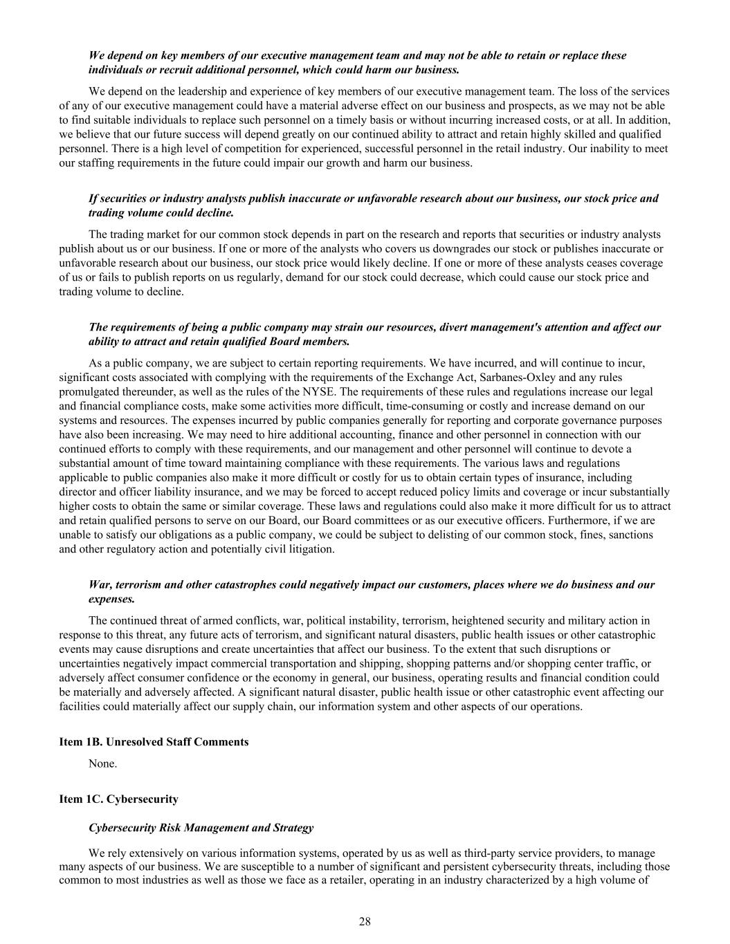 我们依赖于我们执行管理团队的关键成员,可能无法保留或替换这些人或招聘额外人员,这可能会损害我们的业务。我们依赖于我们执行管理团队关键成员的领导能力和经验。失去我们任何执行管理层的服务可能会对我们的业务和前景产生重大不利影响,因为我们可能无法及时找到合适的个人来替换这些人员,或者不会产生增加的成本,或者根本无法做到。此外,我们相信,我们未来的成功将在很大程度上取决于我们持续吸引和留住高技能和合格人才的能力。零售行业对有经验、成功的人员竞争激烈。我们未来无法满足我们的人员配置要求可能会损害我们的增长并损害我们的业务。如果证券或行业分析师发布关于我们业务的不准确或不利的研究,我们的股价和交易量可能会下降。我们普通股的交易市场部分取决于证券或行业分析师发布的关于我们或我们业务的研究和报告。如果覆盖我们的一位或多位分析师下调我们的股票评级或发布关于我们业务的不准确或不利的研究,我们的股价很可能会下跌。如果这些分析师中的一位或多位停止对我们的报道或未能定期发布关于我们的报告,对我们股票的需求可能会减少,这可能会导致我们的股价和交易量下降。作为一家上市公司的要求可能会使我们的资源紧张,转移管理层的注意力,并影响我们吸引和留住合格董事会成员的能力。作为一家上市公司,我们受到某些报告要求的约束。我们已经承担并将继续承担与遵守《交易法》、《萨班斯-奥克斯利法案》和根据该法案颁布的任何规则以及纽约证券交易所规则的要求相关的重大成本。这些规章制度的要求增加了我们的法律和财务合规成本,使一些活动更加困难、耗时或成本更高,并增加了对我们的系统和资源的需求。公众公司一般为报告和公司治理目的而产生的费用也一直在增加。我们可能需要雇用额外的会计、财务和其他人员,以配合我们继续努力遵守这些要求,我们的管理层和其他人员将继续投入大量时间来保持遵守这些要求。适用于上市公司的各种法律法规也使我们更难或成本更高地获得某些类型的保险,包括董事和高级职员责任保险,我们可能被迫接受降低的保单限额和承保范围,或为获得相同或相似的承保范围而承担更高的成本。这些法律法规也可能使我们更难吸引和留住合格的人在我们的董事会、我们的董事会委员会或作为我们的执行官任职。此外,如果我们无法履行作为一家上市公司的义务,我们可能会受到普通股退市、罚款、制裁和其他监管行动以及潜在的民事诉讼。战争、恐怖主义和其他灾难可能会对我们的客户、我们开展业务的地方和我们的开支产生负面影响。武装冲突、战争、政治不稳定、恐怖主义的持续威胁、为应对这一威胁而加强的安全和军事行动、未来的任何恐怖主义行为,以及重大自然灾害、公共卫生问题或其他灾难性事件,都可能造成干扰并产生影响我们业务的不确定性。如果此类中断或不确定性对商业运输和航运、购物模式和/或购物中心交通产生负面影响,或对消费者信心或整体经济产生负面影响,我们的业务、经营业绩和财务状况可能会受到重大不利影响。影响我们设施的重大自然灾害、公共卫生问题或其他灾难性事件可能会对我们的供应链、我们的信息系统和我们运营的其他方面产生重大影响。项目1b。未解决的员工评论无。项目1c。网络安全网络安全风险管理和战略我们广泛依赖各种信息系统,由我们以及第三方服务提供商运营,以管理我们业务的许多方面。我们很容易受到一系列重大且持续存在的网络安全威胁的影响,包括大多数行业常见的威胁以及我们作为零售商所面临的威胁,这些威胁在一个以28的高交易量为特征的行业中运营