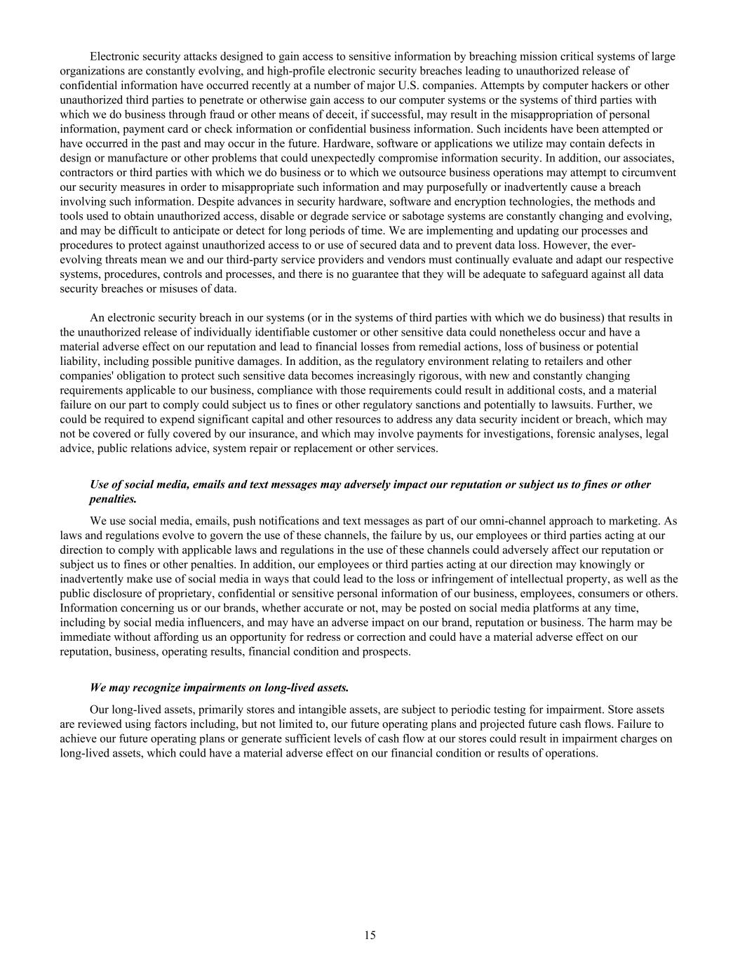 旨在通过破坏大型组织的关键任务系统来获取敏感信息的电子安全攻击正在不断演变,最近在一些美国大公司发生了导致未经授权发布机密信息的备受瞩目的电子安全漏洞。计算机黑客或其他未经授权的第三方企图通过欺诈或其他欺骗手段渗透或以其他方式获得对我们的计算机系统或与我们有业务往来的第三方系统的访问权限,如果成功,可能会导致个人信息、支付卡或支票信息或机密商业信息被盗用。这类事件过去曾尝试或发生过,未来可能会发生。我们使用的硬件、软件或应用程序可能包含设计或制造方面的缺陷或其他可能意外危及信息安全的问题。此外,我们的联系人、承包商或与我们有业务往来或我们将业务运营外包给的第三方可能试图规避我们的安全措施,以盗用此类信息,并可能故意或无意地导致涉及此类信息的违规行为。尽管安全硬件、软件和加密技术取得了进步,但用于获得未经授权的访问、禁用或降级服务或破坏系统的方法和工具正在不断变化和演变,可能很难在很长一段时间内预测或检测到。我们正在实施和更新我们的流程和程序,以防止未经授权访问或使用安全数据,并防止数据丢失。然而,不断演变的威胁意味着我们和我们的第三方服务提供商和供应商必须不断评估和调整我们各自的系统、程序、控制和流程,并且无法保证它们将足以防范所有数据安全漏洞或数据滥用。尽管如此,在我们的系统(或与我们有业务往来的第三方的系统)中导致未经授权发布可单独识别的客户或其他敏感数据的电子安全漏洞仍可能发生,并对我们的声誉产生重大不利影响,并导致补救行动造成的财务损失、业务损失或潜在责任,包括可能的惩罚性赔偿。此外,随着与零售商和其他公司保护此类敏感数据的义务相关的监管环境变得日益严格,随着新的和不断变化的要求适用于我们的业务,遵守这些要求可能会导致额外的成本,而我们方面的实质性不遵守可能会使我们受到罚款或其他监管制裁,并可能面临诉讼。此外,我们可能被要求花费大量资本和其他资源来解决任何数据安全事件或漏洞,这些可能不在我们的保险范围内或完全覆盖范围内,并且可能涉及支付调查、法医分析、法律建议、公关建议、系统维修或更换或其他服务。使用社交媒体、电子邮件和短信可能会对我们的声誉产生不利影响,或使我们受到罚款或其他处罚。我们使用社交媒体、电子邮件、推送通知和短信作为我们全渠道营销方法的一部分。随着法律法规的演变以规范这些渠道的使用,我们、我们的员工或按照我们的指示行事的第三方在使用这些渠道时未能遵守适用的法律法规可能会对我们的声誉产生不利影响或使我们受到罚款或其他处罚。此外,我们的员工或按照我们的指示行事的第三方可能会有意或无意地使用社交媒体,从而可能导致知识产权的丢失或侵犯,以及公开披露我们的企业、员工、消费者或其他人的专有、机密或敏感的个人信息。有关我们或我们品牌的信息,无论是否准确,都可能随时发布在社交媒体平台上,包括由社交媒体影响者发布,并可能对我们的品牌、声誉或业务产生不利影响。损害可能是立竿见影的,而不会给我们提供补救或纠正的机会,并可能对我们的声誉、业务、经营业绩、财务状况和前景产生重大不利影响。我们可能会确认长期资产的减值。我们的长期资产,主要是商店和无形资产,需要定期进行减值测试。门店资产的审查使用的因素包括但不限于我们未来的运营计划和预计的未来现金流。未能实现我们未来的运营计划或在我们的门店产生足够水平的现金流可能会导致长期资产的减值费用, 这可能对我们的财务状况或经营业绩产生重大不利影响。15