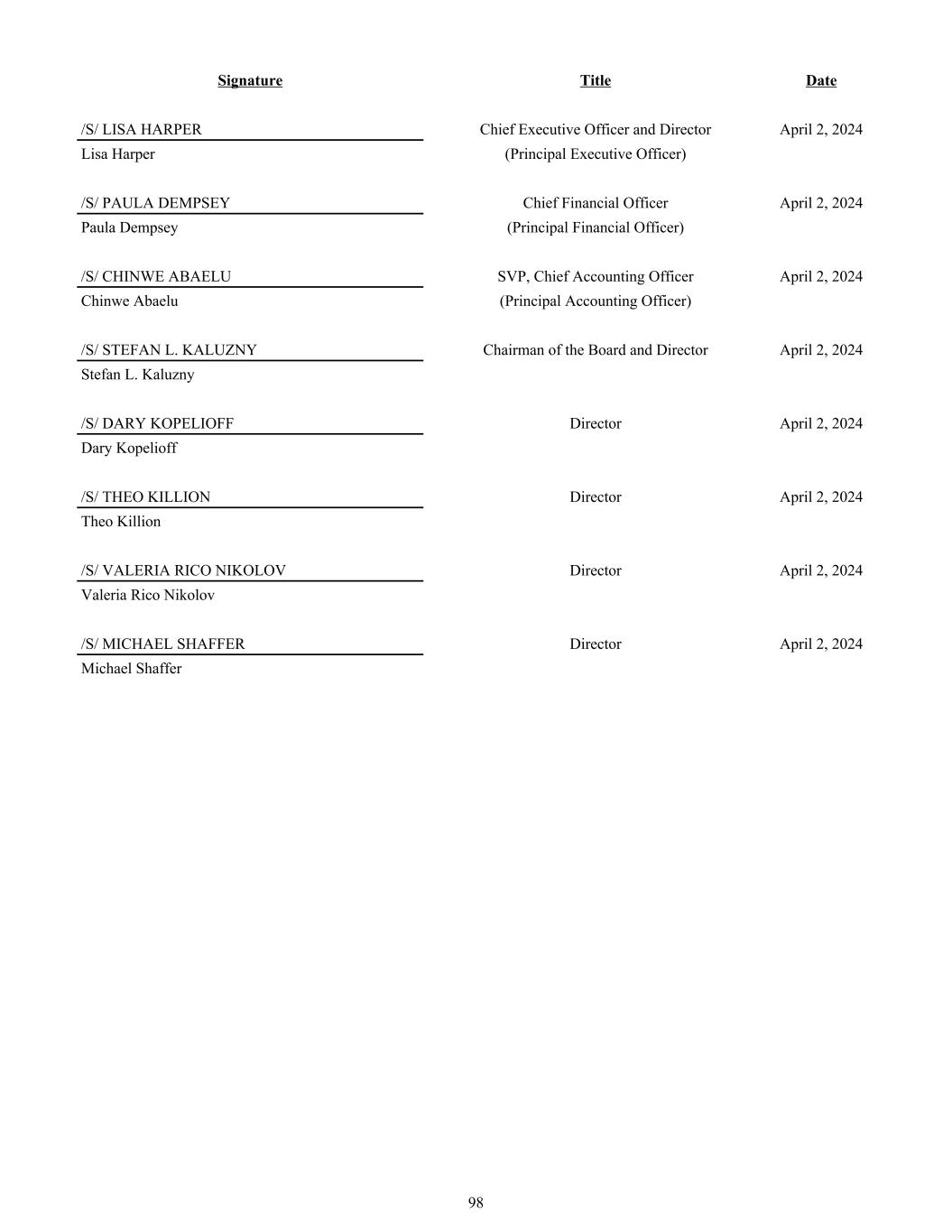 签名标题日期/S/LISA HARPER首席执行官兼董事2024年4月2日Lisa Harper(首席执行官)/S/PAULA DEMPSEY 首席财务官 2024年4月2日Paula Dempsey(首席财务官)/S/CHINWE ABAELU高级副总裁、首席财务官 2024年4月2日Chinwe Abaelu(首席会计官)/S/STEFAN L. KALUZNY董事会主席兼董事2024年4月2日TERM0 L. Kaluzny Stefan L. Kaluzny/S/DARY KOPELIOFF董事2024年4月2日TERM0 Dary Kopelioff Dary Kopelioff/S/THEO KILION董事2024年4月2日丨Theo Killion2024 Michael Shaffer 98