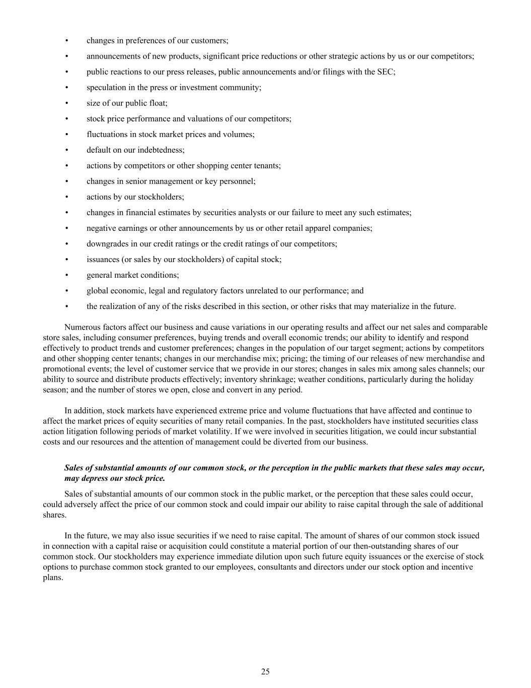 •客户偏好的变化;•我们或竞争对手宣布新产品、大幅降价或其他战略行动;•公众对我们新闻稿的反应,向SEC发布公告和/或提交文件;•新闻界或投资界的猜测;•我们的公众持股量规模;•竞争对手的股价表现和估值;•股票市场价格的波动和数量;•我们的债务违约;•竞争对手或其他购物中心租户的行为;•高级管理层或关键人员的变动;•我们的股东的行为;•证券分析师的财务估计发生变化或我们未能达到任何此类估计;•我们或其他零售服装公司的负收益或其他公告;•我们的信用评级或竞争对手的信用评级被下调;•发行(或我们的股东出售)股本;•一般市场状况;•全球经济,与我们的业绩无关的法律和监管因素;以及•实现本节所述的任何风险,或未来可能实现的其他风险。许多因素影响我们的业务,导致我们的经营业绩出现差异,并影响我们的净销售额和可比商店销售额,包括消费者的偏好,购买趋势和整体经济趋势;我们识别和有效响应产品趋势和客户偏好的能力;我们目标细分市场的人口变化;竞争对手和其他购物中心租户的行动;我们商品组合的变化;定价;我们发布新商品和促销活动的时间;我们在门店提供的客户服务水平;销售渠道之间销售组合的变化;我们有效采购和分销产品的能力;库存收缩;天气状况,特别是在节日期间;以及我们开设的门店数量,在任何时期关闭和转换。此外,股票市场经历了极端的价量波动,影响并持续影响着多家零售企业权益类证券的市场价格。过去,随着市场波动时期,股东会提起证券集体诉讼。如果我们卷入证券诉讼,我们可能会产生大量成本,我们的资源和管理层的注意力可能会从我们的业务中转移。大量出售我们的普通股,或在公开市场上认为这些出售可能发生,可能会压低我们的股价。在公开市场上大量出售我们的普通股,或认为这些出售可能发生,可能会对我们普通股的价格产生不利影响,并可能削弱我们通过出售额外股份筹集资金的能力。未来,如果需要筹集资金,我们也可能会发行证券。与融资或收购相关的我们发行的普通股的股份数量可能构成我们当时已发行普通股的重要部分。我们的股东可能会在此类未来股票发行或行使股票期权以购买根据我们的股票期权和激励计划授予我们的员工、顾问和董事的普通股时立即遭到稀释。25