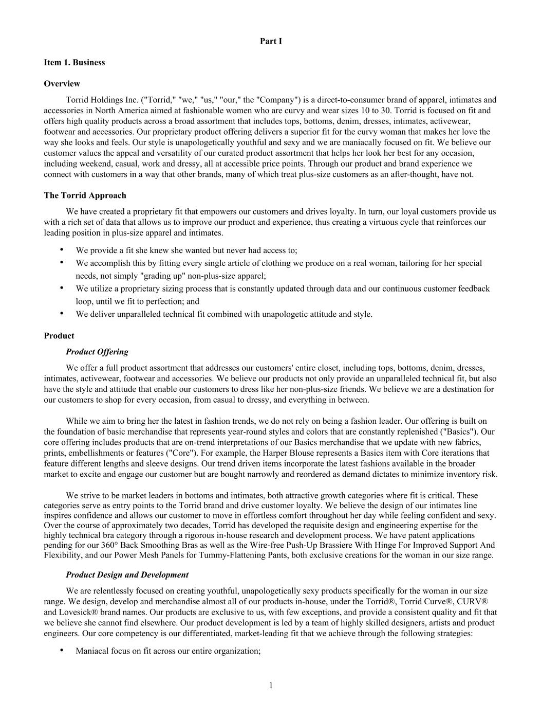 第一部分第1项。业务概览Torrid Holdings Inc.(“Torrid Holdings Inc.”)(“Torrid”、“我们”、“我们”、“我们的”、“公司”)是北美一个直接面向消费者的服装、贴身衣物和配饰品牌,面向曲线美、穿10到30码的时尚女性。Torrid专注于合身,提供包括上衣、下装、牛仔布、连衣裙、贴身内衣、运动服、鞋类和配饰在内的广泛种类的高质量产品。我们的专有产品为曲线优美的女性提供了一种优越的贴合性,这让她喜欢她的外表和感觉。我们的风格是毫无歉意的年轻和性感,我们疯狂地专注于合身。我们相信,我们的客户重视我们精心策划的产品分类的吸引力和多功能性,这有助于她在任何场合看起来都是最好的,包括周末、休闲、工作和着装,所有这些都在平易近人的价位上。通过我们的产品和品牌体验,我们以其他品牌所没有的方式与客户建立联系,其中许多品牌将大码客户视为事后诸葛亮。Torrid方法我们创造了一种专有的契合度,为我们的客户赋能并推动忠诚度。反过来,我们的忠实客户为我们提供了一组丰富的数据,使我们能够改善我们的产品和体验,从而创造了一个良性循环,巩固了我们在大码服装和贴身内衣的领先地位。•我们提供她知道自己想要但从未接触到的合身款;•我们通过将我们生产的每一件衣服都适合真实的女性来实现这一点,为她的特殊需求量身定制,而不是简单地“升级”非大码服装;•我们采用专有的尺码工艺,通过数据和我们持续的客户反馈循环不断更新,直到我们完美合身;•我们提供无与伦比的技术合身款,并结合毫无歉意的态度和风格。产品产品供应我们提供完整的产品分类,满足客户的整个衣橱,包括上衣、下装、牛仔布、连衣裙、贴身内衣、运动服、鞋类和配饰。我们相信我们的产品不仅提供了无与伦比的技术贴合度,而且还具有使我们的客户能够穿得像她的非大码朋友的风格和态度。我们相信,我们是客户在每一个场合购物的目的地,从休闲到着装,以及介于两者之间的一切。虽然我们的目标是为她带来最新的时尚趋势,但我们并不依赖于成为时尚领导者。我们的产品建立在基本商品的基础上,这些商品代表了常年不断补充的款式和颜色(“Basics”)。我们的核心产品包括对我们的Basics商品进行潮流诠释的产品,我们更新了新的面料、印花、点缀或功能(“Core”)。例如,Harper Blouse代表了一款具有不同长度和袖子设计的核心迭代的Basics单品。我们的趋势驱动商品包含了更广泛市场上可用的最新时尚,以激发和吸引我们的客户,但购买范围狭窄,并根据需求要求重新订购,以最大限度地降低库存风险。我们努力成为底部和贴身产品的市场领导者,这两个有吸引力的增长类别都非常适合。这些品类作为Torrid品牌的切入点,并推动客户忠诚度。我们相信,我们的intimates系列的设计可以激发信心,让我们的客户在一天中轻松舒适地移动,同时感到自信和性感。在大约二十年的时间里,Torrid通过严格的内部研发过程,为高度技术性的文胸类别开发了必要的设计和工程专业知识。我们的360 °背部平滑文胸以及带有铰链的无线俯卧撑胸罩正在申请专利,以提高支撑和灵活性,我们的Power网状面板用于腹部平坦裤,这两个都是我们尺寸范围内女性的独家创作。产品设计和开发我们不懈地专注于专为我们尺寸范围内的女性打造年轻、毫无歉意的性感产品。我们在内部设计、开发和销售几乎所有的产品,品牌名称为Torrid ®、Torrid Curve ®、CURV ®和Lovesick ®。我们的产品是我们的专属产品,几乎没有例外,并提供了我们认为她在其他地方找不到的始终如一的质量和贴合性。我们的产品开发由一支高技能的设计师、艺术家和产品工程师团队领导。我们的核心竞争力是我们通过以下战略实现的差异化、市场领先的契合度:•在我们整个组织中疯狂地专注于契合度;1