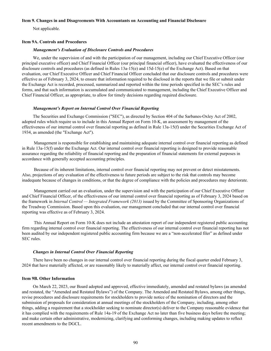 项目9。与会计师在会计和财务披露方面的变更和分歧不适用。项目9a。控制和程序管理层对披露控制和程序的评估我们在管理层(包括我们的首席执行官(我们的首席执行官)和首席财务官(我们的首席财务官))的监督和参与下,评估了我们的披露控制和程序(定义见《交易法》规则13a-15(e)和15d-15(e))的有效性。基于该评估,我们的首席执行官和首席财务官得出结论,我们的披露控制和程序自2024年2月3日起生效,以确保我们根据《交易法》提交或提交的报告中要求披露的信息在SEC规则和表格规定的时间段内得到记录、处理、汇总和报告,并且这些信息得到积累并传达给管理层,包括首席执行官和首席财务官(视情况而定),以便及时就要求的披露做出决定。管理层关于财务报告内部控制的报告美国证券交易委员会(“SEC”)根据2002年《萨班斯-奥克斯利法案》第404条的指示,通过了一些规则,要求我们在本年度报告的10-K表格中包括管理层对经修订的1934年《证券交易法》(“交易法”)第13a-15(f)条所定义的财务报告内部控制有效性的评估。管理层负责根据《交易法》第13a-15(f)条的规定,建立和维持对财务报告的充分内部控制。我们对财务报告的内部控制旨在为财务报告的可靠性和根据公认会计原则为外部目的编制财务报表提供合理保证。财务报告内部控制由于其固有的局限性,可能无法防止或发现错报。此外,对未来期间有效性的任何评估的预测都受到以下风险的影响:由于条件的变化,控制可能变得不充分,或者政策和程序的遵守程度可能会恶化。管理层在首席执行官和首席财务官的监督和参与下,根据Treadway委员会发起组织委员会发布的《内部控制中的框架—综合框架(2013)》,对截至2024年2月3日我们对财务报告的内部控制的有效性进行了评估。基于这一评估,我们的管理层得出结论,截至2024年2月3日,我们对财务报告的内部控制是有效的。这份10-K表格年度报告不包括我们的独立注册会计师事务所关于财务报告内部控制的鉴证报告。我们对财务报告的内部控制的有效性未经我们的独立注册公共会计师事务所审计,因为我们是SEC规则所定义的“非加速申报人”。财务报告内部控制的变化在截至2024年2月3日的财政季度中,我们对财务报告的内部控制没有发生任何对我们的财务报告内部控制产生重大影响或合理可能产生重大影响的变化。项目9b。其他资料于2023年3月22日,我们的董事会通过及批准、即时生效、经修订及重述的公司章程(经修订及重述,“经修订及重述的章程”)。经修订和重述的章程,除其他外,修订了股东提供董事提名通知和提交提案以供公司股东年度会议审议的程序和披露要求,其中包括(其中包括)增加一项要求,即寻求提名董事的股东最迟在会议召开前五个工作日向公司提供合理证据,证明其已遵守《交易法》第14a-19条的要求;并作出某些其他行政、现代化、澄清和符合要求的变更,包括进行更新以反映最近对DGCL的修订。90