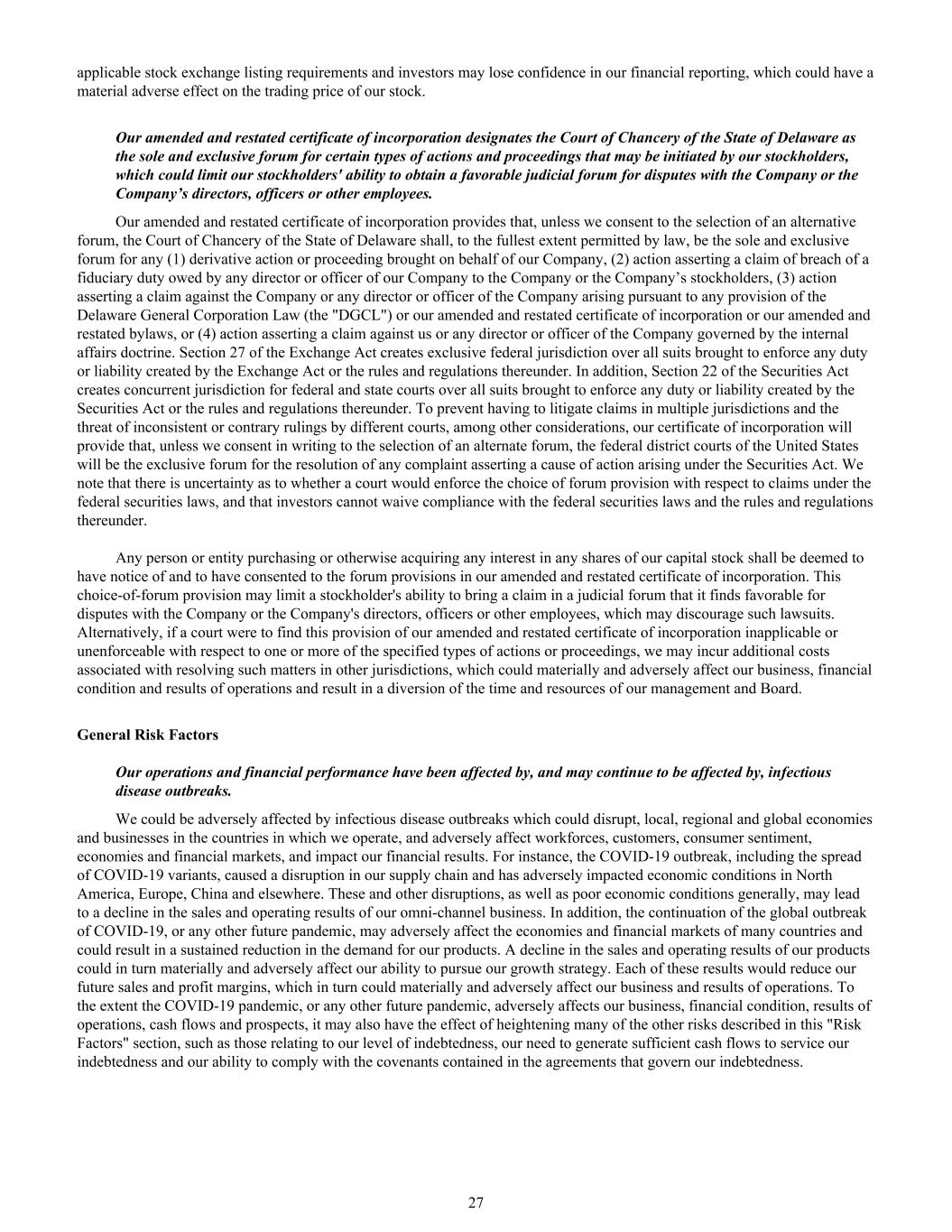 适用的证券交易所上市要求和投资者可能对我们的财务报告失去信心,这可能对我们股票的交易价格产生重大不利影响。我们经修订和重述的公司注册证书指定特拉华州衡平法院为我们的股东可能发起的某些类型的诉讼和程序的唯一和排他性法院,这可能会限制我们的股东就与公司或公司董事、高级职员或其他雇员的纠纷获得有利的司法法院的能力。我们经修订和重述的公司注册证书规定,除非我们同意选择替代法院,否则在法律允许的最大范围内,特拉华州衡平法院将是代表我们公司提起的任何(1)派生诉讼或程序,(2)声称违反我们公司任何董事或高级管理人员对公司或公司股东所负的信托责任的诉讼的唯一和排他性法院,(3)根据《特拉华州一般公司法》(“DGCL”)的任何规定或我们经修订和重述的公司注册证书或我们经修订和重述的章程而对公司或公司任何董事或高级职员提出索赔的诉讼,或(4)根据内部事务原则对我们或公司任何董事或高级职员提出索赔的诉讼。《交易法》第27条对为执行《交易法》或其下的规则和条例产生的任何义务或责任而提起的所有诉讼建立了专属的联邦管辖权。此外,《证券法》第22条规定,联邦法院和州法院对为执行《证券法》或其下的规则和条例产生的任何义务或责任而提起的所有诉讼同时拥有管辖权。为防止必须在多个司法管辖区就索赔提起诉讼以及不同法院做出不一致或相反裁决的威胁,除其他考虑因素外,我们的公司注册证书将规定,除非我们书面同意选择替代法院,否则美国联邦地区法院将是解决任何声称根据《证券法》产生的诉讼因由的投诉的唯一法院。我们注意到,对于法院是否会对联邦证券法下的索赔强制执行法院地选择条款存在不确定性,投资者不能放弃遵守联邦证券法及其下的规则和条例。任何个人或实体购买或以其他方式获得我们股本的任何股份的任何权益,应被视为已通知并已同意我们经修订和重述的公司注册证书中的法院地条款。这一诉讼地选择条款可能会限制股东就与公司或公司董事、高级职员或其他雇员的纠纷向其认为有利的司法法院提起索赔的能力,这可能会阻止此类诉讼。或者,如果法院裁定我们经修订和重述的公司注册证书的这一规定对一种或多种特定类型的诉讼或程序不适用或不可执行,我们可能会产生与在其他司法管辖区解决此类事项相关的额外费用,这可能会对我们的业务、财务状况和经营业绩产生重大不利影响,并导致我们的管理层和董事会的时间和资源被转移。一般风险因素我们的运营和财务表现已经受到并可能继续受到传染病爆发的影响。我们可能会受到传染病爆发的不利影响,这可能会扰乱我们经营所在国家的地方、区域和全球经济和企业,并对劳动力、客户、消费者情绪、经济和金融市场产生不利影响,并影响我们的财务业绩。例如,新冠疫情的爆发,包括新冠变种的传播,导致我们的供应链中断,并对北美、欧洲、中国和其他地区的经济状况产生了不利影响。这些和其他中断,以及普遍的经济状况不佳,可能会导致我们全渠道业务的销售和经营业绩下降。此外,全球新冠肺炎疫情的持续爆发,或未来任何其他大流行病,都可能对许多国家的经济和金融市场产生不利影响,并可能导致对我们产品的需求持续减少。我们产品的销售和经营业绩下降可能反过来对我们追求增长战略的能力产生重大不利影响。这些结果中的每一个都会降低我们未来的销售额和利润率, 这反过来可能对我们的业务和经营业绩产生重大不利影响。如果新冠疫情大流行或任何其他未来大流行对我们的业务、财务状况、经营业绩、现金流和前景产生不利影响,它还可能产生加剧本“风险因素”部分中描述的许多其他风险的影响,例如与我们的债务水平、我们需要产生足够的现金流来偿还我们的债务以及我们遵守管理我们债务的协议中所载契约的能力有关的风险。27