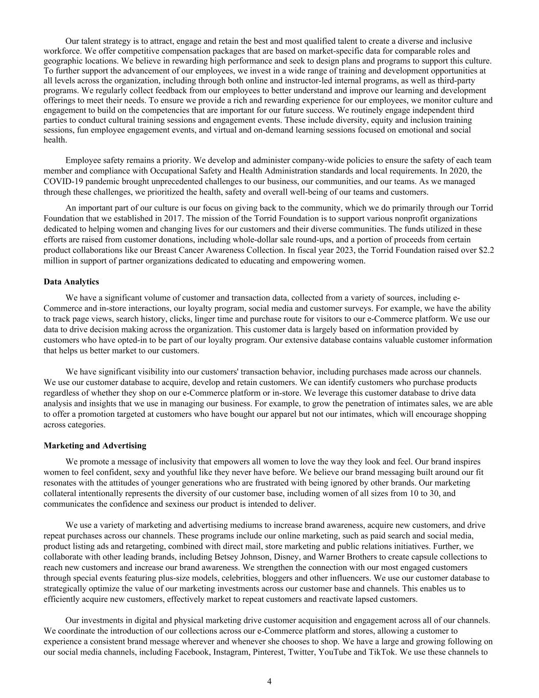 我们的人才战略是吸引、聘用和留住最优秀、最合格的人才,以创建一个多元化和包容性的员工队伍。我们提供具有竞争力的薪酬方案,这些薪酬方案基于可比角色和地理位置的特定市场数据。我们相信奖励高绩效,并寻求设计计划和计划来支持这种文化。为了进一步支持我们员工的晋升,我们在整个组织的各个级别上投资了广泛的培训和发展机会,包括通过在线和导师主导的内部计划,以及第三方计划。我们定期收集员工的反馈,以更好地理解和改进我们的学习和发展产品,以满足他们的需求。为确保我们为员工提供丰富且有回报的体验,我们监控文化和敬业度,以建立对我们未来成功很重要的能力。我们经常聘请独立的第三方举办文化培训课程和参与活动。其中包括多样性、公平和包容性培训课程、有趣的员工参与活动,以及专注于情绪和社会健康的虚拟和按需学习课程。员工安全仍然是优先事项。我们制定和管理全公司政策,以确保每个团队成员的安全,并遵守职业安全与健康管理局标准和当地要求。2020年,新冠疫情给我们的业务、社区和团队带来了前所未有的挑战。当我们应对这些挑战时,我们优先考虑团队和客户的健康、安全和整体福祉。我们文化的一个重要部分是我们专注于回馈社区,我们主要通过我们在2017年成立的Torrid基金会来做到这一点。Torrid基金会的使命是支持各种致力于帮助妇女并为我们的客户及其多元化社区改变生活的非营利组织。这些努力中使用的资金来自客户捐赠,包括整美元的销售综述,以及某些产品合作的部分收益,例如我们的乳腺癌意识收藏。2023财年,Torrid基金会筹集了超过220万美元,用于支持致力于教育和赋予妇女权力的伙伴组织。数据分析我们有大量的客户和交易数据,这些数据是从各种来源收集的,包括电子商务和店内互动、我们的忠诚度计划、社交媒体和客户调查。例如,我们有能力为访问我们电子商务平台的访客跟踪页面浏览量、搜索历史、点击次数、逗留时间和购买路线。我们使用我们的数据来推动整个组织的决策。这些客户数据主要基于选择加入我们忠诚度计划的客户提供的信息。我们广泛的数据库包含有价值的客户信息,有助于我们更好地向客户进行营销。我们对客户的交易行为有显着的可见性,包括通过我们的渠道进行的购买。我们利用我们的客户数据库来获取、发展和留住客户。我们可以识别购买产品的客户,无论他们是在我们的电商平台购物还是在店内购物。我们利用这个客户数据库来推动我们在管理业务时使用的数据分析和洞察力。例如,为了提高贴身衣物销售的渗透率,我们能够针对购买了我们的服装但没有购买我们的贴身衣物的顾客提供促销活动,这将鼓励跨品类购物。营销和广告我们宣传一种包容性的信息,让所有女性都能热爱自己的外表和感觉。我们的品牌激励女性感受到前所未有的自信、性感和年轻。我们相信,我们围绕我们的合身性建立的品牌信息与年轻一代的态度产生了共鸣,他们对被其他品牌忽视感到沮丧。我们的营销宣传品有意代表了我们客户群的多样性,包括从10岁到30岁的各种规模的女性,并传达了我们的产品旨在传递的自信和性感。我们使用各种营销和广告媒介来提高品牌知名度,获取新客户,并在我们的渠道中推动重复购买。这些计划包括我们的在线营销,例如付费搜索和社交媒体、产品列表广告和重新定位,以及直接邮寄、商店营销和公关举措。此外,我们与其他领先品牌合作,包括Betsey Johnson、迪士尼和华纳兄弟,创建胶囊系列以接触新客户并提高我们的品牌知名度。我们通过以大码模特、名人、 博主和其他有影响力的人。我们使用我们的客户数据库来战略性地优化我们在整个客户群和渠道的营销投资的价值。这使我们能够高效获取新客户,有效营销回头客并重新激活流失的客户。我们在数字和实体营销方面的投资推动了我们所有渠道的客户获取和参与。我们协调在我们的电子商务平台和商店中引入我们的系列,让客户无论何时何地选择购物,都能体验到一致的品牌信息。我们在社交媒体渠道上拥有大量且不断增长的追随者,包括Facebook、Instagram、Pinterest、Twitter、YouTube和TikTok。我们利用这些渠道来4