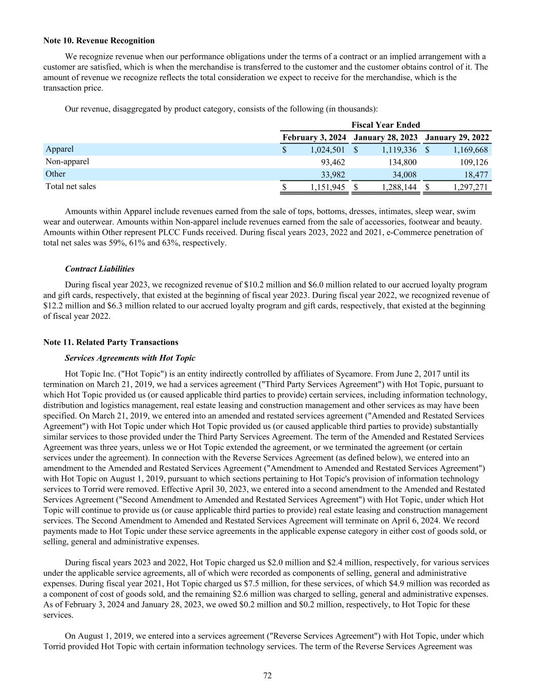 注10。收入确认我们在我们根据合同条款或与客户的默示安排承担的履约义务得到满足时确认收入,这是当商品转让给客户并且客户获得对其控制权时。我们确认的收入金额反映了我们预期收到的商品总对价,即交易价格。我们的收入,按产品类别分类,包括以下(以千为单位):截至2024年2月3日的财政年度2023年1月28日2022年1月29日服装$ 1,024,501 $ 1,119,336 $ 1,169,668非服装93,462134,800109,126其他33,98234,00818,477净销售额总额$ 1,151,945 $ 1,288,144 $ 1,297,271服装中的金额包括销售上衣、下装、连衣裙、贴身衣物、睡衣服、泳装和外套所获得的收入。非服装内的金额包括销售配饰、鞋类和美容所获得的收入。Other中的金额代表收到的PLCC资金。在2023、2022和2021财年,电子商务对总净销售额的渗透率分别为59%、61%和63%。合同负债在2023财年,我们分别确认了与2023财年年初存在的应计忠诚度计划和礼品卡相关的收入1020万美元和600万美元。在2022财年,我们分别确认了与2022财年年初存在的累积忠诚度计划和礼品卡相关的1220万美元和630万美元的收入。注11。与Hot TopicHot Topic股份有限公司(“Hot Topic”)签订的关联交易服务协议是由梧桐树的关联公司间接控制的实体。自2017年6月2日至2019年3月21日终止,我们与Hot Topic订立了服务协议(“第三方服务协议”),据此,Hot Topic向我们提供(或导致适用的第三方提供)某些服务,包括信息技术、分销和物流管理、房地产租赁和施工管理以及可能已指明的其他服务。于2019年3月21日,我们与Hot Topic订立经修订及重列的服务协议(“经修订及重列的服务协议”),据此,Hot Topic向我们提供(或促使适用的第三方提供)与根据第三方服务协议提供的服务大致相似的服务。经修订和重述的服务协议的期限为三年,除非我们或Hot Topic延长协议,或我们终止协议(或协议下的某些服务)。就反向服务协议(定义见下文)而言,我们于2019年8月1日与Hot Topic订立经修订及重述服务协议的修订(“经修订及重述服务协议的修订”),据此,有关Hot Topic向Torrid提供信息技术服务的章节已被删除。自2023年4月30日起,我们订立第二次修订经修订及重述的服务协议(“经修订及重述的服务协议的第二次修订”)并附有Hot Topic,据此,Hot Topic将继续向我们提供(或促使适用的第三方提供)房地产租赁和建设管理服务。经修订和重述的服务协议的第二次修订将于2024年4月6日终止。我们将根据这些服务协议向Hot Topic支付的款项在适用的费用类别中记录在已售商品成本或销售、一般和管理费用中。在2023财年和2022财年,Hot Topic根据适用的服务协议为各种服务分别收取了200万美元和240万美元的费用,所有这些费用都记录为销售、一般和管理费用的组成部分。2021财年,Hot Topic为这些服务收取了750万美元的费用,其中490万美元记为销售成本的组成部分,其余260万美元记为销售、一般和管理费用。截至2024年2月3日和2023年1月28日,我们分别欠Hot Topic这些服务的款项0.2百万美元和0.2百万美元。于2019年8月1日,我们与Hot Topic订立服务协议(“反向服务协议”),根据该协议,Torrid向Hot Topic提供若干信息技术服务。反向服务协议的期限为72