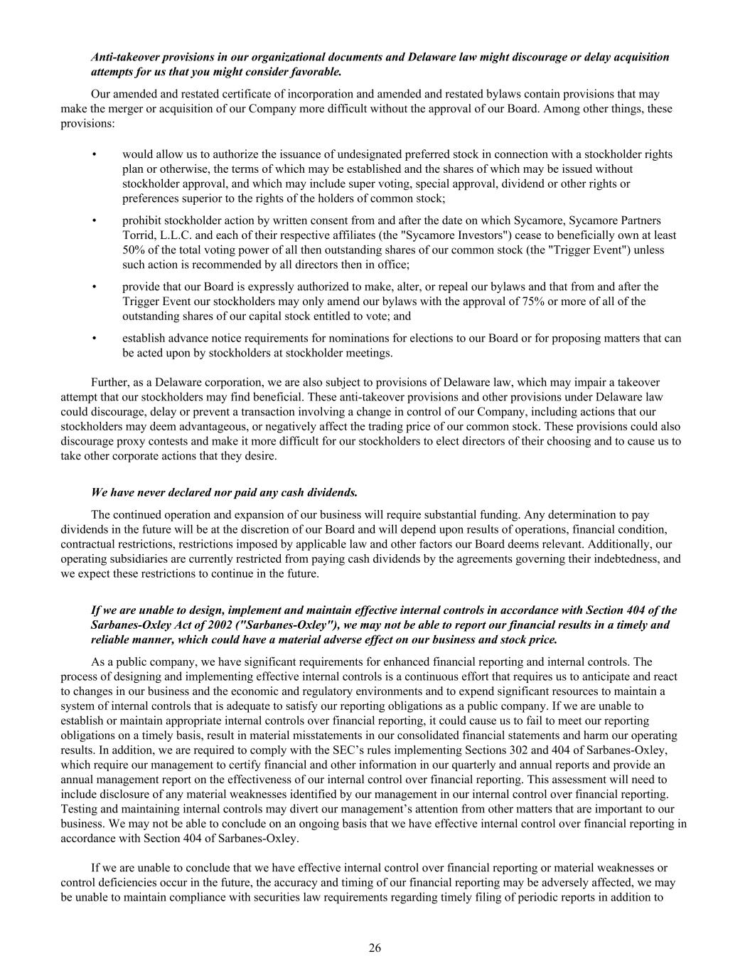 我们的组织文件和特拉华州法律中的反收购条款可能会阻止或延迟您可能认为有利的对我们的收购尝试。我们经修订和重述的公司注册证书以及经修订和重述的章程包含可能使我们公司的合并或收购在未经董事会批准的情况下更加困难的条款。除其他外,这些规定:•将允许我们授权发行与股东权利计划或其他相关的未指定优先股,其条款可能会确立,其股份可以在未经股东批准的情况下发行,其中可能包括超级投票、特别批准、股息或其他优于普通股持有人权利的权利或优先权;•禁止自Sycamore、Sycamore Partners Torrid、L.L.C.及其各自的关联公司(“Sycamore投资者”)不再实益拥有我们普通股当时所有已发行股份总投票权的至少50%(“触发事件”),除非该行动是由当时在任的所有董事建议的;•规定我们的董事会被明确授权作出、更改、或废除我们的章程,并且在触发事件发生后,我们的股东只能在我们有权投票的股本的所有已发行股份的75%或更多获得批准的情况下修改我们的章程;•为董事会选举提名或提出可由股东在股东大会上采取行动的事项制定提前通知要求。此外,作为一家特拉华州公司,我们还受到特拉华州法律规定的约束,这可能会损害我们的股东可能认为有益的收购企图。这些反收购条款和特拉华州法律的其他条款可能会阻止、延迟或阻止涉及我们公司控制权变更的交易,包括我们的股东可能认为有利的行动,或对我们普通股的交易价格产生负面影响。这些规定还可能阻止代理竞争,使我们的股东更难选举他们选择的董事,并导致我们采取他们希望的其他公司行动。我们从未宣布或派发任何现金股息。我们业务的持续运营和扩张将需要大量资金。未来派发股息的任何决定将由董事会酌情决定,并将取决于经营业绩、财务状况、合同限制、适用法律施加的限制以及董事会认为相关的其他因素。此外,我们的运营子公司目前受到管理其债务的协议的限制,无法支付现金股息,我们预计这些限制将在未来继续。如果我们无法根据2002年《萨班斯-奥克斯利法案》(“萨班斯-奥克斯利法案”)第404条设计、实施和维持有效的内部控制,我们可能无法及时可靠地报告我们的财务业绩,这可能对我们的业务和股价产生重大不利影响。作为一家上市公司,我们对加强财务报告和内部控制有重大要求。设计和实施有效内部控制的过程是一项持续的努力,它要求我们预测业务以及经济和监管环境的变化并对其作出反应,并花费大量资源来维持内部控制系统,该系统足以履行我们作为一家上市公司的报告义务。如果我们无法建立或维持对财务报告的适当内部控制,可能会导致我们无法及时履行报告义务,导致我们的合并财务报表出现重大错报,并损害我们的经营业绩。此外,我们还需要遵守SEC实施《萨班斯-奥克斯利法案》第302和404条的规定,这些规定要求我们的管理层在我们的季度和年度报告中认证财务和其他信息,并就我们对财务报告的内部控制的有效性提供年度管理报告。这一评估将需要包括披露我们的管理层在我们对财务报告的内部控制中发现的任何重大缺陷。测试和维护内部控制可能会转移我们管理层对我们业务重要的其他事项的注意力。我们可能无法持续得出结论,根据《萨班斯-奥克斯利法案》第404节,我们对财务报告拥有有效的内部控制。如果我们不能断定我们对财务报告有有效的内部控制或未来发生重大弱点或控制缺陷, 我们财务报告的准确性和时间可能会受到不利影响,我们可能无法保持遵守证券法关于及时提交定期报告的要求,此外26