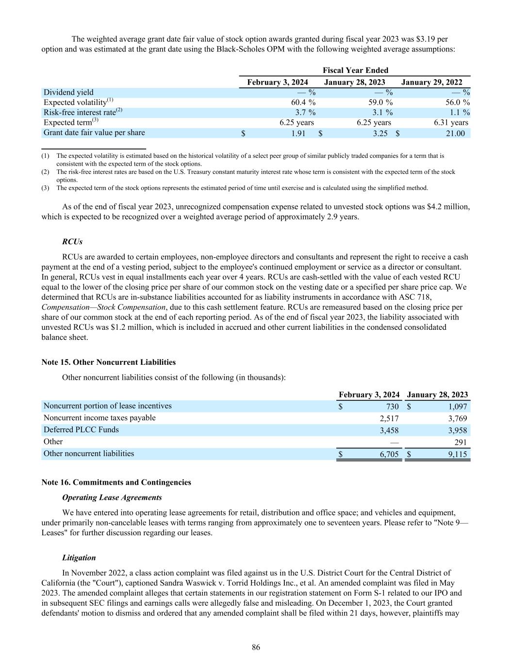 2023财年授予的股票期权奖励的加权平均授予日公允价值为每份期权3.19美元,是在授予日使用Black-Scholes OPM并采用以下加权平均假设进行估计的:截至2024年2月3日的财政年度、2023年1月28日、2023年1月29日,2022年股息收益率—% —% —%预期波动率(1)60.4% 59.0% 56.0%无风险利率(2)3.7% 3.1% 1.1%预期期限(3)6.25年6.25年6.31年授予日每股公允价值$ 1.91 $ 3.25 $ 21.00(1)预期波动率是根据与股票期权预期期限一致的特定同类上市公司同行群体的历史波动率估计的。(2)无风险利率以期限与股票期权预期期限一致的美国国债恒定期限利率为基准。(三)股票期权的预计期限为预计到行权的时间期限,采用简易法计算。截至2023财年末,与未归属股票期权相关的未确认补偿费用为420万美元,预计将在约2.9年的加权平均期间内确认。RCU RCU授予某些雇员、非雇员董事和顾问,并代表在归属期结束时获得现金付款的权利,但须视雇员是否继续受雇或担任董事或顾问的情况而定。一般来说,RCU在4年内每年以等额分期付款的方式归属。RCU以现金结算,每个既得RCU的价值等于归属日期我们普通股的每股收盘价或指定的每股价格上限中的较低者。由于这种现金结算特征,我们根据ASC 718,补偿——股票补偿,确定RCU为作为负债工具核算的实质负债。RCU是根据每个报告期末我们普通股的每股收盘价重新计量的。截至2023财年末,与未归属RCU相关的负债为120万美元,包含在简明综合资产负债表的应计负债和其他流动负债中。注15。其他非流动负债其他非流动负债包括以下(单位:千):2024年2月3日2023年1月28日租赁奖励的非流动部分730美元1097美元应付非流动所得税2,5173,769递延PLCC基金3,4583,958其他— 291其他非流动负债6,705美元9,115美元注16。承诺和或有事项经营租赁协议我们已就零售、分销和办公空间;以及车辆和设备订立经营租赁协议,主要是根据不可撤销的租约,租期约为一年至十七年。有关我们的租约的进一步讨论,请参阅「附注9 —租约」。诉讼于2022年11月,美国加利福尼亚中区地方法院(“法院”)对我们提起集体诉讼,标题为Sandra Waswick诉Torrid Holdings Inc.等人。经修订的诉状于2023年5月提交。修改后的投诉称,我们在表格S-1上的注册声明中与我们的IPO相关的某些陈述以及随后提交给美国证券交易委员会的文件和财报电话会议中的某些陈述据称是虚假和误导性的。2023年12月1日,法院批准了被告的驳回动议,并下令在21天内提交任何修改后的申诉,但原告可以86