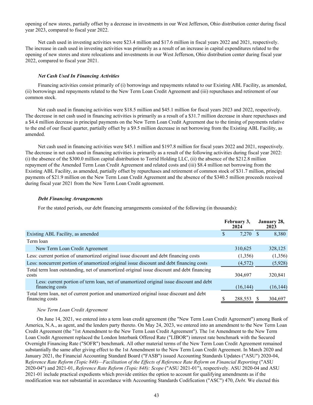 与2022财年相比,2023财年在俄亥俄州西杰斐逊配送中心的投资减少,部分抵消了新店的开设。2022财年和2021财年用于投资活动的现金净额分别为2340万美元和1760万美元。用于投资活动的现金增加主要是由于与2021财年相比,2022财年与开设新店和门店搬迁以及对我们俄亥俄州西杰斐逊配送中心的投资相关的资本支出增加。融资活动中使用的净现金融资活动主要包括(i)与经修订的现有ABL融资相关的借款和还款,(ii)与新定期贷款信贷协议相关的借款和还款,以及(iii)回购和报废我们的普通股。2023财年和2022财年用于融资活动的现金净额分别为1850万美元和4510万美元。用于融资活动的现金净额减少,主要是由于股票回购减少3170万美元,以及由于付款时间相对于我们财政季度末,新定期贷款信贷协议的本金支付减少440万美元,部分被经修订的现有ABL融资的净借款减少950万美元所抵消。2022财年和2021财年用于融资活动的现金净额分别为4510万美元和1.978亿美元。用于筹资活动的现金净额减少主要是由于2022财年开展了以下活动:(i)没有向Torrid Holding LLC分配3亿美元的资本,(ii)没有偿还经修订的定期贷款信贷协议和相关费用的2.128亿美元,以及(iii)经修订的现有ABL融资的840万美元净借款,部分被3170万美元的普通股回购和报废所抵消,新定期贷款信贷协议的本金付款为2190万美元,没有在2021财年从新定期贷款信贷协议收到的3.405亿美元收益。对于所述期间的债务融资安排,我们的债务融资安排包括以下(单位:千):2024年2月3日2023年1月28日现有ABL融资,经修订的7,270美元8,380美元定期贷款新定期贷款信贷协议310,625328,125减:未摊销的原始发行贴现和债务融资成本的流动部分(1,356)(1,356)减:未摊销的原始发行贴现和债务融资成本的非流动部分(4,572)(5,928)未偿还的定期贷款总额,扣除未摊销的原始发行贴现和债务融资成本304,697320,841减:定期贷款的流动部分,扣除未摊销的原始发行折扣和债务融资成本(16,144)(16,144)定期贷款总额,扣除流动部分和未摊销的原始发行折扣和债务融资成本288,553美元304,697美元新的定期贷款信贷协议于2021年6月14日,我们与作为代理人的美国银行(Bank of America,N.A.)及其贷款方签订了定期贷款信贷协议(“新的定期贷款信贷协议”)。于2023年5月24日,我们订立新定期贷款信贷协议的修订(「新定期贷款信贷协议的第1项修订」)。新定期贷款信贷协议第1修正案将伦敦银行间同业拆借利率(“LIBOR”)利率基准替换为有担保隔夜融资利率(“SOFR”)基准。新定期贷款信贷协议的所有其他重要条款在新定期贷款信贷协议第1次修订生效后基本保持不变。2020年3月和2021年1月,财务会计准则委员会(“FASB”)分别发布了会计准则更新(“ASU”)2020-04、参考率改革(主题848)—促进参考率改革对财务报告的影响(“ASU 2020-04”)和2021-01、参考率改革(主题848):范围(“ASU 2021-01”)。ASU 2020-04和ASU 2021-01包含实务权宜之计,为实体提供了根据会计准则编纂(“ASC”)470对符合条件的修订进行会计处理的选择权,如同该修改不是实质性的一样,债务。我们选了这个43