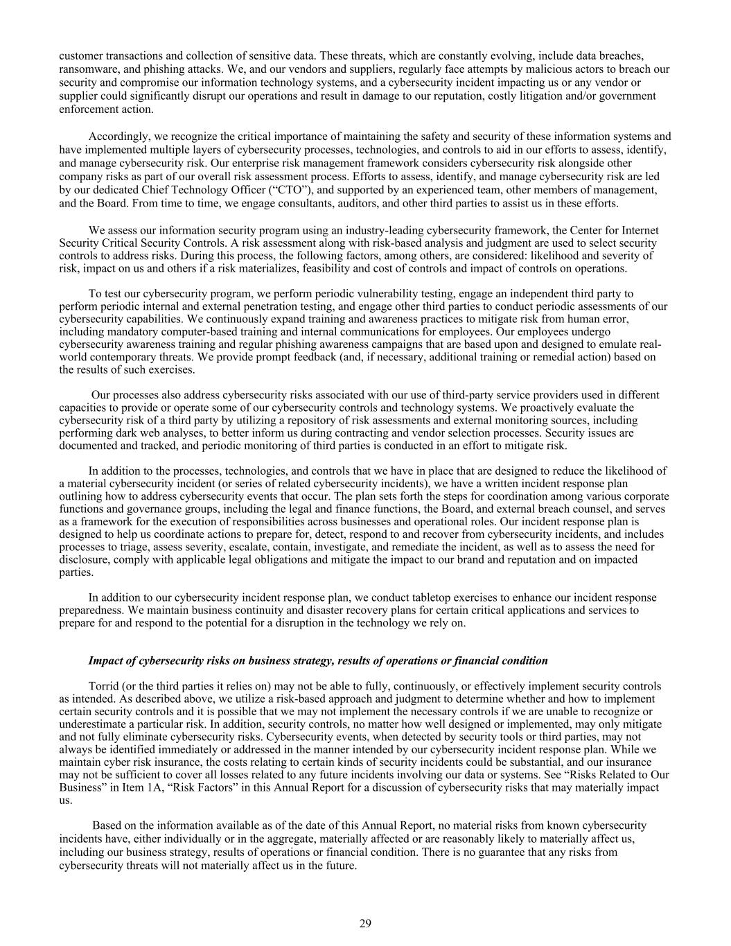 客户交易和敏感数据的收集。这些不断演变的威胁包括数据泄露、勒索软件和网络钓鱼攻击。我们以及我们的供应商和供应商经常面临恶意行为者企图破坏我们的安全并破坏我们的信息技术系统,而影响我们或任何供应商或供应商的网络安全事件可能会严重扰乱我们的运营并导致我们的声誉受损、代价高昂的诉讼和/或政府执法行动。因此,我们认识到维护这些信息系统的安全和保障至关重要,并实施了多层网络安全流程、技术和控制措施,以帮助我们评估、识别和管理网络安全风险的努力。我们的企业风险管理框架将网络安全风险与其他公司风险一起视为我们整体风险评估过程的一部分。评估、识别和管理网络安全风险的工作由我们敬业的首席技术官(“CTO”)领导,并得到经验丰富的团队、管理层其他成员和董事会的支持。我们不时聘请顾问、审计师和其他第三方协助我们开展这些工作。我们使用行业领先的网络安全框架——互联网安全关键安全控制中心——评估我们的信息安全计划。风险评估与基于风险的分析和判断一起用于选择安全控制以应对风险。在此过程中,除其他外,考虑了以下因素:风险的可能性和严重性、如果风险成为现实对我们和其他人的影响、控制的可行性和成本以及控制对运营的影响。为了测试我们的网络安全计划,我们进行定期漏洞测试,聘请独立第三方进行定期内部和外部渗透测试,并聘请其他第三方对我们的网络安全能力进行定期评估。我们不断扩大培训和提高认识做法,以减轻人为错误带来的风险,包括强制性的基于计算机的培训和员工内部沟通。我们的员工接受网络安全意识培训和定期的网络钓鱼意识活动,这些活动基于并旨在模仿现实世界的当代威胁。我们会根据此类演习的结果及时提供反馈(如有必要,还会提供额外的培训或补救行动)。我们的流程还解决了与我们使用以不同身份使用的第三方服务提供商提供或运营我们的一些网络安全控制和技术系统相关的网络安全风险。我们通过利用风险评估和外部监测来源的存储库(包括执行暗网分析)主动评估第三方的网络安全风险,以便在签约和供应商选择过程中更好地告知我们。安全问题被记录和跟踪,并对第三方进行定期监测,以努力降低风险。除了我们为降低重大网络安全事件(或一系列相关网络安全事件)的可能性而制定的流程、技术和控制措施外,我们还有一份书面的事件响应计划,其中概述了如何应对发生的网络安全事件。该计划规定了各公司职能和治理组之间的协调步骤,包括法律和财务职能、董事会和外部违约顾问,并作为跨业务和运营角色执行责任的框架。我们的事件响应计划旨在帮助我们协调行动,为网络安全事件做好准备、发现、应对和恢复,包括对事件进行分类、评估严重性、升级、遏制、调查和补救的流程,以及评估披露的必要性、遵守适用的法律义务并减轻对我们的品牌和声誉以及对受影响各方的影响。除了我们的网络安全事件响应计划,我们进行桌面演习,以加强我们的事件响应准备。我们对某些关键应用程序和服务保持业务连续性和灾难恢复计划,以准备和应对我们所依赖的技术可能出现中断的情况。网络安全风险对业务战略、运营结果或财务状况的影响Torrid(或其所依赖的第三方)可能无法按预期充分、持续或有效地实施安全控制。如上所述,我们利用基于风险的方法和判断来确定是否以及如何实施某些安全控制,如果我们无法识别或低估特定风险,我们可能不会实施必要的控制。此外,安全控制, 无论设计或实施得多么好,可能只会缓解而不是完全消除网络安全风险。网络安全事件,当被安全工具或第三方检测到时,可能不会总是立即被识别或以我们的网络安全事件响应计划预期的方式处理。虽然我们维持网络风险保险,但与某些类型的安全事件相关的成本可能是巨大的,我们的保险可能不足以涵盖与涉及我们的数据或系统的任何未来事件相关的所有损失。有关可能对我们产生重大影响的网络安全风险的讨论,请参阅本年度报告第1a项“风险因素”中的“与我们业务相关的风险”。根据截至本年度报告日期可获得的信息,已知网络安全事件带来的重大风险没有单独或总体上对我们产生重大影响或有合理可能对我们产生重大影响,包括我们的业务战略、经营业绩或财务状况。无法保证来自网络安全威胁的任何风险在未来不会对我们产生实质性影响。29