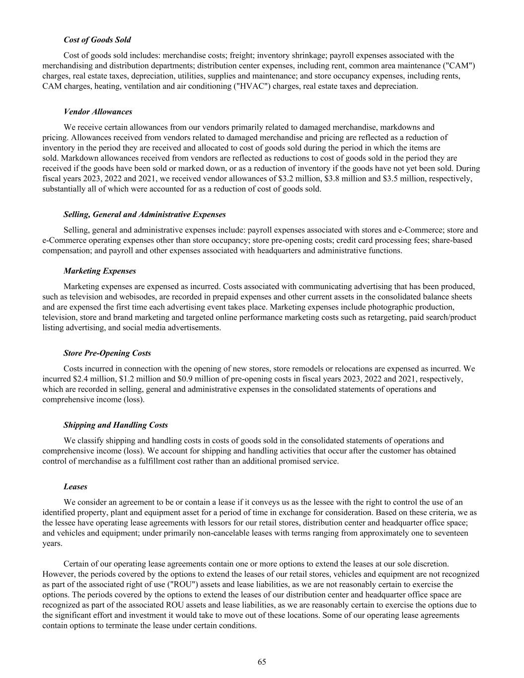 商品销售成本商品销售成本包括:商品成本;运费;库存缩减;与商品销售和分销部门相关的工资支出;配送中心费用,包括租金、公共区域维护(“CAM”)费用、房地产税、折旧、水电、用品和维护;以及商店占用费用,包括租金、CAM费用、供暖、通风和空调(“HVAC”)费用、房地产税和折旧。供应商津贴我们从我们的供应商那里获得某些津贴,主要与损坏的商品、降价和定价有关。从供应商收到的与受损商品和定价有关的备抵反映为收到期间的库存减少,并分配到销售物品期间的销售商品成本中。如果商品已售出或降价,则从供应商收到的降价津贴反映为在其收到期间销售商品成本的减少,如果商品尚未售出,则反映为库存的减少。在2023、2022和2021财年,我们分别收到了320万美元、380万美元和350万美元的供应商津贴,基本上所有这些都作为销售商品成本的减少入账。销售、一般和行政费用销售、一般和行政费用包括:与门店和电子商务相关的工资支出;除门店占用外的门店和电子商务运营费用;门店开业前费用;信用卡处理费;股份补偿;以及与总部和行政职能相关的工资和其他费用。营销费用营销费用在发生时计入费用。与已制作的传播广告相关的成本,例如电视和网络短剧,在合并资产负债表中记入预付费用和其他流动资产,并在每次广告活动首次发生时计入费用。营销费用包括摄影制作、电视、商店和品牌营销以及重定向、付费搜索/产品列表广告、社交媒体广告等有针对性的在线效果营销成本。门店开业前费用与开设新门店、门店改造或搬迁相关的费用在发生时计入费用。我们在2023、2022和2021财年分别产生了240万美元、120万美元和90万美元的开业前成本,这些成本在综合运营和综合收益(亏损)报表的销售、一般和管理费用中记录。运输和装卸成本我们将运输和装卸成本分类在合并经营报表和综合收益(亏损)中的销售商品成本中。我们将客户获得商品控制权后发生的运输和处理活动作为履行成本而不是额外承诺的服务进行核算。租赁我们认为一项协议是或包含一项租赁,如果它向我们作为承租人传达了在一段时间内控制使用已确定的不动产、厂房和设备资产以换取对价的权利。基于这些标准,我们作为承租人与出租人就我们的零售店、配送中心和总部办公空间;以及车辆和设备;主要是根据不可撤销的租约签订经营租赁协议,租期从大约一年到十七年不等。我们的某些经营租赁协议包含一个或多个选项,由我们自行决定延长租约。然而,延长我们零售店、车辆和设备租约的期权所涵盖的期间不被确认为相关使用权(“ROU”)资产和租赁负债的一部分,因为我们无法合理确定行使期权。延长我们的配送中心和总部办公空间租约的选择权所涵盖的期间被确认为相关ROU资产和租赁负债的一部分,因为由于搬出这些地点需要付出大量努力和投资,我们有理由肯定会行使这些选择权。我们的一些经营租赁协议包含在特定条件下终止租赁的选择权。65