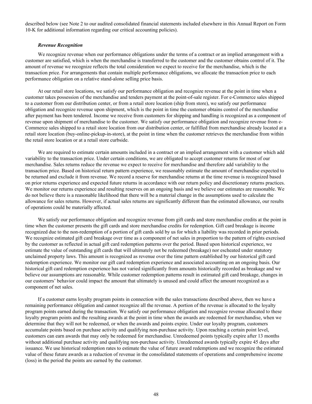如下所述(有关我们关键会计政策的更多信息,请参见本年度报告10-K表其他部分中包含的我们经审计的综合财务报表附注2)。收入确认我们在我们根据合同条款或与客户的默示安排承担的履约义务得到满足时确认收入,这是当商品转让给客户并且客户获得对其控制权时。我们确认的收入金额反映了我们预期收到的商品总对价,即交易价格。对于包含多个履约义务的安排,我们将交易价格按相对单独的售价基础分配给每个履约义务。在我们的零售店地点,我们履行我们的履约义务,并在客户占有商品并在销售点登记处投标付款的时间点确认收入。对于从我们的配送中心发货给客户的电子商务销售,或从零售店位置发货(从商店发货),我们履行履约义务并在发货时确认收入,这是客户在付款投标后获得对商品控制权的时间点。我们从客户收到的用于运输和搬运的收入在向客户运送商品时确认为收入的组成部分。我们履行我们的履约义务,并在客户从零售店位置内或零售店路边取回商品的时间点确认从我们的配送中心运至零售店位置的电子商务销售收入,或从已经位于零售店位置的商品(在线购买-店内提货)中履行的收入。我们需要估计合同或与客户的隐含安排中包含的某些金额,这些金额会增加交易价格的可变性。在特定条件下,我们有义务接受客户对我们大部分商品的退货。销售退货减少了我们预期的商品收入,因此增加了交易价格的可变性。根据历史退货模式经验,我们合理估计预计退货的商品金额,并将其从收入中剔除。我们根据我们的退货政策和酌情退货做法,根据先前的退货经验和预期的未来退货,在确认收入时记录商品退货准备金。我们持续监控我们的退货经验和由此产生的准备金,我们认为我们的估计是合理的。我们认为,用于计算销售退货备抵的假设不存在重大变化的合理可能性。然而,如果实际销售回报与估计备抵有显着差异,我们的经营业绩可能会受到重大影响。我们履行我们的履约义务,并在客户出示礼品卡和商店商品积分进行兑换的时间点确认来自礼品卡和商店商品积分的收入。礼品卡破损是由于我们出售的部分礼品卡未赎回而确认的收入,该部分在前期记录了负债。我们根据该期间实际礼品卡兑换模式所反映的客户行使权利的模式,将随时间推移估计的礼品卡破损确认为净销售额的组成部分。根据历史经验,我们估算了在法定无人认领财产法下最终不会被赎回(破损)或被骗的未偿还礼品卡的价值。该金额在我们的历史礼品卡兑换经验确定的时间模式内确认为收入。我们持续监控我们的礼品卡兑换体验和相关会计。我们的历史礼品卡兑换经验与历史上记录为破损的金额没有显着差异,我们认为我们的假设是合理的。虽然客户赎回模式会导致估计的礼品卡断裂,但我们客户行为的变化可能会影响最终未使用的金额,并可能影响确认为净销售额组成部分的金额。如果客户赚取与上述销售交易相关的忠诚度计划积分,那么我们有剩余的履约义务,无法确认所有收入。收入的一部分分配给交易期间赚取的忠诚度计划积分。我们履行我们的履约义务,并在奖励兑换商品、我们确定不会兑换或奖励和积分到期的时间点确认分配给这些忠诚度计划积分和由此产生的奖励的收入。在我们的忠诚计划下, 客户根据购买活动和符合条件的非购买活动累积积分。在达到一定的积分水平后,客户可以获得可能只能兑换商品的奖励。未兑换的积分通常在13个月后到期,没有额外的购买活动和符合条件的非购买活动。未赎回的奖励通常在发行45天后到期。我们使用历史赎回率来估计未来奖励赎回的价值,我们将这些未来奖励的估计价值确认为在客户赚取积分期间的综合经营报表和综合收益(亏损)中的收入减少。48