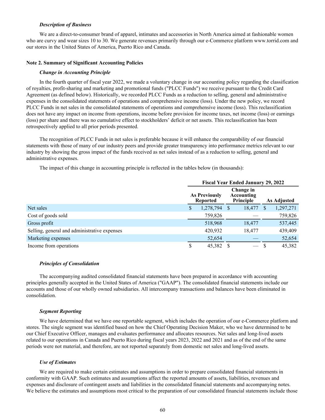 业务描述We is a direct-to-consumer brand of apparel,intimates and accessories in North America aimed at fashion women who are curvy and wear sizes 10 to 30 sizes。我们主要通过我们的电子商务平台www.torrid.com以及我们在美利坚合众国、波多黎各和加拿大的商店产生收入。注2。重大会计政策摘要会计原则变更在2022财年第四季度,我们根据信用卡协议(定义见下文)对我们收到的特许权使用费、利润分享以及营销和促销资金(“PLCC资金”)的分类进行了自愿会计政策变更。从历史上看,我们在综合运营和综合收益(亏损)报表中将PLCC Funds记录为销售、一般和管理费用的减少。在新政策下,我们将PLCC基金的净销售额计入合并经营报表和综合收益(亏损)。这一重新分类对经营收入、所得税拨备前收入、每股净收益(亏损)或收益(亏损)没有任何影响,对股东赤字或净资产也没有累积影响。这一重新分类已追溯适用于所有以前期间的列报。在净销售额中确认PLCC基金更为可取,因为这将提高我们的财务报表与我们许多行业同行的财务报表的可比性,并通过将收到的资金的总影响显示为净销售额而不是作为销售、一般和管理费用的减少,为与我们行业相关的业绩指标提供更大的透明度。这一会计原则变更的影响反映在下表(单位:千):截至2022年1月29日的财政年度按先前报告的调整后净销售额调整后的会计原则变更1,278,794美元18,477美元1,297,271美元销售成本759,826 — 759,826毛利润518,96818,477537,445销售、一般和管理费用420,93218,477439,409营销费用52,654 — 52,654经营收入45,382美元— 45,382美元合并原则随附的经审计的合并财务报表是根据美国公认会计原则(“GAAP”)编制的。综合财务报表包括我们的帐目及我们全资附属公司的帐目。所有公司间交易和余额已在合并中消除。分部报告我们已确定我们有一个可报告分部,其中包括我们的电子商务平台和商店的运营。单一部门是根据首席运营决策者(我们已确定为首席执行官)如何管理和评估绩效以及分配资源来确定的。2023、2022和2021财年以及截至同期末,与我们在加拿大和波多黎各的业务相关的净销售额和长期资产并不重要,因此,没有与国内净销售额和长期资产分开报告。估计的使用我们被要求做出某些估计和假设,以便按照公认会计原则编制合并财务报表。此类估计和假设影响合并财务报表和附注中资产、负债、收入和费用的报告金额以及或有资产和负债的披露。我们认为,对编制我们的合并财务报表最关键的估计和假设包括这60