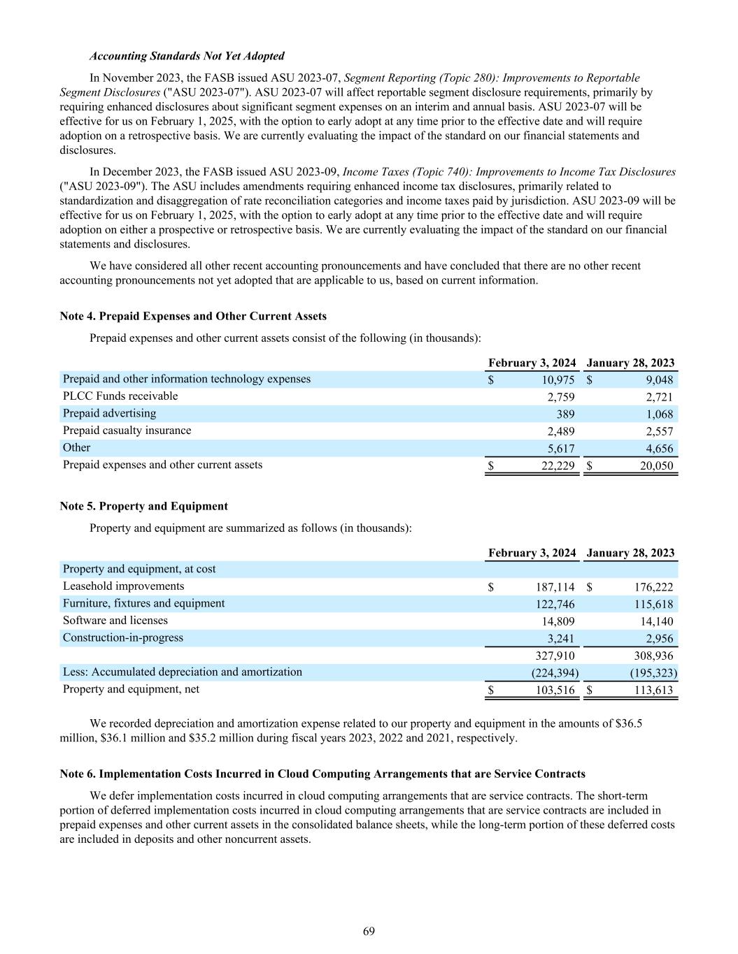 2023年11月尚未采用的会计准则,FASB发布了ASU 2023-07,分部报告(主题280):可报告分部披露的改进(“ASU 2023-07”)。ASU2023-07将影响可报告分部披露要求,主要是要求在中期和年度基础上加强对重大分部费用的披露。ASU2023-07将于2025年2月1日对我们生效,可选择在生效日期之前的任何时间提前采用,并将要求在追溯基础上采用。我们目前正在评估该准则对我们的财务报表和披露的影响。2023年12月,FASB发布了ASU 2023-09,所得税(主题740):所得税披露的改进(“ASU 2023-09”)。ASU包括要求加强所得税披露的修正案,主要涉及税率调节类别的标准化和分类以及按司法管辖区缴纳的所得税。ASU2023-09将于2025年2月1日对我们生效,可选择在生效日期之前的任何时间提前采用,并将要求在预期或追溯基础上采用。我们目前正在评估该准则对我们的财务报表和披露的影响。我们考虑了所有其他最近的会计公告,并得出结论,根据当前信息,没有其他尚未采用的其他最近的会计公告适用于我们。注4。预付费用和其他流动资产预付费用和其他流动资产包括以下各项(单位:千):2024年2月3日2023年1月28日预付和其他信息技术费用10,975美元9,048美元PLCC应收资金2,7592,721预付广告3891,068预付意外伤害保险2,489,557其他5,6174,656预付费用和其他流动资产22,229美元20,050美元注5。财产和设备财产和设备汇总如下(单位:千):2024年2月3日2023年1月28日财产和设备,按成本计算租赁物改良187,114美元176,222美元家具、固定装置和设备122,746115,618软件和许可证14,80914,140在建工程3,2412,956327,910308,936减:累计折旧和摊销(224,394)(195,323)财产和设备,净额103,516美元113,613我们在2023、2022和2021财年分别记录了与我们的财产和设备相关的折旧和摊销费用3650万美元、3610万美元和3520万美元。注6。属于服务合同的云计算安排产生的实施成本我们递延属于服务合同的云计算安排产生的实施成本。属于服务合同的云计算安排产生的递延实施成本的短期部分计入合并资产负债表的预付费用和其他流动资产,而这些递延成本的长期部分计入存款和其他非流动资产。69