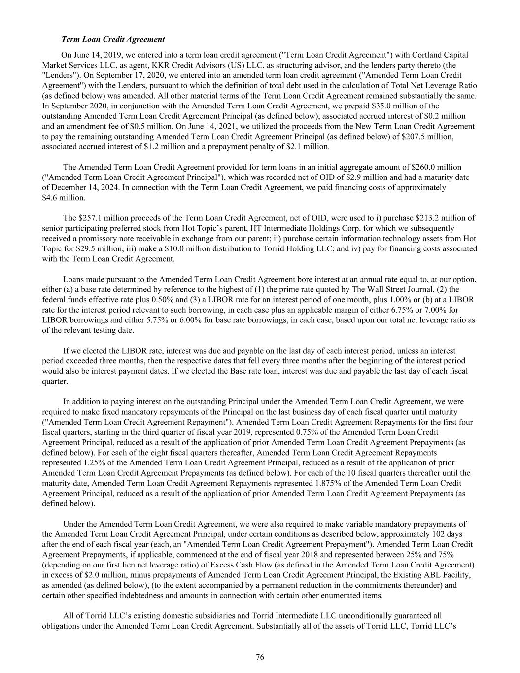 定期贷款信贷协议于2019年6月14日,我们与Cortland Capital Market Services LLC(作为代理)、KKR Credit Advisors(US)LLC(作为结构顾问)以及贷款方(“贷款方”)订立定期贷款信贷协议(“定期贷款信贷协议”)。于2020年9月17日,我们与贷款人订立经修订的定期贷款信贷协议(“经修订的定期贷款信贷协议”),据此,修订了用于计算总净杠杆率(定义见下文)的总债务定义。定期贷款信贷协议的所有其他重要条款基本保持不变。2020年9月,连同经修订的定期贷款信贷协议,我们预付了未偿还的经修订定期贷款信贷协议本金(定义见下文)中的3500万美元、相关应计利息0.2百万美元和修正费0.5百万美元。2021年6月14日,我们使用新定期贷款信贷协议的收益支付了剩余未偿还的经修订定期贷款信贷协议本金(定义见下文)2.075亿美元、相关应计利息120万美元和提前还款罚款210万美元。经修订的定期贷款信贷协议规定了初始总金额为2.60亿美元的定期贷款(“经修订的定期贷款信贷协议本金”),在扣除OID2900万美元后入账,到期日为2024年12月14日。就定期贷款信贷协议而言,我们支付了约460万美元的融资成本。定期贷款信贷协议的2.571亿美元收益(扣除OID)用于i)从Hot Topic的母公司HT Intermediate Holdings Corp.购买2.132亿美元的高级参与优先股,我们随后从母公司收到了作为交换的应收本票;ii)以2950万美元从Hot Topic购买某些信息技术资产;iii)向Torrid Holding LLC进行1000万美元的分配;以及iv)支付与定期贷款信贷协议相关的融资成本。根据经修订的定期贷款信贷协议提供的贷款按年利率计息,我们可选择(a)参考(1)《华尔街日报》所报最优惠利率中的最高者确定的基准利率,(2)联邦基金有效利率加上0.50%和(3)一个月利息期的LIBOR利率,加上1.00%或(b)与此类借款相关的利息期的LIBOR利率,在每种情况下,加上LIBOR借款的适用保证金6.75%或7.00%,以及基准利率借款的适用保证金5.75%或6.00%,在每种情况下,基于我们截至相关测试日期的总净杠杆率。如果我们选择LIBOR利率,利息在每个利息期的最后一天到期支付,除非一个利息期超过三个月,那么在利息期开始后每三个月下降的相应日期也将是付息日。如果我们选择了基准利率贷款,利息将在每个财政季度的最后一天到期支付。除了根据经修订的定期贷款信贷协议支付未偿还本金的利息外,我们还被要求在每个财政季度的最后一个工作日进行本金的固定强制偿还,直至到期(“经修订的定期贷款信贷协议偿还”)。自2019财年第三季度开始的前四个财政季度的经修订定期贷款信贷协议偿还额占经修订定期贷款信贷协议本金的0.75%,因适用先前经修订定期贷款信贷协议预付款(定义见下文)而减少。就其后八个财政季度中的每一个季度而言,经修订的定期贷款信贷协议偿还额占经修订的定期贷款信贷协议本金的1.25%,因适用先前经修订的定期贷款信贷协议预付款(定义见下文)而减少。就其后直至到期日的10个财政季度中的每一个季度而言,经修订的定期贷款信贷协议偿还额占经修订的定期贷款信贷协议本金的1.875%,因适用先前经修订的定期贷款信贷协议预付款(定义见下文)而减少。根据经修订的定期贷款信贷协议,我们还被要求在如下所述的某些条件下,在每个财政年度结束后约102天(每一天,“经修订的定期贷款信贷协议预付款”)对经修订的定期贷款信贷协议本金进行可变的强制性预付款。经修订的定期贷款信贷协议预付款(如适用)于2018财年末开始,占超额现金流(定义见经修订的定期贷款信贷协议)超过200万美元的25%至75%(取决于我们的第一留置权净杠杆率),减去经修订的定期贷款信贷协议本金的预付款, 经修订(定义见下文)的现有ABL融资(在伴随着永久减少其项下承诺的范围内)以及与某些其他列举项目有关的某些其他特定债务和金额。Torrid LLC的所有现有境内子公司和Torrid Intermediate LLC无条件担保经修订的定期贷款信贷协议项下的所有义务。几乎所有Torrid LLC的资产,Torrid LLC的76