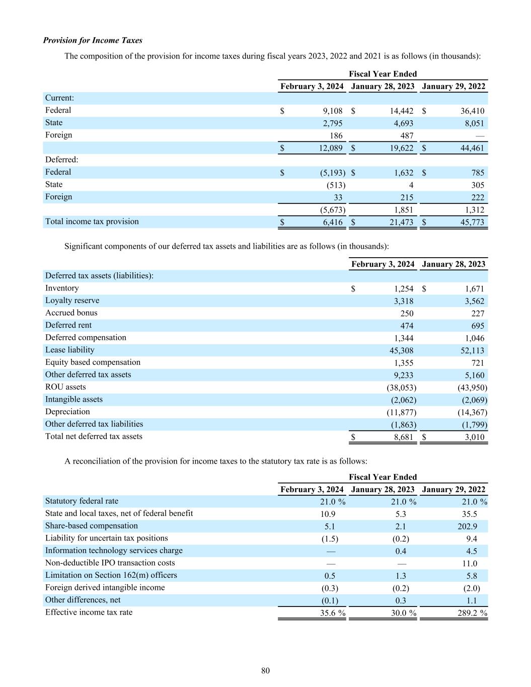 所得税拨备2023、2022和2021财年所得税拨备构成如下(单位:千):截至2024年2月3日的财年2023年1月28日1月29日,2022当前:联邦9,108美元14,442美元36,410州2,7954,6938,051外国186487 — 12,089美元19,622美元44,461递延:联邦(5,193)1,632美元785州(513)4305外国33215222(5,673)1,8511,312所得税准备金总额6,416美元21,473美元45,773我们的递延所得税资产和负债的重要组成部分如下(单位:千):2024年2月3日1月28日,2023递延所得税资产(负债):存货$ 1,254 $ 1,671忠诚度准备金3,3183,562应计奖金250227递延租金474695递延补偿1,3441,046租赁负债45,30852,113股权补偿1,355721其他递延所得税资产9,2335,160 ROU资产(38,053)(43,950)无形资产(2,062)(2,069)折旧(11,877)(14,367)其他递延所得税负债(1,863)(1,799)递延所得税资产净额合计$ 8,681 $ 3,010所得税拨备与法定税率的对账如下:截至2024年2月3日的财政年度2023年1月28日1月29日,2022年法定联邦税率21.0% 21.0% 21.0%州和地方税,扣除联邦福利10.95.3 35.5股份补偿5.1 2.1202.9不确定税务状况的责任(1.5)(0.2)9.4信息技术服务费用— 0.4 4.5不可扣除的IPO交易成本—— 11.0对第162(m)节官员的限制0.5 1.35.8外国衍生的无形收入(0.3)(0.2)(2.0)其他差异,净额(0.1)0.3 1.1实际所得税率35.6% 30.0% 289.2% 80