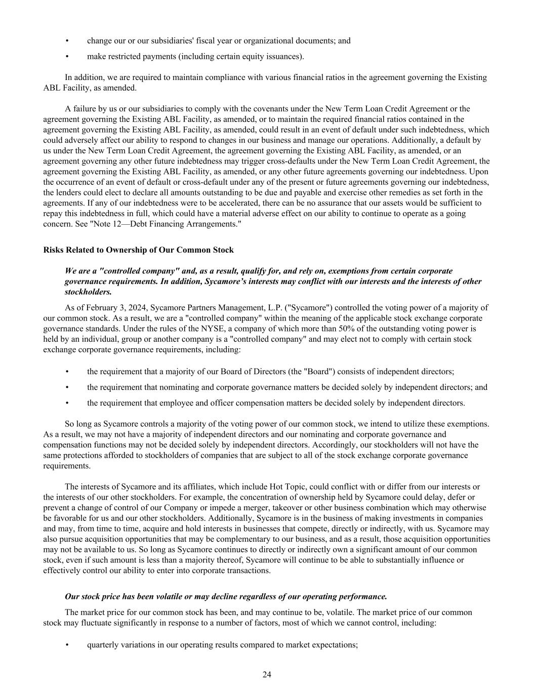 •更改我们或我们子公司的财政年度或组织文件;•进行限制性付款(包括某些股票发行)。此外,我们被要求保持遵守经修订的现有ABL融资协议中的各种财务比率。如果我们或我们的子公司未能遵守经修订的新定期贷款信贷协议或管理现有ABL融资的协议项下的契诺,或未能维持经修订的管理现有ABL融资的协议所载的规定财务比率,则可能导致此类债务下的违约事件,这可能会对我们应对业务变化和管理我们的运营的能力产生不利影响。此外,我们在新定期贷款信贷协议、经修订的管理现有ABL融资的协议或管理任何其他未来债务的协议下的违约可能会触发新定期贷款信贷协议、经修订的管理现有ABL融资的协议或管理我们债务的任何其他未来协议下的交叉违约。一旦根据管辖我们债务的任何当前或未来协议发生违约或交叉违约事件,贷方可以选择宣布所有未偿金额到期应付,并行使协议中规定的其他补救措施。如果我们的任何债务被加速偿还,无法保证我们的资产将足以全额偿还这笔债务,这可能对我们持续经营的能力产生重大不利影响。见“附注12 ——债务融资安排”。与我们普通股所有权相关的风险我们是一家“受控公司”,因此有资格并依赖于某些公司治理要求的豁免。此外,Sycamore的利益可能与我们的利益和其他股东的利益发生冲突。截至2024年2月3日,Sycamore Partners Management,L.P.(“Sycamore”)控制了我国大部分普通股的投票权。因此,我们是适用的证券交易所公司治理标准所指的“受控公司”。根据纽交所规则,超过50%的未行使投票权由个人、集团或其他公司持有的公司是“受控公司”,可以选择不遵守某些证券交易所公司治理要求,包括:•要求我们的董事会(“董事会”)的大多数成员由独立董事组成;•要求提名和公司治理事项完全由独立董事决定;•要求员工和高级职员薪酬事项完全由独立董事决定。只要Sycamore控制了我们普通股的多数投票权,我们就打算利用这些豁免。因此,我们可能没有独立董事的多数席位,我们的提名和公司治理及薪酬职能可能不会完全由独立董事决定。因此,我们的股东将不享有对受所有证券交易所公司治理要求约束的公司的股东提供的相同保护。Sycamore及其关联公司的利益,其中包括Hot Topic,可能与我们的利益或我们其他股东的利益发生冲突或不同。例如,Sycamore持有的所有权集中可能会延迟、推迟或阻止我们公司的控制权变更,或阻碍合并、收购或其他业务合并,否则可能对我们和我们的其他股东有利。此外,Sycamore从事对公司进行投资的业务,并可能不时收购并持有与我们直接或间接竞争的业务的权益。Sycamore也可能寻求可能与我们的业务互补的收购机会,因此,我们可能无法获得这些收购机会。只要Sycamore继续直接或间接拥有大量我们的普通股,即使该数量少于其大多数,Sycamore将继续能够对我们进行公司交易的能力产生重大影响或有效控制。无论我们的经营业绩如何,我们的股价一直在波动或可能下滑。我们普通股的市场价格一直而且可能继续波动。我们普通股的市场价格可能会因应一些我们无法控制的因素而大幅波动,其中包括:•与市场预期相比,我们的经营业绩出现季度差异;24