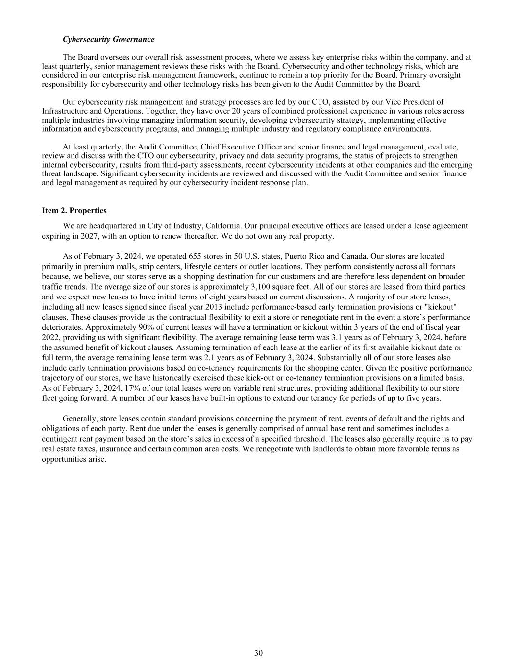 网络安全治理董事会监督我们的整体风险评估过程,我们在其中评估公司内部的关键企业风险,高级管理层至少每季度与董事会一起审查这些风险。我们的企业风险管理框架中考虑的网络安全和其他技术风险仍然是董事会的首要任务。网络安全和其他技术风险的主要监督责任已由董事会赋予审计委员会。我们的网络安全风险管理和战略流程由我们的CTO领导,并由我们的基础设施和运营副总裁提供协助。他们共同拥有超过20年的综合专业经验,在多个行业担任各种角色,涉及管理信息安全、制定网络安全战略、实施有效的信息和网络安全计划,以及管理多个行业和监管合规环境。至少每季度,审计委员会、首席执行官以及高级财务和法律管理层,评估、审查并与CTO讨论我们的网络安全、隐私和数据安全计划、加强内部网络安全的项目状态、第三方评估的结果、其他公司最近发生的网络安全事件以及新出现的威胁格局。根据我们的网络安全事件应对计划的要求,对重大网络安全事件与审计委员会以及高级财务和法律管理人员进行审查和讨论。项目2。物业我们的总部设在加利福尼亚州工业城。我们的主要行政办公室是根据2027年到期的租赁协议租用的,此后可以选择续签。我们不拥有任何不动产。截至2024年2月3日,我们在美国50个州、波多黎各和加拿大经营655家门店。我们的门店主要位于高级购物中心、地带中心、生活方式中心或奥特莱斯位置。它们在所有业态中的表现都始终如一,因为我们认为,我们的商店是我们顾客的购物目的地,因此较少依赖更广泛的流量趋势。我们门店的平均面积约为3100平方英尺。我们所有的门店都是从第三方租赁的,根据目前的讨论,我们预计新租约的初始期限为八年。我们的大部分门店租约,包括自2013财年以来签署的所有新租约,都包含基于绩效的提前终止条款或“踢出”条款。这些条款为我们提供了在门店业绩恶化时退出门店或重新协商租金的合同灵活性。目前约90%的租约将在2022财年结束后的3年内终止或启动,这为我们提供了显着的灵活性。截至2024年2月3日,在假设收益启动条款之前,平均剩余租期为3.1年。假设每项租约在其第一个可用启动日期或整个租期中较早者终止,截至2024年2月3日,平均剩余租期为2.1年。基本上我们所有的门店租约还包括基于购物中心合租要求的提前终止条款。鉴于我们门店的积极业绩轨迹,我们历来在有限的基础上行使这些启动或共同租赁终止条款。截至2024年2月3日,我们总租约的17%采用可变租金结构,为我们未来的门店车队提供了额外的灵活性。我们的许多租约都有内置选项,可将我们的租期延长至多五年。通常,门店租约包含有关支付租金、违约事件和各方权利义务的标准条款。根据租约到期的租金通常由年度基本租金组成,有时包括基于商店销售额超过指定阈值的或有租金付款。租约一般还要求我们缴纳房地产税、保险和一定的公共区域费用。我们与房东重新谈判,以便在机会出现时获得更优惠的条件。30