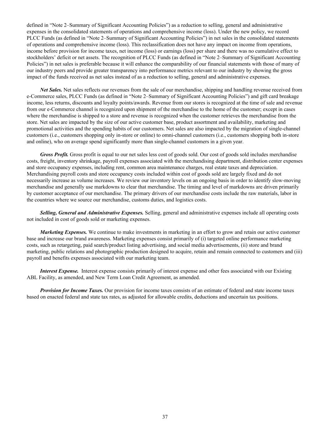 在“附注2 –重要会计政策摘要”)中定义为在综合经营报表和综合收益(亏损)中减少销售、一般和管理费用。根据新政策,我们将PLCC基金(定义见“附注2 –重要会计政策摘要”)计入综合经营和综合收益(亏损)报表的净销售额。这一重新分类对经营收入、所得税拨备前收入、每股净收益(亏损)或收益(亏损)没有任何影响,对股东赤字或净资产也没有累积影响。在净销售额中确认PLCC基金(定义见“附注2 –重要会计政策摘要”)更为可取,因为这将增强我们的财务报表与许多行业同行的财务报表的可比性,并通过将收到的资金的总影响显示为净销售额而不是作为销售、一般和管理费用的减少,为与我们行业相关的业绩指标提供更大的透明度。净销售额。净销售额反映了我们的商品销售收入、从电子商务销售收到的运输和装卸收入、PLCC基金(定义见“附注2 –重要会计政策摘要”)和礼品卡破损收入,减去退货、折扣和忠诚度积分/奖励。来自我们门店的收入在销售时确认,来自我们电子商务渠道的收入在商品运至客户家中时确认;除非商品运至门店且收入在客户从门店取回商品时确认。净销售额受到我们活跃客户群的规模、产品分类和可用性、营销和促销活动以及客户消费习惯的影响。净销售额还受到单一渠道客户(即仅在店内或线上购物的客户)向全渠道客户(即同时在店内和线上购物的客户)迁移的影响,这些客户在特定年份的平均支出明显高于单一渠道客户。毛利。毛利等于我们的净销售额减去销售商品的成本。我们销售商品的成本包括商品成本、运费、库存缩水、与商品销售部门相关的工资支出、配送中心费用和商店占用费用,包括租金、公共区域维护费、房地产税和折旧。包含在已售商品成本中的商品销售工资成本和商店占用成本在很大程度上是固定的,并不一定会随着销量的增加而增加。我们会持续审查我们的库存水平,以识别滞销商品,并通常使用降价来清除该商品。降价的时间和水平主要取决于客户对我们商品的接受程度。我们商品成本的主要驱动因素包括原材料、我们采购商品的国家的劳动力、关税和物流成本。销售、一般和行政费用。销售、一般和管理费用包括不包括在已售商品成本或营销费用中的所有运营成本。营销费用。我们继续在营销方面进行投资,以努力扩大和保留我们活跃的客户群,并提高我们的品牌知名度。营销费用主要包括(i)有针对性的在线绩效营销成本,例如重定向、付费搜索/产品列表广告和社交媒体广告,(ii)旨在获取、保留和保持与客户联系的商店和品牌营销、公共关系和照片制作,以及(iii)与我们的营销团队相关的工资和福利费用。利息费用。利息支出主要包括与经修订的我们现有ABL融资和经修订的新定期贷款信贷协议相关的利息支出和其他费用。所得税拨备。我们的所得税准备金包括根据已颁布的联邦和州税率对联邦和州所得税的估计,并根据允许的抵免额、扣除额和不确定的税收状况进行调整。37