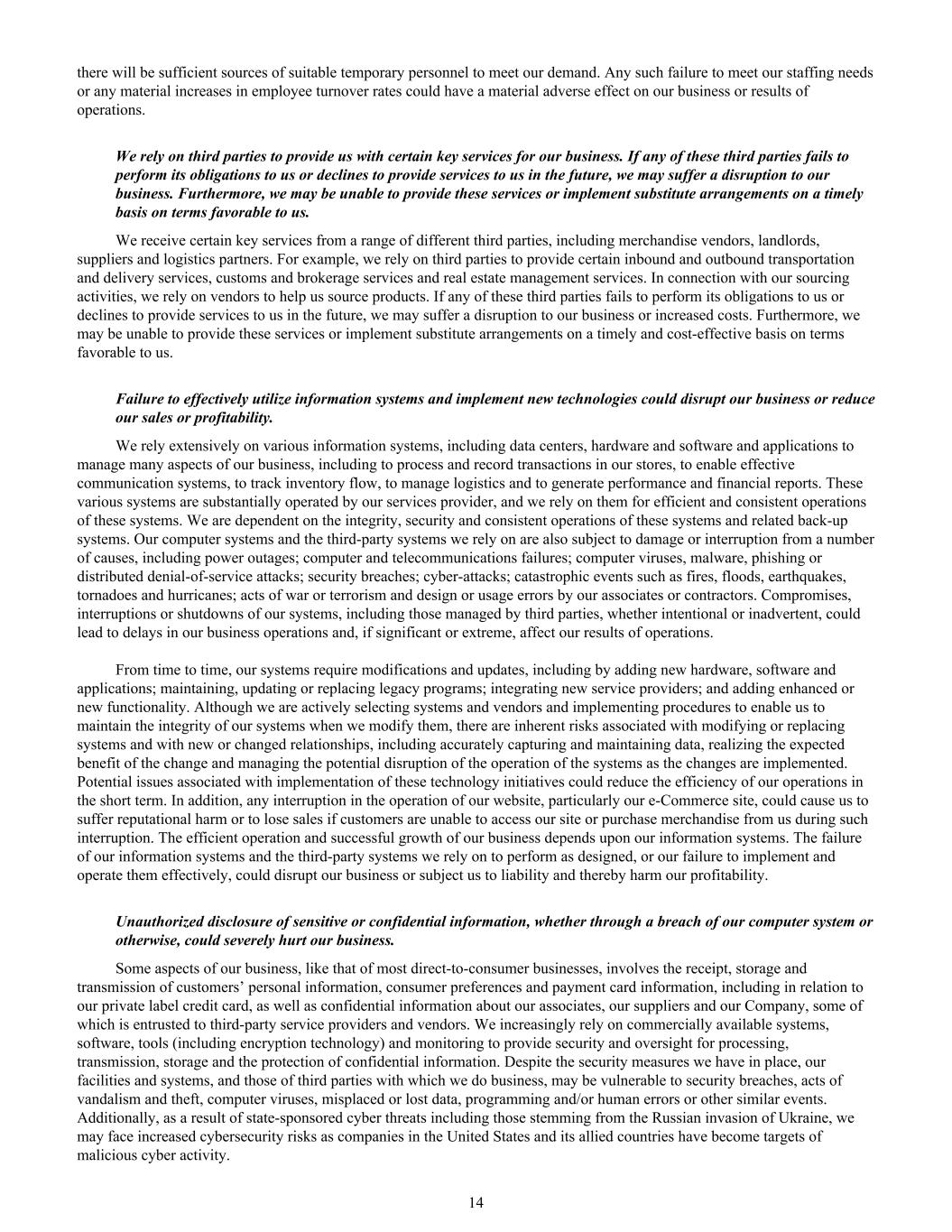 将有足够的合适临时人员来源来满足我们的需求。任何此类未能满足我们的人员配置需求或员工流失率的任何实质性增加都可能对我们的业务或经营业绩产生重大不利影响。我们依赖第三方为我们的业务提供某些关键服务。如果这些第三方中的任何一方未能履行其对我们的义务或拒绝在未来向我们提供服务,我们的业务可能会受到干扰。此外,我们可能无法根据对我们有利的条款及时提供这些服务或实施替代安排。我们从一系列不同的第三方获得某些关键服务,包括商品供应商、房东、供应商和物流合作伙伴。例如,我们依赖第三方提供一定的出入境运输和交付服务,海关和经纪服务以及房地产管理服务。关于我们的采购活动,我们依靠供应商帮助我们采购产品。如果这些第三方中的任何一方未能履行其对我们的义务或拒绝在未来向我们提供服务,我们可能会遭受业务中断或成本增加。此外,我们可能无法以对我们有利的条款及时提供这些服务或实施具有成本效益的替代安排。未能有效利用信息系统和实施新技术可能会扰乱我们的业务或降低我们的销售额或盈利能力。我们广泛依赖各种信息系统,包括数据中心、硬件和软件以及应用程序来管理我们业务的许多方面,包括处理和记录我们门店的交易、启用有效的通信系统、跟踪库存流动、管理物流以及生成业绩和财务报告。这些不同的系统基本上由我们的服务提供商运营,我们依赖它们来高效和一致地运营这些系统。我们依赖于这些系统和相关备份系统的完整性、安全性和一致操作。我们的计算机系统和我们所依赖的第三方系统也受到多种原因的损坏或中断,包括停电;计算机和电信故障;计算机病毒、恶意软件、网络钓鱼或分布式拒绝服务攻击;安全漏洞;网络攻击;火灾、洪水、地震、龙卷风和飓风等灾难性事件;战争或恐怖主义行为以及我们的员工或承包商的设计或使用错误。我们系统的妥协、中断或关闭,包括由第三方管理的系统,无论是有意还是无意的,都可能导致我们业务运营的延迟,如果出现重大或极端情况,则会影响我们的运营结果。我们的系统不时需要修改和更新,包括增加新的硬件、软件和应用程序;维护、更新或替换遗留程序;整合新的服务提供商;以及增加增强或新的功能。尽管我们正在积极选择系统和供应商并实施程序,以使我们能够在修改系统时保持系统的完整性,但与修改或更换系统以及新的或变更的关系相关的固有风险,包括准确捕获和维护数据、实现变更的预期收益以及在实施变更时管理系统运营的潜在中断。与实施这些技术举措相关的潜在问题可能会在短期内降低我们的运营效率。此外,如果客户在此类中断期间无法访问我们的网站或从我们这里购买商品,我们的网站,特别是我们的电子商务网站的任何运营中断都可能导致我们遭受声誉损害或销售损失。我们业务的高效运营和成功增长,有赖于我们的信息系统。我们的信息系统和我们所依赖的第三方系统未能按设计执行,或我们未能有效实施和运营它们,可能会扰乱我们的业务或使我们承担责任,从而损害我们的盈利能力。未经授权泄露敏感或机密信息,无论是通过破坏我们的计算机系统还是其他方式,都可能严重损害我们的业务。我们业务的某些方面,与大多数直接面向消费者的业务一样,涉及接收、存储和传输客户的个人信息、消费者偏好和支付卡信息,包括与我们的自有品牌信用卡有关的信息,以及关于我们的联营公司、我们的供应商和我们公司的机密信息, 其中一些委托给第三方服务提供商和供应商。我们越来越依赖商业上可用的系统、软件、工具(包括加密技术)和监控,为处理、传输、存储和保护机密信息提供安全和监督。尽管我们采取了安全措施,但我们的设施和系统,以及与我们有业务往来的第三方的设施和系统,可能容易受到安全漏洞、破坏和盗窃行为、计算机病毒、放错地方或丢失数据、编程和/或人为错误或其他类似事件的影响。此外,由于国家支持的网络威胁,包括源自俄罗斯入侵乌克兰的网络威胁,我们可能面临更大的网络安全风险,因为美国及其盟国的公司已成为恶意网络活动的目标。14