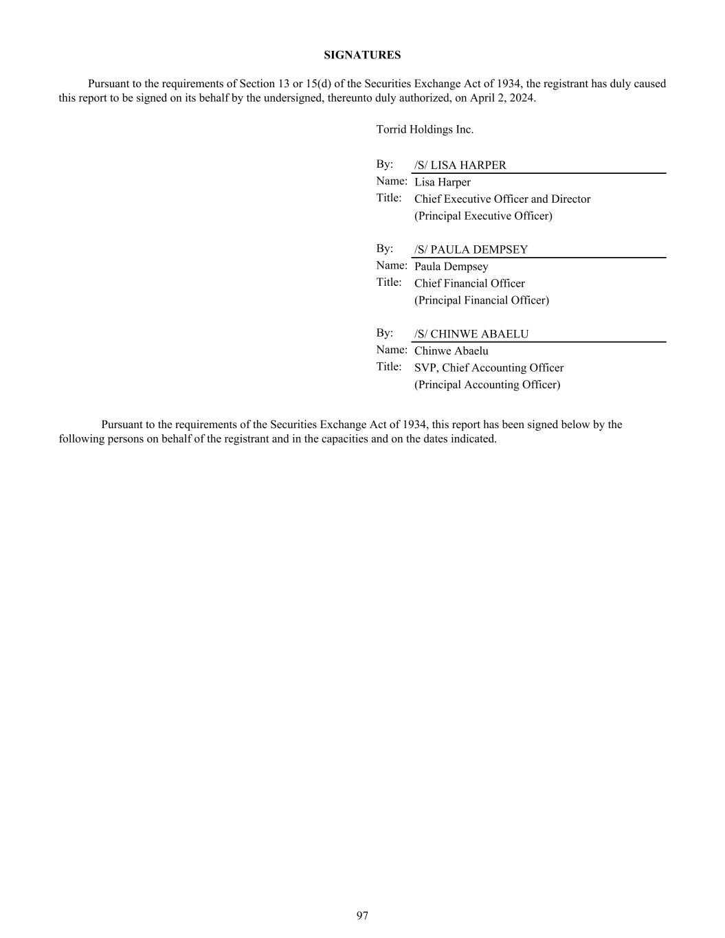 签名根据1934年《证券交易法》第13或15(d)节的要求,注册人已正式安排由以下签署人代表其于2024年4月2日签署本报告,并因此获得正式授权。Torrid Holdings Inc. by:/s/lisa harper姓名:Lisa Harper职务:首席执行官兼董事(首席执行官)by:/s/paula dempsey姓名:Paula dempsey职务:首席财务官(首席财务官)by:/s/CHINWE ABAELU姓名:chinwe abaelu职务:SVP、首席财务官(首席会计官)根据1934年《证券交易法》的要求,本报告已由以下人员代表注册人并以所示身份和日期签署如下。97