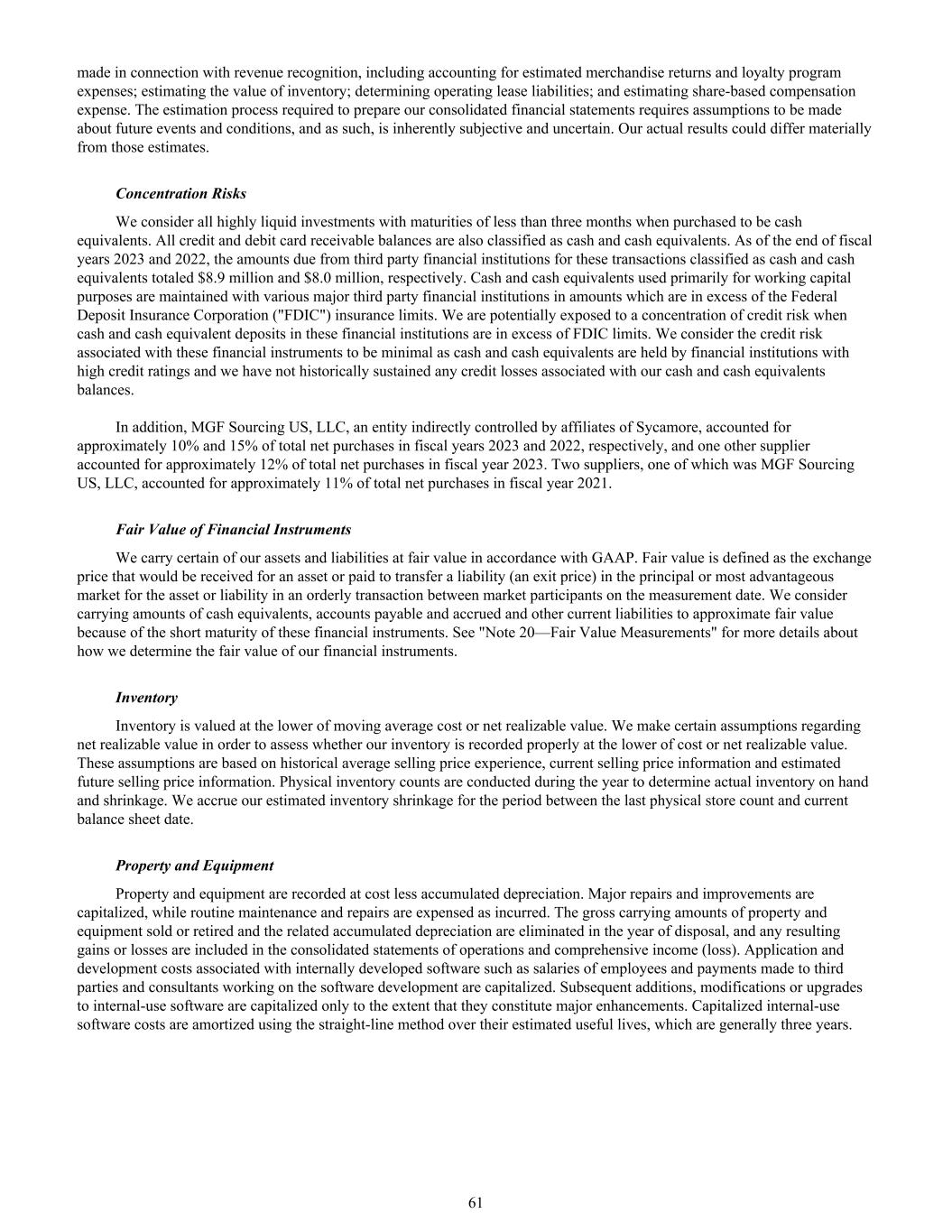 与收入确认有关,包括对估计的商品退货和忠诚计划费用进行会计处理;估计存货价值;确定经营租赁负债;以及估计以股份为基础的补偿费用。编制我们的合并财务报表所需的估计过程要求对未来事件和情况作出假设,因此,本质上是主观的和不确定的。我们的实际结果可能与这些估计存在重大差异。集中风险我们认为购买时所有期限在三个月以下的高流动性投资都是现金等价物。所有信用卡和借记卡应收账款余额也被归类为现金和现金等价物。截至2023和2022财年末,这些归类为现金和现金等价物的交易应收第三方金融机构款项总额分别为890万美元和800万美元。主要用于营运资金用途的现金和现金等价物以超过联邦存款保险公司(“FDIC”)保险限额的金额存放在各主要第三方金融机构。当这些金融机构的现金和现金等价物存款超过FDIC限额时,我们可能会面临集中的信用风险。我们认为与这些金融工具相关的信用风险很小,因为现金和现金等价物由信用评级较高的金融机构持有,而且我们历来没有遭受与我们的现金和现金等价物余额相关的任何信用损失。此外,Sycamore关联公司间接控制的实体MGF Sourcing US,LLC分别占2023财年和2022财年净采购总额的约10%和15%,另有一家供应商占2023财年净采购总额的约12%。两家供应商,其中一家是MGF Sourcing US,LLC,占2021财年净采购总额的约11%。金融工具的公允价值我们根据公认会计原则以公允价值计量我们的某些资产和负债。公允价值定义为在计量日市场参与者之间的有序交易中,资产或负债在主要或最有利的市场上将收到或支付的转移负债的交换价格(退出价格)。我们认为现金等价物、应付账款和应计及其他流动负债的账面金额接近公允价值,因为这些金融工具的期限较短。有关我们如何确定金融工具公允价值的更多详细信息,请参见“附注20 —公允价值计量”。存货存货按移动平均成本与可变现净值孰低进行估值。我们对可变现净值作出某些假设,以评估我们的存货是否按成本或可变现净值中的较低者正确入账。这些假设是基于历史平均售价经验、当前售价信息和预计未来售价信息。实物库存盘点在年内进行,以确定实际库存在手和收缩。我们对上一次实体店统计和当前资产负债表日期之间的期间进行了估计的库存收缩。物业及设备物业及设备按成本减累计折旧入账。重大维修和改进资本化,而日常维护和维修则在发生时计入费用。出售或报废的物业及设备的账面毛额及相关的累计折旧在处置年度予以抵销,由此产生的任何收益或亏损均计入综合经营报表及综合收益(亏损)。与内部开发软件相关的应用程序和开发成本,例如雇员的工资以及支付给从事软件开发工作的第三方和顾问的款项被资本化。内部使用软件的后续添加、修改或升级仅在构成重大增强的范围内资本化。资本化的内部使用软件成本在其预计可使用年限内采用直线法摊销,一般为三年。61