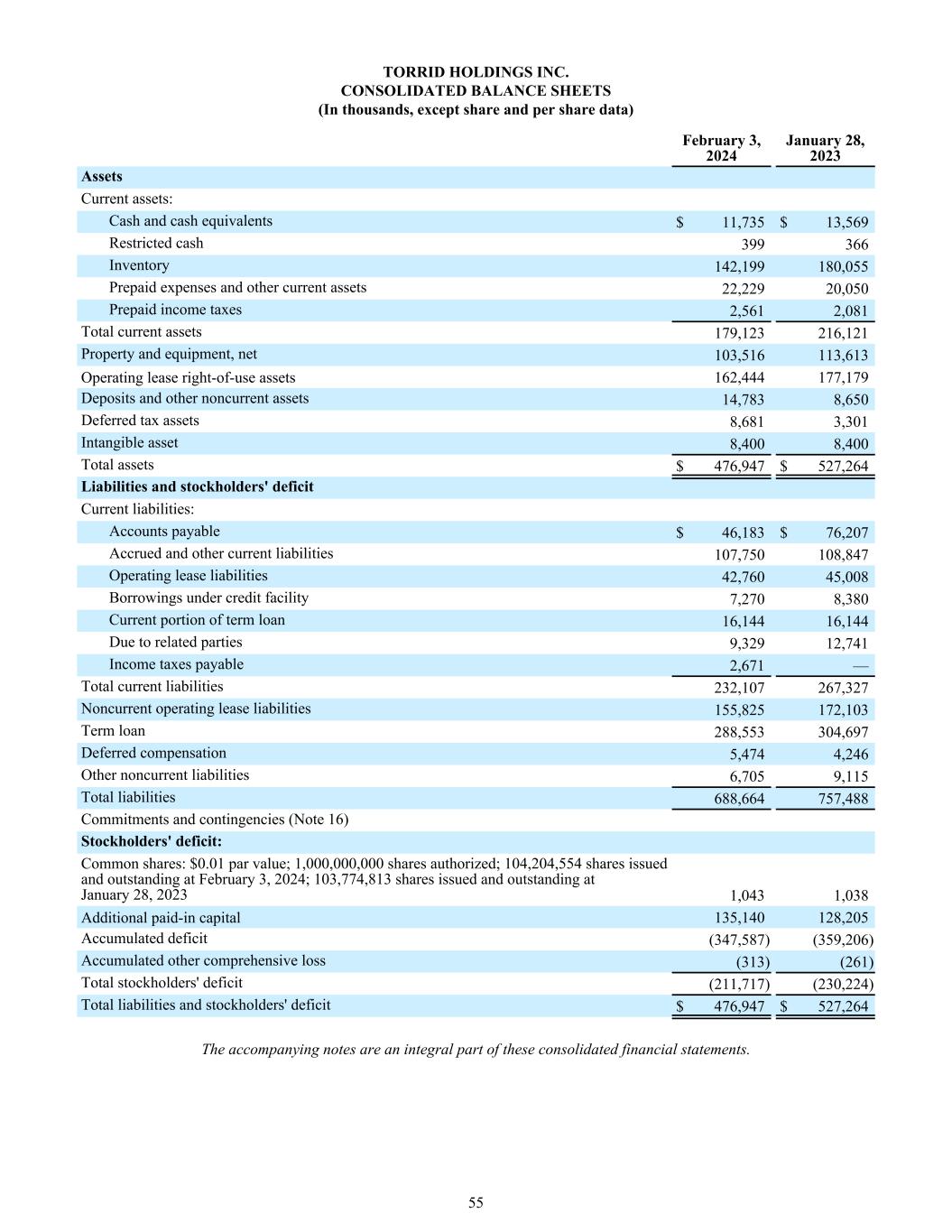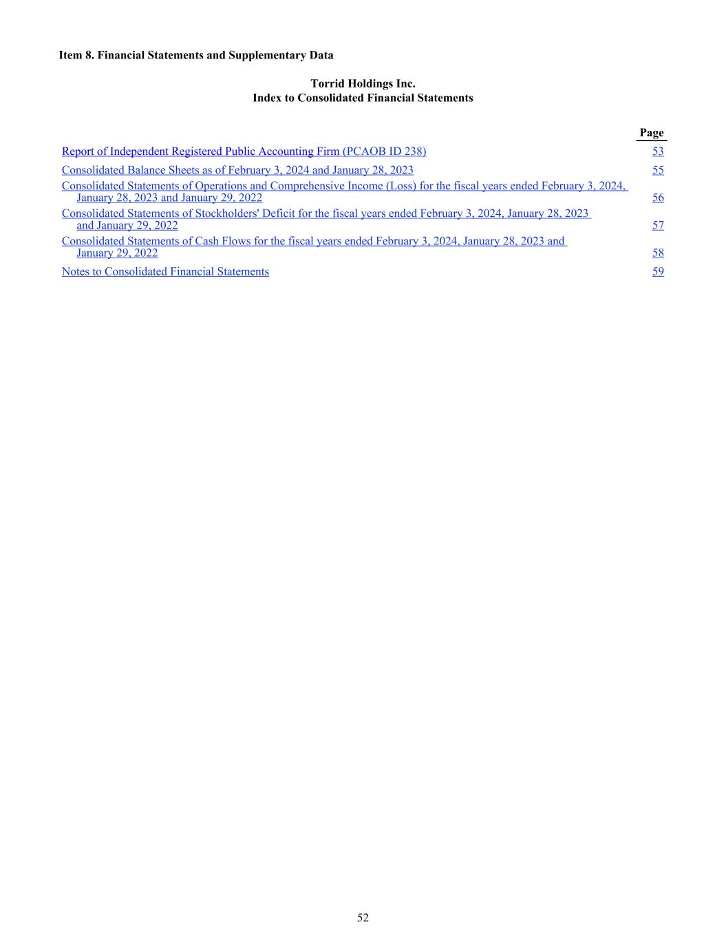 项目8。财务报表和补充数据Torrid Holdings Inc.指数到合并财务报表的页数报告(PCAOB ID 238)53截至2024年2月3日和2023年1月28日的合并资产负债表55截至2024年2月3日、2023年1月28日和2022年1月29日的财政年度的合并经营报表和综合收益(亏损)56截至2024年2月3日、2023年1月28日和2022年1月29日的财政年度的合并股东赤字报表57截至2024年2月3日和1月28日的财政年度的合并现金流量表,2023年和2022年1月29日58合并财务报表附注5952
