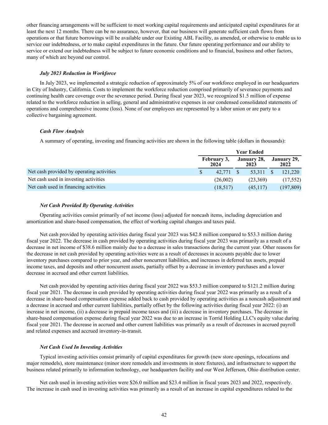 其他融资安排将足以满足营运资金需求和至少未来12个月的预期资本支出。然而,无法保证我们的业务将从运营中产生足够的现金流,或未来的借款将在我们经修订的现有ABL融资下可用,或以其他方式使我们能够偿还债务,或在未来进行资本支出。我们未来的经营业绩以及我们偿还或延长债务的能力将受制于未来的经济状况以及金融、商业和其他因素,其中许多因素是我们无法控制的。2023年7月裁员2023年7月,我们在加州工业城总部实施了约5%的战略裁员。实施裁员的成本主要包括遣散费和遣散期内的持续医疗保险。在2023财年,我们在简明综合运营和综合收益(亏损)报表中确认了与销售、一般和管理费用的劳动力减少相关的150万美元费用。我们的员工都没有工会代表,也没有集体谈判协议的一方。现金流量分析经营、投资和融资活动汇总如下表所示(单位:千美元):截至2024年2月3日止年度2023年1月28日2022年1月29日经营活动提供的现金净额42,771美元53,311美元121,220美元投资活动使用的现金净额(26,002)(23,369)(17,552)筹资活动使用的现金净额(18,517)(45,117)(197,809)经营活动提供的现金净额经营活动主要包括按非现金项目调整的净收入(亏损),包括折旧和摊销以及以股份为基础的薪酬、营运资金变动的影响和支付的税款。2023财年经营活动提供的现金净额为4280万美元,而2022财年为5330万美元。2023财年经营活动提供的现金减少,主要是由于本年度销售交易减少导致净收入减少3860万美元。经营活动提供的现金净额减少的其他原因是,与上一年相比,存货采购减少导致应付账款减少,其他非流动负债,以及递延所得税资产、预付所得税、存款和其他非流动资产增加,但被存货采购减少和应计及其他流动负债减少部分抵消。2022财年经营活动提供的现金净额为5330万美元,而2021财年为1.212亿美元。2022财年经营活动提供的现金减少的主要原因是,作为非现金调整加回经营活动提供的现金的股份补偿费用减少,应计负债和其他流动负债减少,但在2022财年被以下活动部分抵消:(i)净收入增加,(ii)预付所得税减少,以及(iii)库存采购减少。2022财年股权报酬费用的减少是由于Torrid Holding LLC在2021财年的股权价值增加。应计负债和其他流动负债减少的主要原因是应计工资和相关费用以及应计在途库存减少。投资活动中使用的现金净额典型的投资活动主要包括用于增长的资本支出(新店开业、搬迁和重大改造)、商店维护(小型商店改造和对商店固定装置的投资),以及支持主要与信息技术、我们的总部设施和我们的俄亥俄州西杰斐逊配送中心相关的业务的基础设施。2023财年和2022财年用于投资活动的现金净额分别为2600万美元和2340万美元。用于投资活动的现金增加主要是由于与42