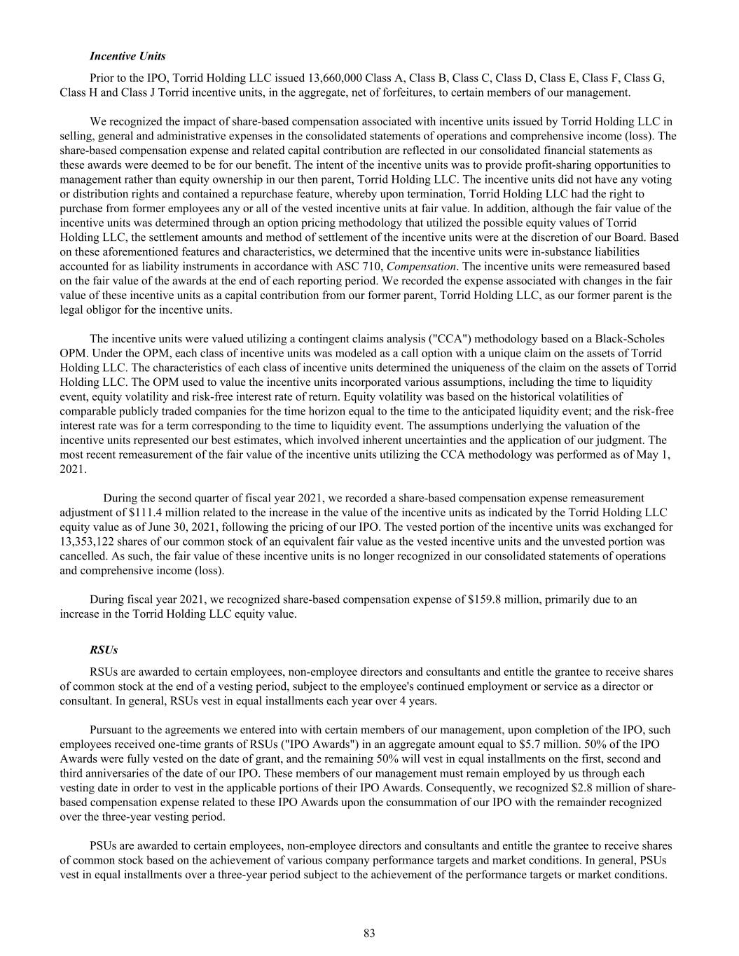 激励单位在IPO之前,Torrid Holding LLC向我们管理层的某些成员发行了总计13,660,000个A类、B类、C类、D类、E类、F类、G类、H类和J类Torrid激励单位,扣除没收后。我们在综合经营报表和综合收益(亏损)中确认了与Torrid Holding LLC在销售、一般和管理费用中发放的激励单位相关的股份补偿的影响。股份补偿费用和相关出资反映在我们的综合财务报表中,因为这些奖励被认为是为了我们的利益。激励单位的意图是向管理层提供利润分享机会,而不是我们当时的母公司Torrid Holding LLC的股权所有权。激励单位没有任何投票权或分配权,并包含回购特征,据此,在终止时,Torrid Holding LLC有权以公允价值向前雇员购买任何或所有已归属的激励单位。此外,虽然激励单位的公允价值是通过利用Torrid Holding LLC可能的股权价值的期权定价方法确定的,但激励单位的结算金额和结算方法由我们的董事会酌情决定。基于前述这些特征和特征,我们按照ASC 710,薪酬确定激励单位为作为负债工具核算的实质负债。根据各报告期末奖励的公允价值对激励单位进行重新计量。我们将与这些激励单位的公允价值变动相关的费用记录为我们的前母公司Torrid Holding LLC的出资,因为我们的前母公司是激励单位的法定义务人。使用基于Black-Scholes OPM的或有索赔分析(“CCA”)方法对激励单位进行估值。在OPM下,每类激励单位被建模为对Torrid Holding LLC的资产具有唯一索取权的看涨期权。每类激励单位的特点决定了Torrid Holding LLC资产债权的独特性。用于对激励单位进行估值的OPM包含了各种假设,包括流动性事件发生的时间、股权波动性和无风险利率收益率。股票波动率是基于可比上市公司在与预期流动性事件发生时间相等的时间范围内的历史波动率;无风险利率是与流动性事件发生时间相对应的期限。激励单位估值背后的假设代表了我们的最佳估计,其中涉及内在的不确定性和我们判断的应用。采用CCA方法对激励单位公允价值进行的最近一次重新计量截至2021年5月1日。在2021财年第二季度,根据我们的IPO定价,我们记录了与截至2021年6月30日的Torrid Holding LLC股权价值所示的激励单位价值增加相关的基于股份的薪酬费用重新计量调整1.114亿美元。将激励单位的已归属部分交换为13,353,122股公允价值等值的普通股,作为已归属激励单位并注销未归属部分。因此,这些激励单位的公允价值不再在我们的综合经营报表和综合收益(亏损)中确认。在2021财年,我们确认了1.598亿美元的股权补偿费用,这主要是由于Torrid Holding LLC股权价值的增加。RSU RSU授予某些雇员、非雇员董事和顾问,并赋予承授人在归属期结束时获得普通股股份的权利,但须视雇员是否继续受雇或担任董事或顾问的情况而定。一般来说,RSU在4年内每年以等额分期付款的方式归属。根据我们与管理层某些成员签订的协议,在完成首次公开募股后,这些员工将获得一次性授予的RSU(“IPO奖励”),总金额相当于570万美元。IPO奖励的50%在授予日全部归属,其余50%将在我们IPO日期的第一、第二和第三个周年纪念日等额分期归属。我们管理层的这些成员必须在每个归属日期继续受雇于我们,以便归属其IPO奖励的适用部分。因此,我们在IPO完成时确认了与这些IPO奖励相关的280万美元的股份补偿费用,其余部分在三年归属期内确认。PSU授予某些员工, 非雇员董事和顾问,并授权承授人根据各种公司业绩目标的实现情况和市场情况获得普通股股份。一般来说,私营部门服务单位在三年期间内根据业绩目标的实现情况或市场条件等额归属。83