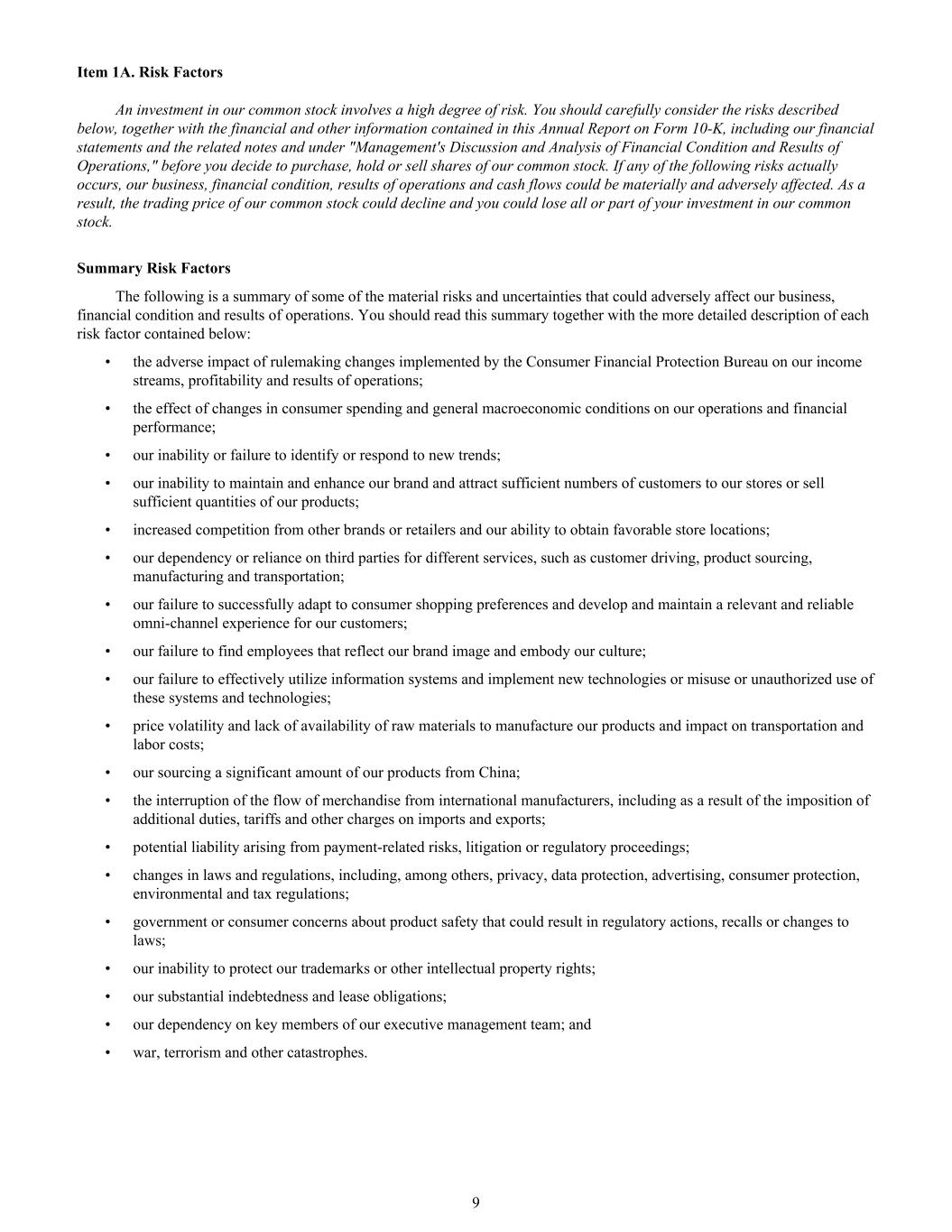 项目1a。风险因素投资我们的普通股涉及高度风险。在您决定购买、持有或出售我们的普通股之前,您应该仔细考虑以下描述的风险,以及本年度报告10-K表格中包含的财务和其他信息,包括我们的财务报表和相关附注以及“管理层对财务状况和经营业绩的讨论和分析”下的信息。如果实际发生以下任何风险,我们的业务、财务状况、经营业绩和现金流量可能会受到重大不利影响。因此,我们普通股的交易价格可能会下降,您可能会损失您对我们普通股的全部或部分投资。风险因素摘要以下是可能对我们的业务、财务状况和经营业绩产生不利影响的一些重大风险和不确定性的摘要。您应该阅读这份摘要以及以下对每个风险因素的更详细描述:•消费者金融保护局实施的规则制定变更对我们的收入流的不利影响,盈利能力和经营业绩;•消费者支出和总体宏观经济状况的变化对我们的经营和财务业绩的影响;•我们无法或未能识别或应对新趋势;•我们无法维持和提升我们的品牌,无法吸引足够数量的顾客到我们的商店或销售足够数量的我们的产品;•来自其他品牌或零售商的竞争加剧,以及我们获得有利的商店位置的能力;•我们在不同服务方面依赖或依赖第三方,例如客户驾驶、产品采购,制造和运输;•我们未能成功适应消费者的购物偏好,并为我们的客户开发和维护相关和可靠的全渠道体验;•我们未能找到员工反映我们的品牌形象并体现我们的文化;•我们未能有效利用信息系统和实施新技术或滥用或未经授权使用这些系统和技术;•价格波动,缺乏制造我们产品的原材料,并影响运输和劳动力成本;•我们从中国采购大量产品;•国际制造商的商品流通中断,包括由于对进出口征收额外关税、关税和其他费用;•支付相关风险产生的潜在责任,诉讼或监管程序;•法律法规的变化,其中包括隐私、数据保护、广告、消费者保护、环境和税收法规;•政府或消费者对产品安全的担忧,可能导致监管行动、召回或法律变更;•我们无法保护我们的商标或其他知识产权;•我们的巨额债务和租赁义务;•我们对执行管理团队关键成员的依赖;以及•战争、恐怖主义和其他灾难。9