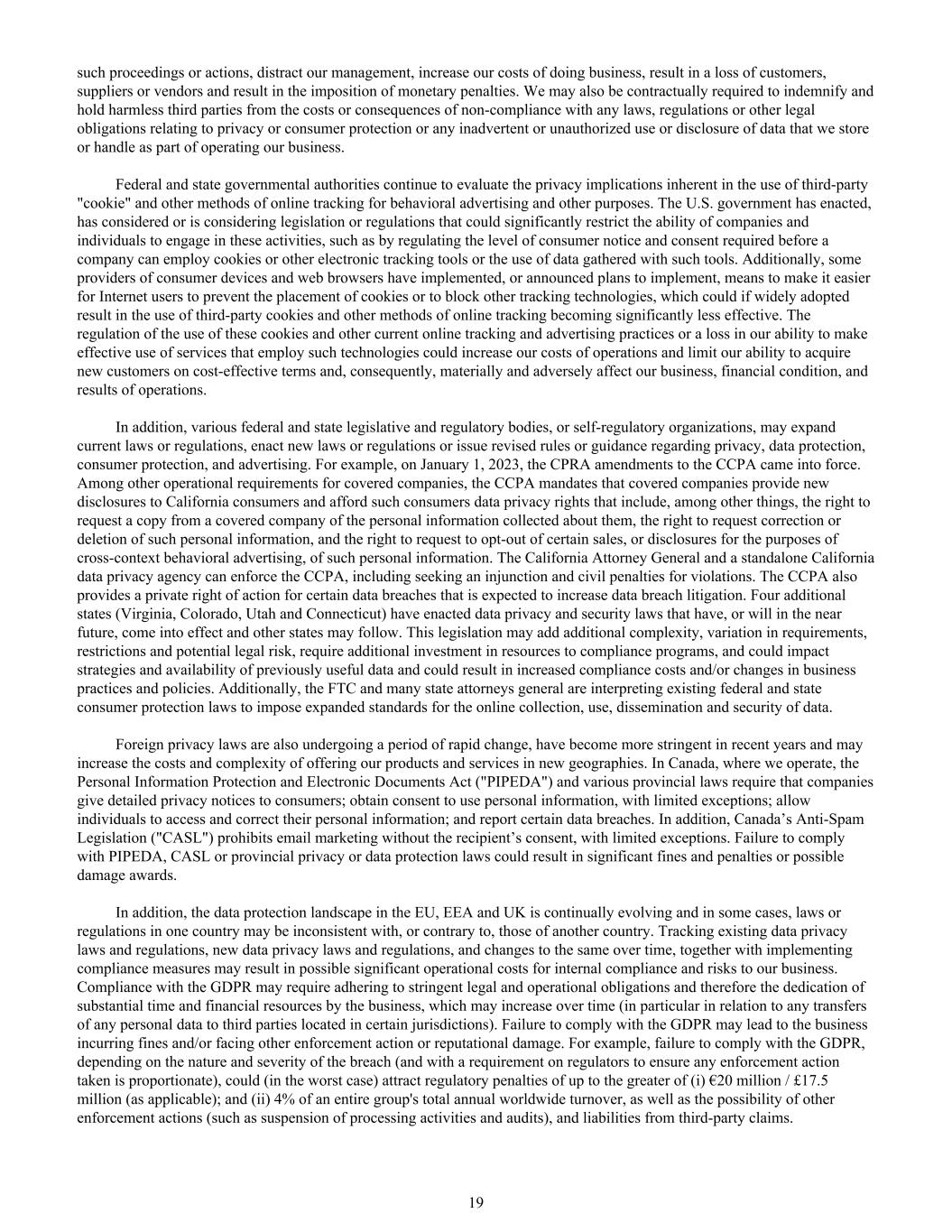 这类诉讼或行动,分散了我们管理层的注意力,增加了我们开展业务的成本,导致客户、供应商或供应商的损失,并导致罚款。我们还可能被合同要求对第三方进行赔偿,并使其免于因不遵守与隐私或消费者保护有关的任何法律、法规或其他法律义务,或因无意或未经授权使用或披露我们作为经营业务的一部分而存储或处理的数据而产生的成本或后果。联邦和州政府当局继续评估使用第三方“cookie”和其他用于行为广告和其他目的的在线追踪方法所固有的隐私影响。美国政府已经颁布、考虑过或正在考虑可能会大幅限制公司和个人从事这些活动的能力的立法或法规,例如通过规范公司使用cookie或其他电子追踪工具或使用此类工具收集的数据之前所需的消费者通知和同意的水平。此外,一些消费设备和网页浏览器提供商已经实施或宣布计划实施的手段,以使互联网用户更容易防止放置cookie或阻止其他跟踪技术,如果广泛采用这些技术,可能会导致使用第三方cookie和其他在线跟踪方法变得明显不那么有效。对这些cookie的使用以及当前其他在线跟踪和广告做法的监管或我们有效利用采用此类技术的服务的能力的丧失可能会增加我们的运营成本,并限制我们以具有成本效益的条款获得新客户的能力,从而对我们的业务、财务状况和运营结果产生重大不利影响。此外,各种联邦和州立法和监管机构,或自律组织,可能会扩大现行法律或法规,颁布新的法律或法规或发布有关隐私、数据保护、消费者保护和广告的修订规则或指南。例如,2023年1月1日,《全面禁止酷刑公约》的《全面禁止酷刑和其他残忍、不人道或有辱人格的待遇或处罚修正案》生效。在对涵盖公司的其他运营要求中,CCPA规定,涵盖公司向加州消费者提供新的披露,并给予此类消费者数据隐私权,其中包括(其中包括)要求涵盖公司提供所收集的关于他们的个人信息的副本的权利、要求更正或删除此类个人信息的权利,以及要求选择退出此类个人信息的某些销售或出于跨上下文行为广告目的的披露的权利。加州总检察长和独立的加州数据隐私机构可以执行CCPA,包括寻求禁令和对违规行为的民事处罚。CCPA还为某些预计会增加数据泄露诉讼的数据泄露行为提供了私人诉讼权。另外四个州(弗吉尼亚州、科罗拉多州、犹他州和康涅狄格州)已经颁布了数据隐私和安全法,这些法律已经或将在不久的将来生效,其他州可能会效仿。这项立法可能会增加额外的复杂性、要求的差异、限制和潜在的法律风险,需要对合规项目的资源进行额外投资,并可能影响战略和以前有用数据的可用性,并可能导致合规成本增加和/或业务实践和政策发生变化。此外,联邦贸易委员会和许多州检察长正在对现有的联邦和州消费者保护法进行解释,以便对数据的在线收集、使用、传播和安全实施扩大的标准。外国隐私法也在经历一个快速变化的时期,近年来变得更加严格,可能会增加在新的地区提供我们的产品和服务的成本和复杂性。在我们开展业务的加拿大,《个人信息保护和电子文件法》(“PIPEDA”)和各省法律要求公司向消费者提供详细的隐私通知;获得使用个人信息的同意,但有有限的例外情况;允许个人访问和更正其个人信息;并报告某些数据泄露事件。此外,加拿大的反垃圾邮件立法(“CASL”)禁止未经收件人同意的电子邮件营销,只有有限的例外。不遵守PIPEDA、CASL或省级隐私或数据保护法律可能会导致巨额罚款和处罚或可能的损害赔偿。此外,欧盟、欧洲经济区和英国的数据保护格局不断演变,在某些情况下,一国的法律或法规可能与, 或与另一个国家的相反。跟踪现有的数据隐私法律法规、新的数据隐私法律法规,以及随着时间的推移对相同的变化,连同实施合规措施,可能会导致内部合规可能产生巨大的运营成本,并给我们的业务带来风险。遵守GDPR可能需要遵守严格的法律和运营义务,因此需要企业投入大量时间和财政资源,随着时间的推移,这种情况可能会增加(特别是在向位于某些司法管辖区的第三方转移任何个人数据方面)。不遵守GDPR可能导致企业遭受罚款和/或面临其他执法行动或声誉受损。例如,不遵守GDPR,取决于违约的性质和严重程度(并要求监管机构确保所采取的任何执法行动是相称的),(在最坏的情况下)可能会招致监管处罚,最高可达(i)2000万欧元/1750万英镑(如适用)中的较高者;(ii)整个集团全球年度总营业额的4%,以及其他执法行动的可能性(例如暂停处理活动和审计),以及第三方索赔的责任。19