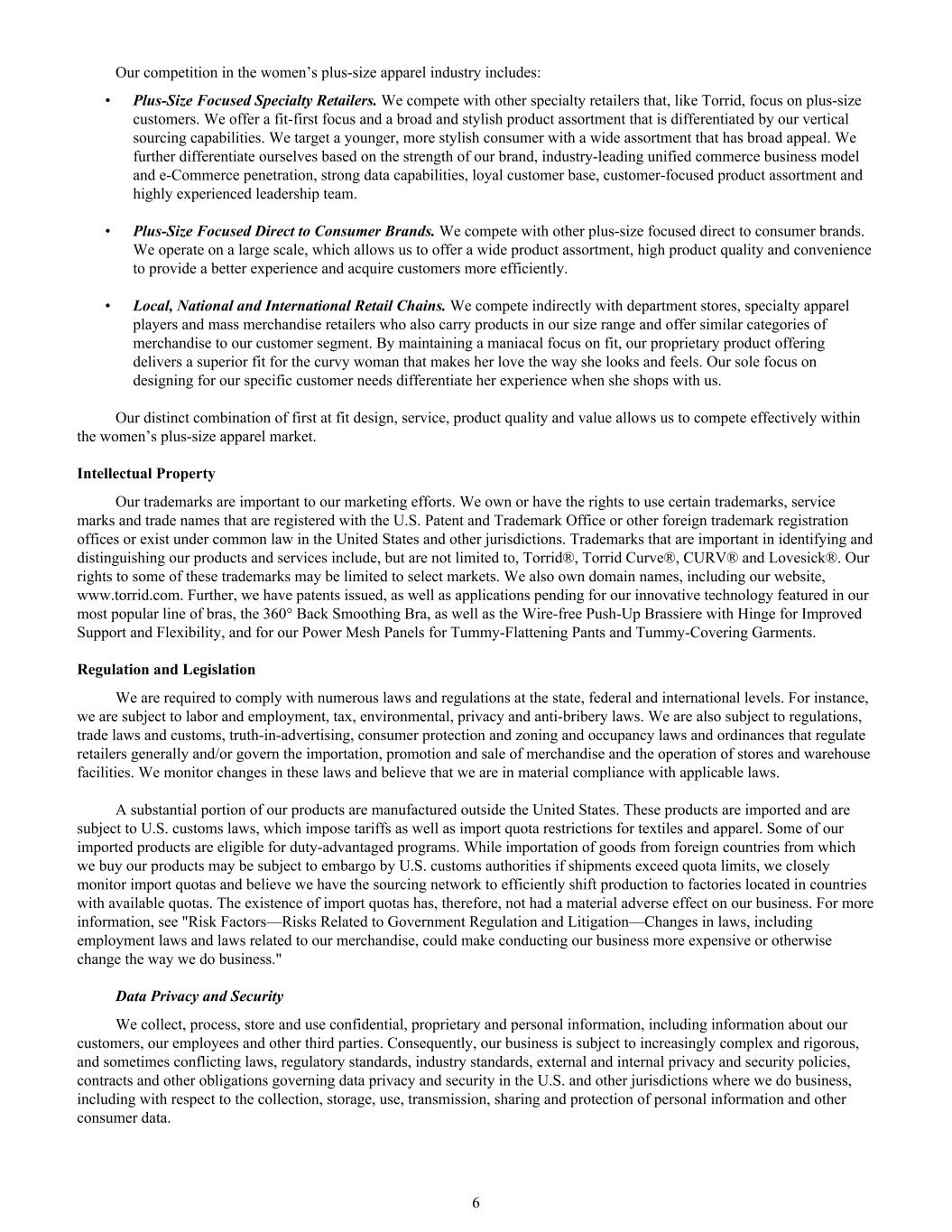 我们在女装大码服装行业的竞争包括:•大码专注的专业零售商。我们与其他专业零售商竞争,这些零售商与Torrid一样,专注于大码客户。我们提供适合自己的重点和广泛而时尚的产品分类,这些分类因我们的垂直采购能力而有所不同。我们的目标是更年轻、更时尚的消费者,他们的产品种类繁多,具有广泛的吸引力。我们基于品牌实力、行业领先的统一商务商业模式和电子商务渗透、强大的数据能力、忠诚的客户基础、以客户为中心的产品分类和经验丰富的领导团队,进一步实现差异化。•大码专注于直接面向消费者品牌。我们与直接面向消费者品牌的其他大码竞争。我们经营规模大,这使我们能够提供广泛的产品种类、高产品质量和便利,以提供更好的体验,更高效地获取客户。•本地、全国和国际零售连锁店。我们与百货公司、专业服装公司和大众商品零售商进行间接竞争,这些公司也销售我们尺寸范围内的产品,并向我们的客户群提供类似类别的商品。通过保持对合身的狂热关注,我们的专有产品为曲线优美的女性提供了一种卓越的合身性,让她喜欢她的外观和感觉。我们唯一专注于为我们的特定客户需求进行设计,这使她在与我们一起购物时的体验与众不同。我们将first at fit设计、服务、产品质量和价值的独特组合,使我们能够在女性大码服装市场内有效竞争。知识产权我们的商标对我们的营销工作很重要。我们拥有或有权使用在美国专利商标局或其他外国商标注册局注册或根据美国和其他司法管辖区的普通法存在的某些商标、服务标记和商品名称。对识别和区分我们的产品和服务具有重要意义的商标包括但不限于Torrid ®、Torrid Curve ®、CURV ®和Lovesick ®。我们对其中一些商标的权利可能仅限于特定市场。我们还拥有域名,包括我们的网站www.torrid.com。此外,我们还发布了专利,以及我们最受欢迎的文胸系列中的创新技术、360 °背部平滑文胸、以及带有铰链的无线俯卧撑文胸,以提高支撑和灵活性,以及我们用于腹部压平裤和腹部覆盖服装的动力网状面板的申请正在申请中。法规和立法我们被要求遵守州、联邦和国际层面的众多法律法规。例如,我们受到劳动和就业、税收、环境、隐私和反贿赂法律的约束。我们亦须遵守规管一般零售商和/或规管商品的进口、推广和销售以及商店和仓库设施的营运的条例、贸易法律和习俗、广告中的真实情况、消费者保护和分区及占用法律和条例。我们监测这些法律的变化,并认为我们在实质上遵守适用的法律。我们的产品有很大一部分是在美国境外生产的。这些产品是进口的,受美国海关法的约束,美国海关法对纺织品和服装征收关税以及进口配额限制。我们的一些进口产品有资格享受关税优惠计划。虽然如果发货超过配额限制,从我们购买产品的外国进口的商品可能会受到美国海关当局的禁运,但我们密切监控进口配额,并相信我们拥有采购网络,可以有效地将生产转移到位于有可用配额的国家的工厂。因此,进口配额的存在并未对我们的业务产生重大不利影响。欲了解更多信息,请参阅“风险因素——与政府监管和诉讼相关的风险——法律的变化,包括就业法和与我们的商品相关的法律,可能会使我们开展业务的成本更高,或者以其他方式改变我们开展业务的方式。”数据隐私和安全我们收集、处理、存储和使用机密、专有和个人信息,包括有关我们的客户、我们的员工和其他第三方的信息。因此,我们的业务在美国和我们开展业务的其他司法管辖区受到越来越复杂和严格、有时相互冲突的法律、监管标准、行业标准、外部和内部隐私和安全政策、合同和其他管理数据隐私和安全的义务的约束,包括在收集、存储、使用、传输、 个人信息和其他消费者数据的共享和保护。6