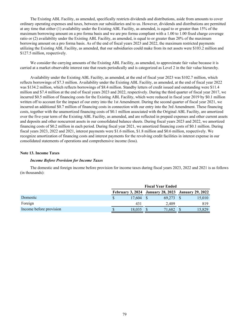 经修订的现有ABL融资特别限制我们的子公司与我们之间的股息和分配,除了支付普通运营费用和税收的金额。然而,在任何时候允许股息和分配,即(1)经修订的现有ABL融资下的可用性等于或大于备考基础上最高借款金额的15%,而我们符合1.00至1.00固定费用覆盖率的备考标准,或(2)经修订的现有ABL融资下的可用性等于或大于备考基础上最高借款金额的20%。截至2023和2022财年末,我们的子公司可以利用经修订的现有ABL融资从其净资产中支付的最高限制性付款分别为1.032亿美元和1.275亿美元。我们认为经修订的现有ABL融资的账面金额接近公允价值,因为它按定期重置的市场可观察利率列账,在公允价值层次结构中被归类为第2级。截至2023财年末,经修订的现有ABL融资下的可用资金为1.027亿美元,反映了730万美元的借款。截至2022财年末,经修订的现有ABL融资下的可用资金为1.342亿美元,反映了840万美元的借款。截至2023和2022财年末,已签发和未结清的备用信用证分别为1140万美元和740万美元。在2017财年第三季度,我们为现有ABL融资产生了50万美元的融资成本,这些成本在2019财年减少了10万美元,以应对我们加入第1修正案的影响。在2021财年第二季度,我们因加入第3修正案而额外承担了70万美元的融资成本。这些融资成本,连同与原始ABL融资相关的未摊销融资成本10万美元,在经修订的现有ABL融资的五年期限内摊销,并在我们的综合资产负债表中反映在预付费用和其他流动资产以及存款和其他非流动资产中。在2023和2022财年,我们在每个期间摊销了0.2百万美元的融资成本。在2021财年,我们摊销了10万美元的融资成本。在2023、2022和2021财年,利息支付分别为160万美元、180万美元和60万美元。我们在综合经营报表和综合收益(亏损)中的利息费用中确认融资成本和循环信贷额度的利息支付的摊销。注13。所得税所得税拨备前收入2023、2022和2021财年所得税拨备前国内和国外收入如下(单位:千):截至2024年2月3日的财政年度2023年1月28日2022年1月29日国内$ 17,604 $ 69,273 $ 15,010国外4312,409819拨备前收入$ 18,035 $ 71,682 $ 15,82979