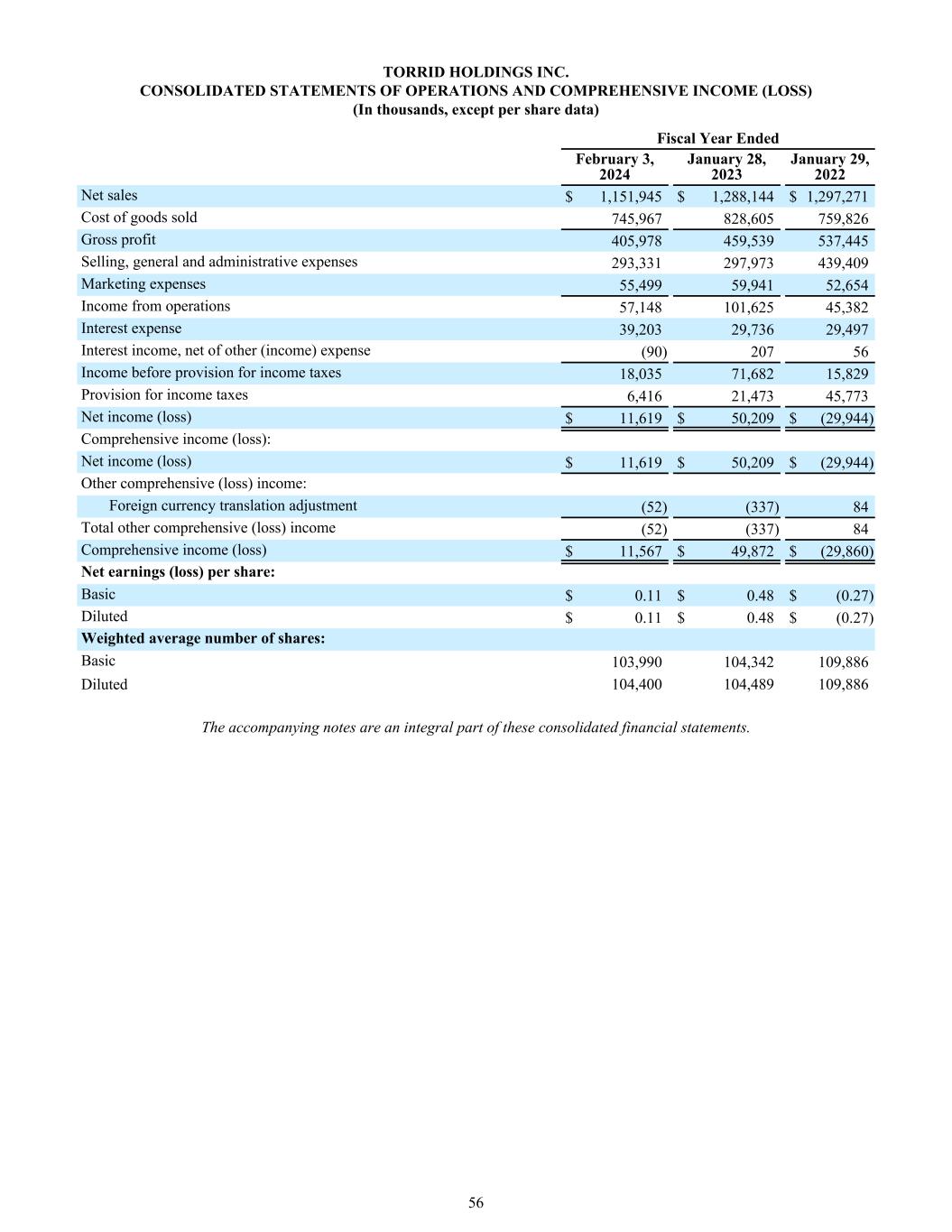 Torrid Holdings Inc.综合经营报表和综合收益(亏损)(以千为单位,每股数据除外)截至2024年2月3日的财政年度2023年1月28日2022年1月29日净销售额1,151,945美元1,288,144美元1,297,271销售成本745,967828,605759,826毛利润405,978459,539537,445销售、一般和管理费用293,331297,973439,409营销费用55,49959,94152,654经营收入57,148101,62545,382利息支出39,20329,73629,497利息收入,其他(收入)费用净额(90)20756所得税拨备前收入18,03571,68215,829备所得税6,41621,47345,773净收益(亏损)11,619美元50,209美元(29,944)综合收益(亏损):净收益(亏损)11,619美元50,209美元(29,944)其他综合(亏损)收益:外币折算调整(52)(337)84其他综合(亏损)收益总额(52)(337)84综合收益(亏损)11,567美元49,872美元(29,860)每股净收益(亏损):基本0.11美元0.48美元(0.27)稀释后0.11美元0.48美元(0.27)加权平均股数:基本103,990104,342109,886稀释后104,400104,489109,886附注是这些综合财务报表的组成部分。56